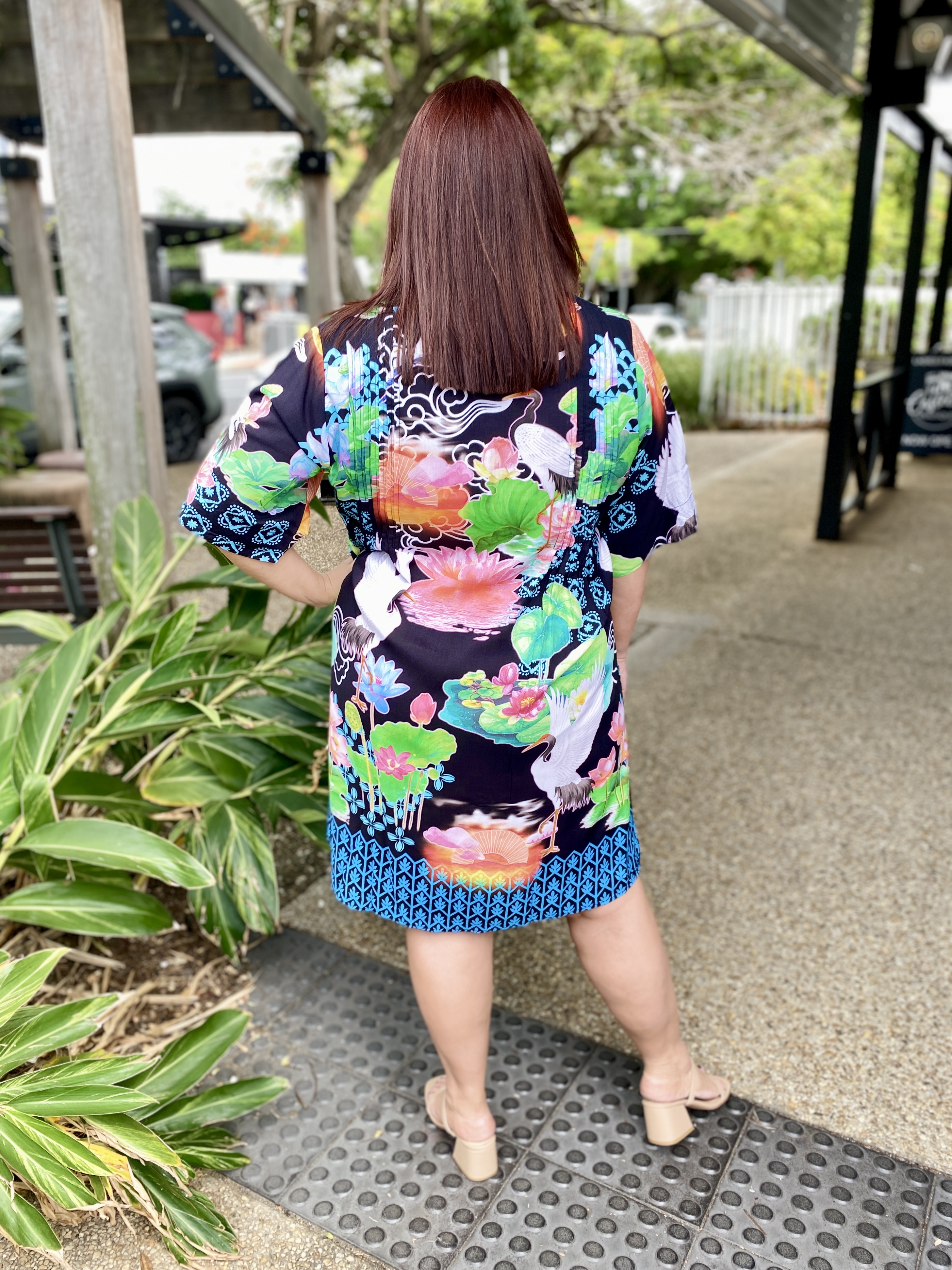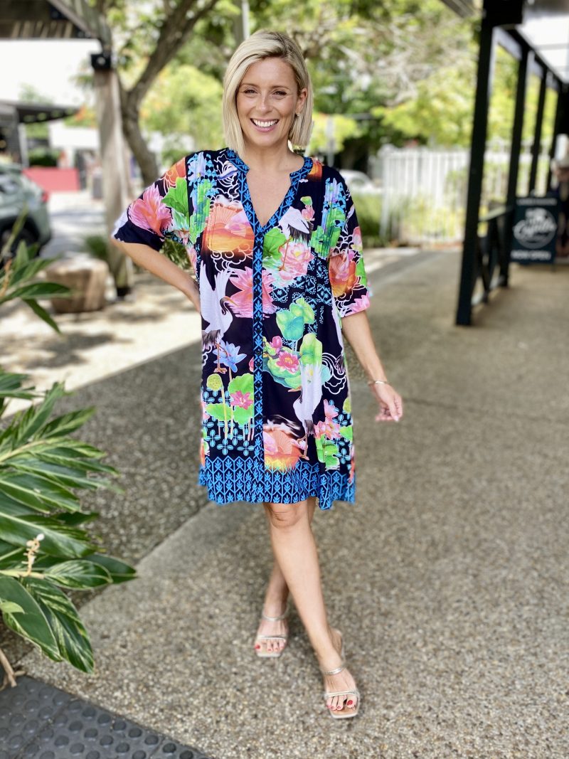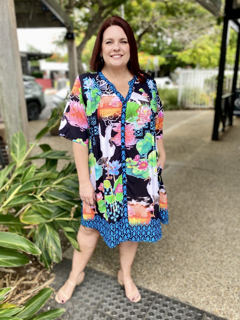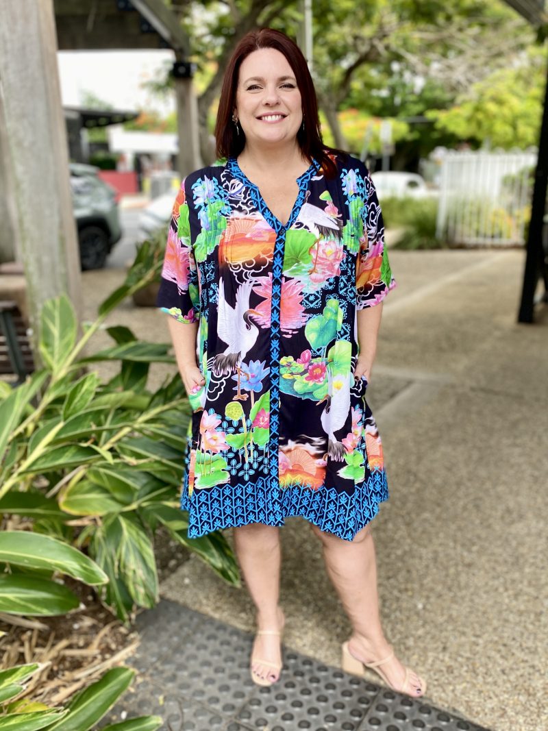 Flowing with effortless charm, the Akiko Button Dress is an easy go-to for colourful, everyday style. Made from 100% viscose, it feels soft, cool, and lightweight—perfect for warm days. The Nauru collar with a V-neck, front tab button-through design, and vertical tucks on the front and back bodice create a relaxed yet polished look. With elbow-length sleeves, practical side pockets, and a soft curved hem, it’s finished in a striking Japanese-inspired digital print that adds a fresh, artistic touch. Proudly designed in Australia, it’s ideal for weekends, outings, or effortless daytime dressing.