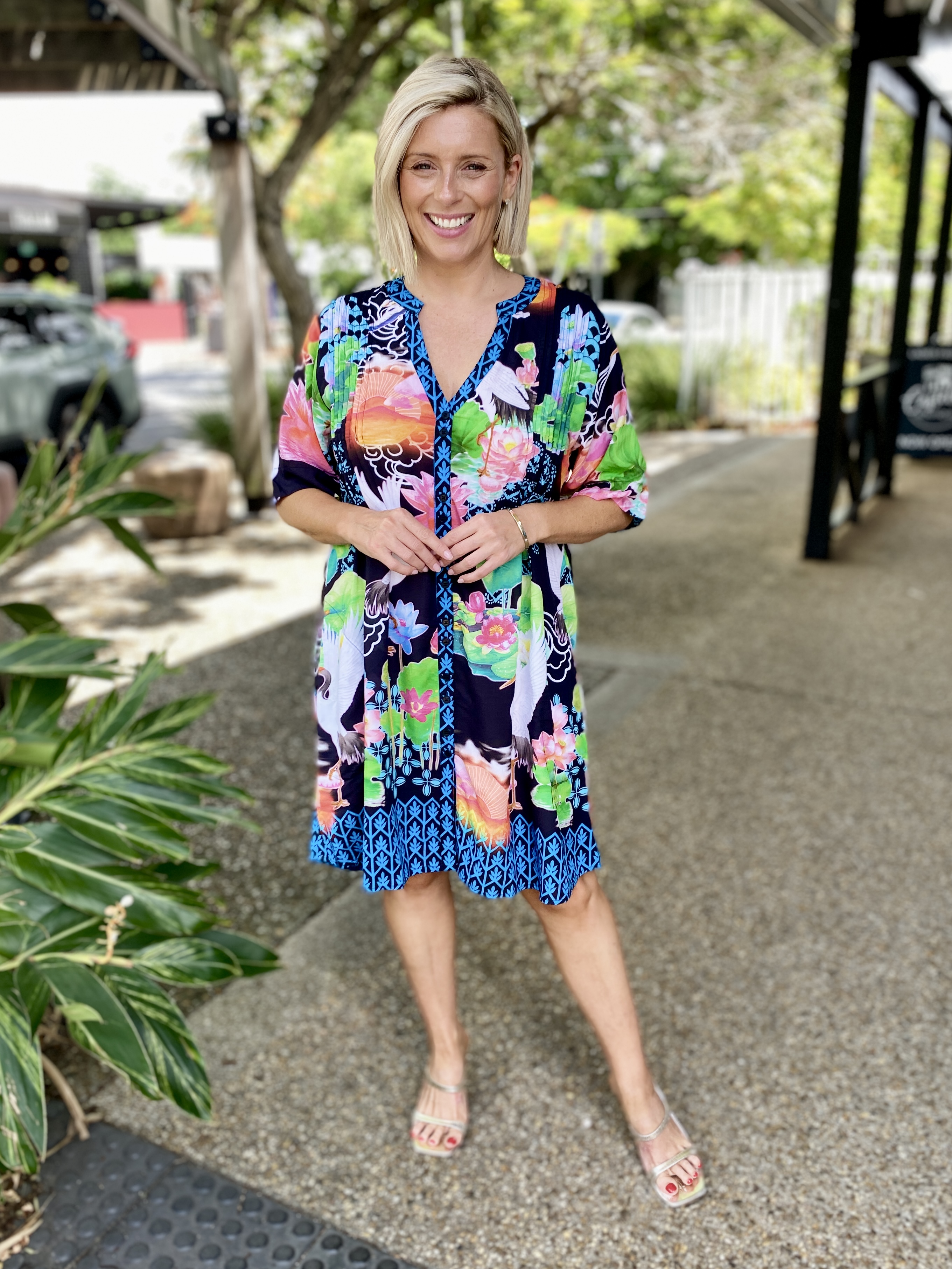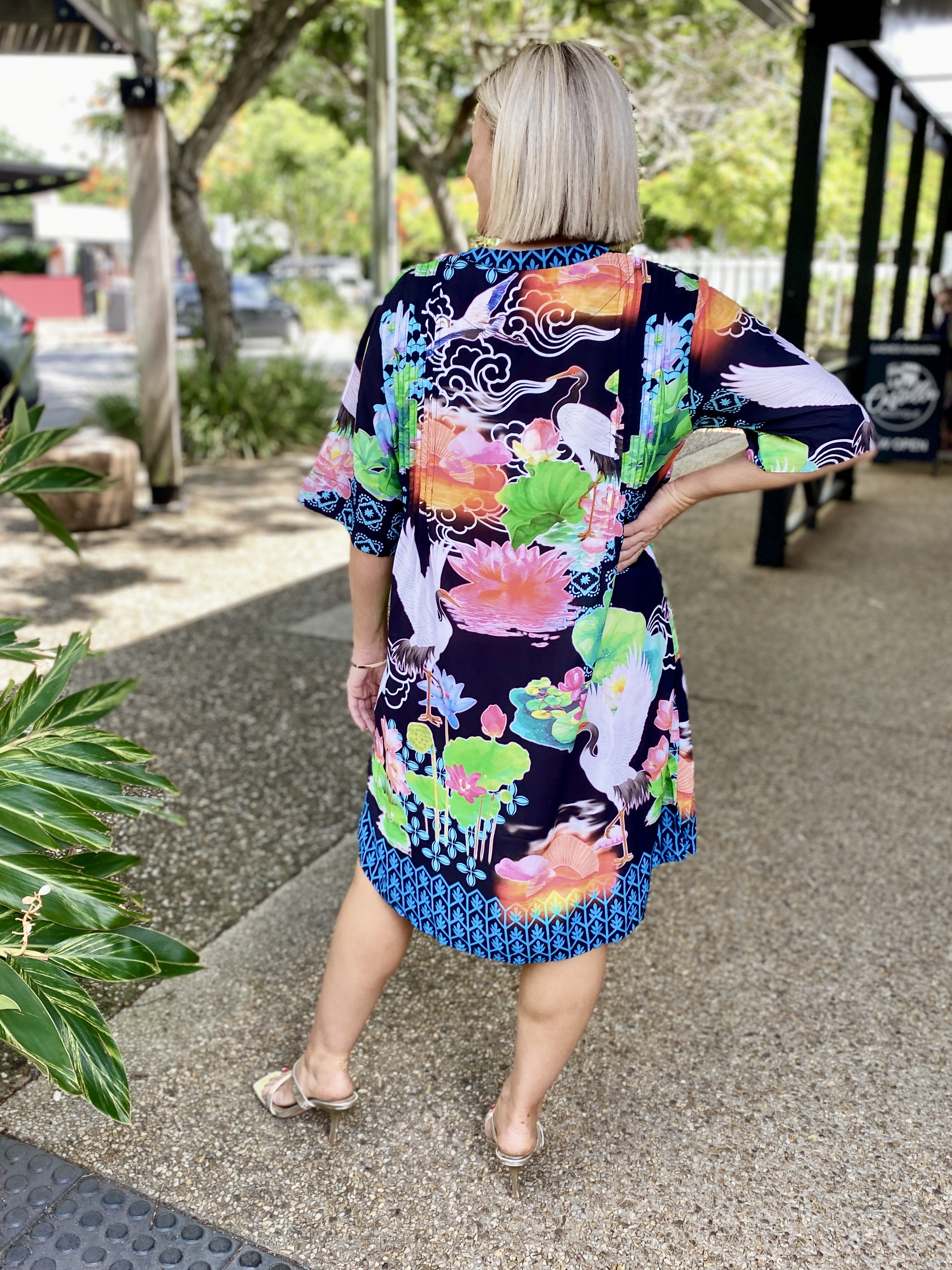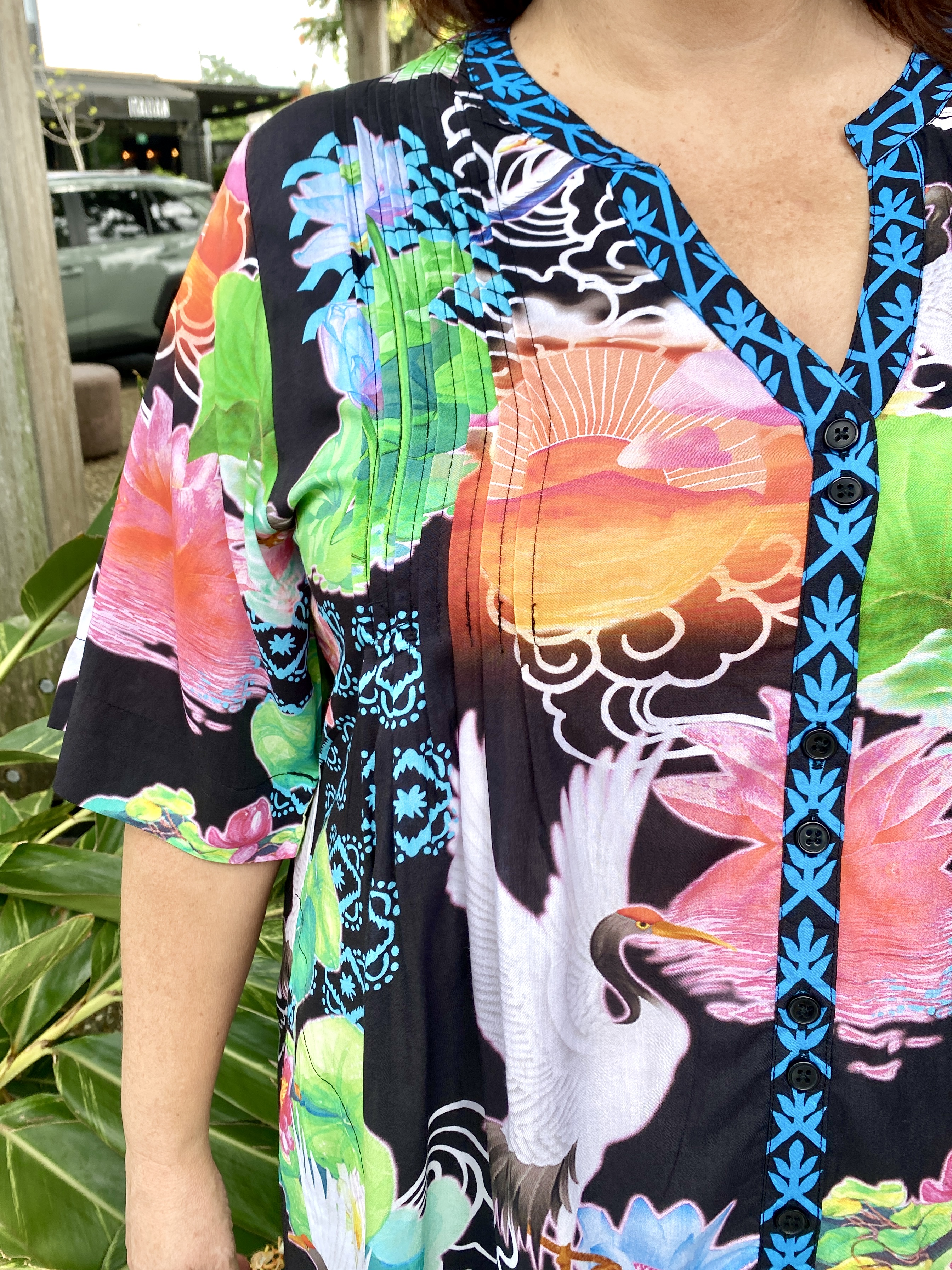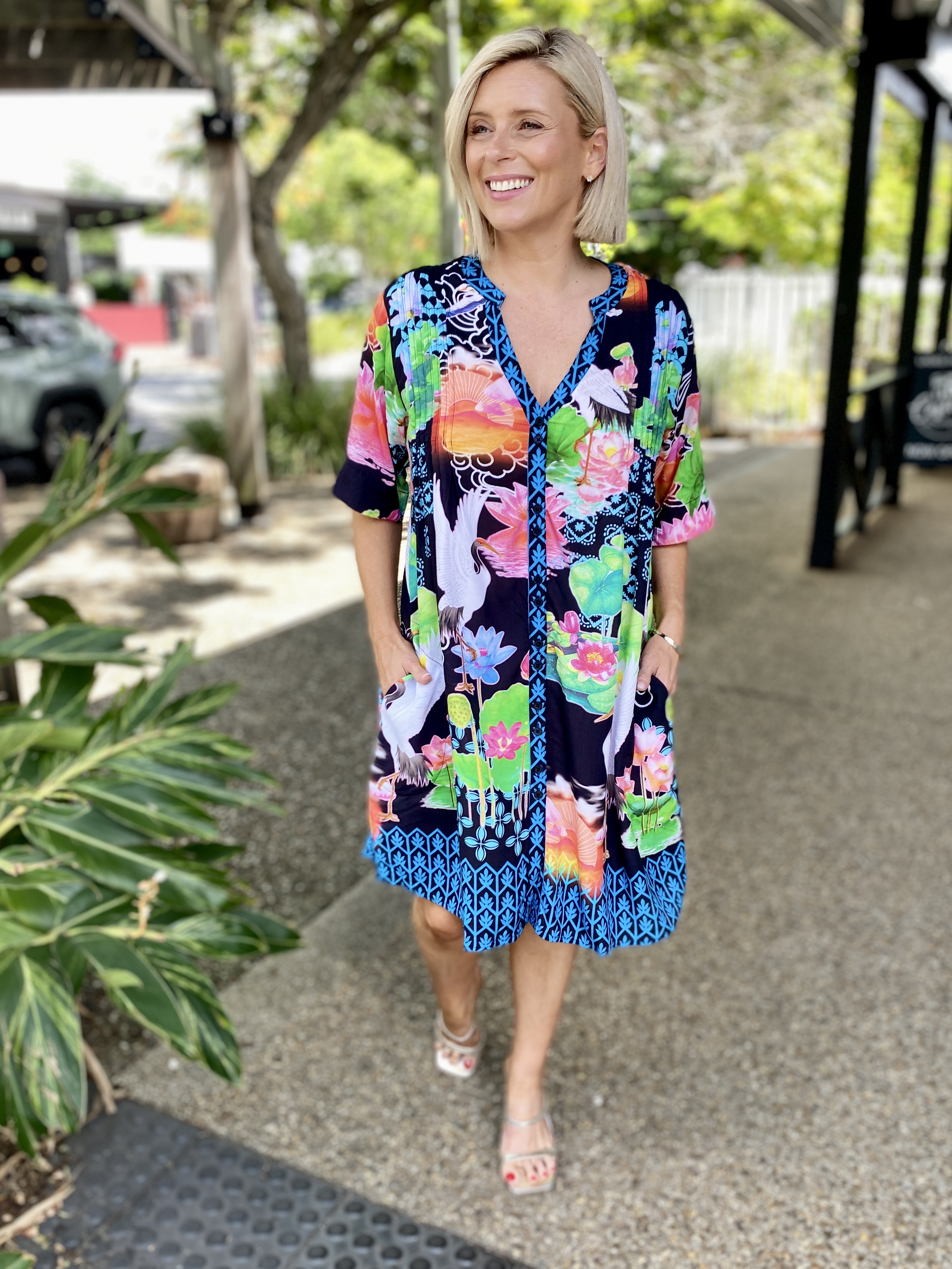Flowing with effortless charm, the Akiko Button Dress is an easy go-to for colourful, everyday style. Made from 100% viscose, it feels soft, cool, and lightweight—perfect for warm days. The Nauru collar with a V-neck, front tab button-through design, and vertical tucks on the front and back bodice create a relaxed yet polished look. With elbow-length sleeves, practical side pockets, and a soft curved hem, it’s finished in a striking Japanese-inspired digital print that adds a fresh, artistic touch. Proudly designed in Australia, it’s ideal for weekends, outings, or effortless daytime dressing.