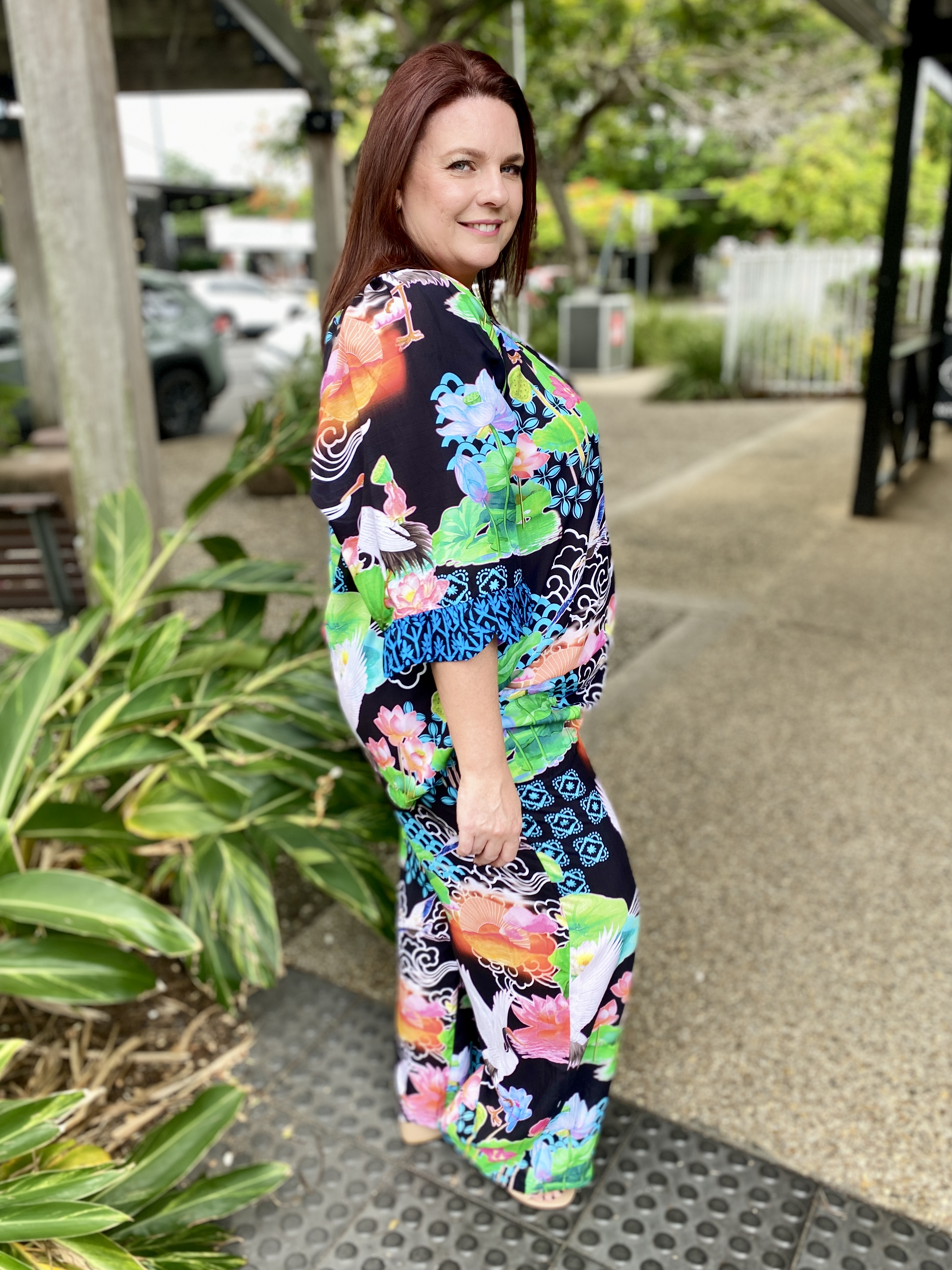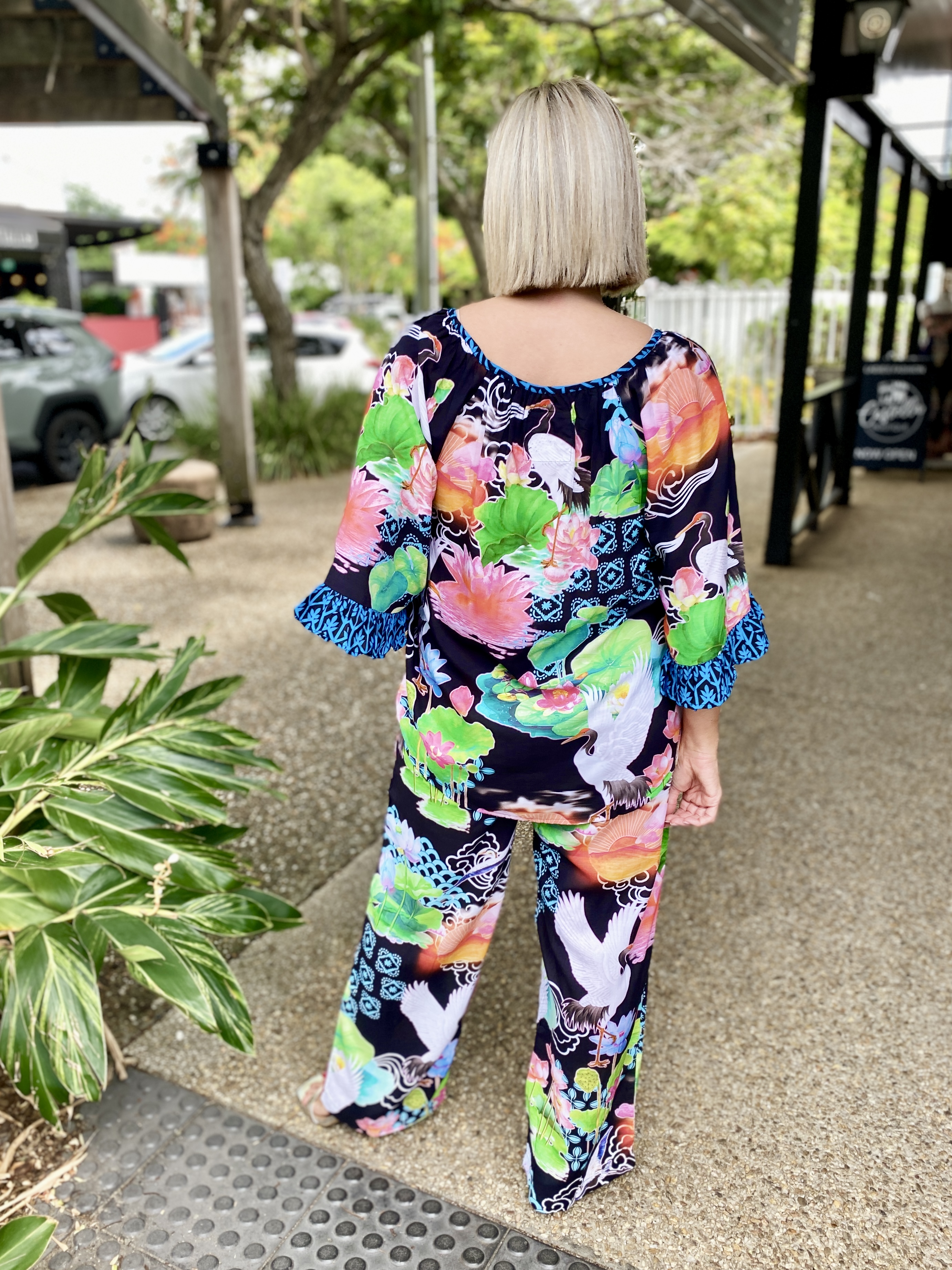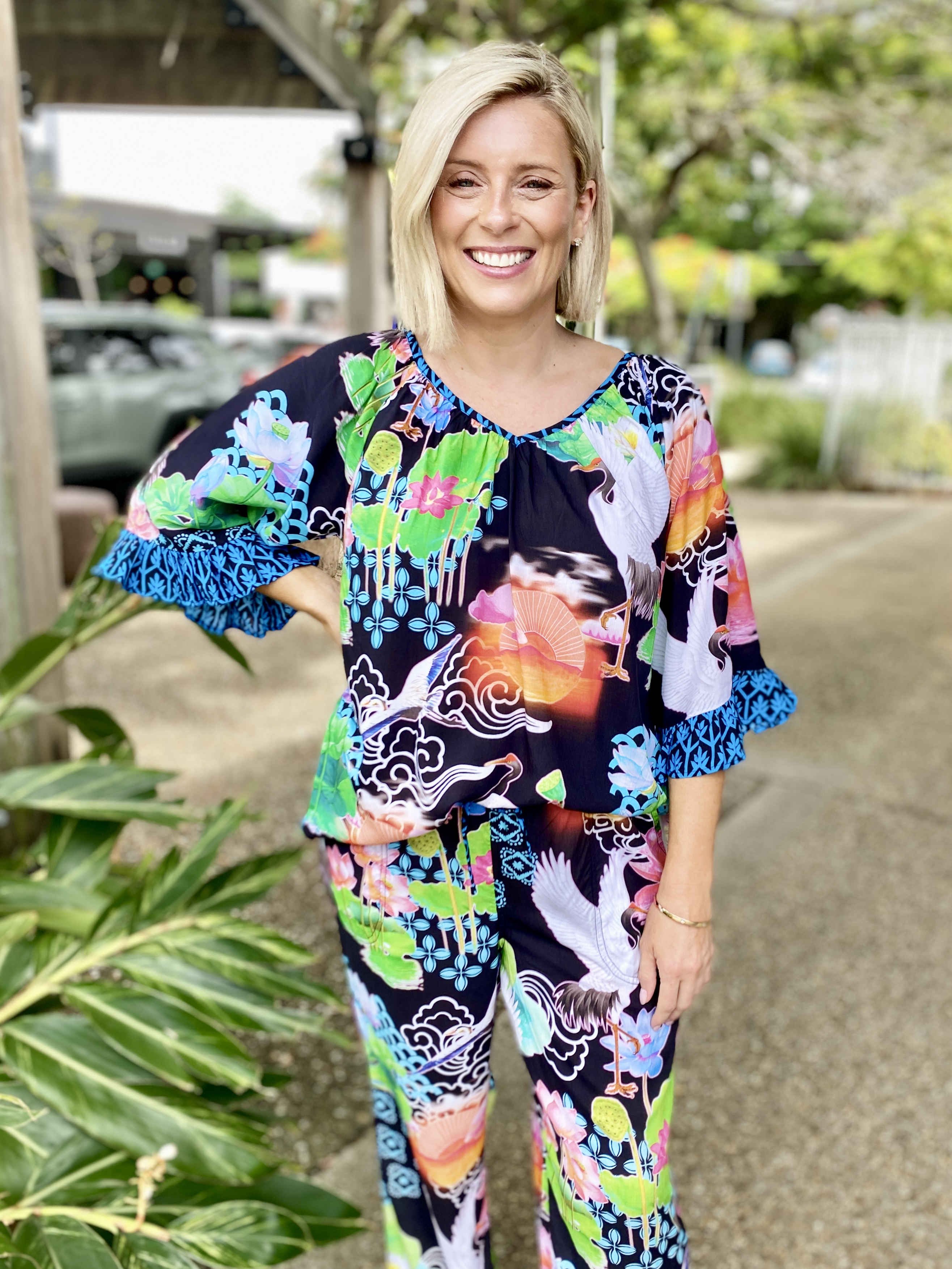 Blending comfort with standout detail, the Akiko Top brings easy, everyday style with a touch of charm. Made from 100% viscose, this relaxed top feels soft and lightweight, perfect for warm days or laid-back outings. The V-neckline, gentle gathers, and wide raglan sleeves with a flounce hem give it a flowy, feminine look. Finished with a curved hem and a Japanese-inspired digital print, this Australian-designed piece pairs effortlessly with denim, linen, or your favourite summer pants for a bold yet easy vibe.
