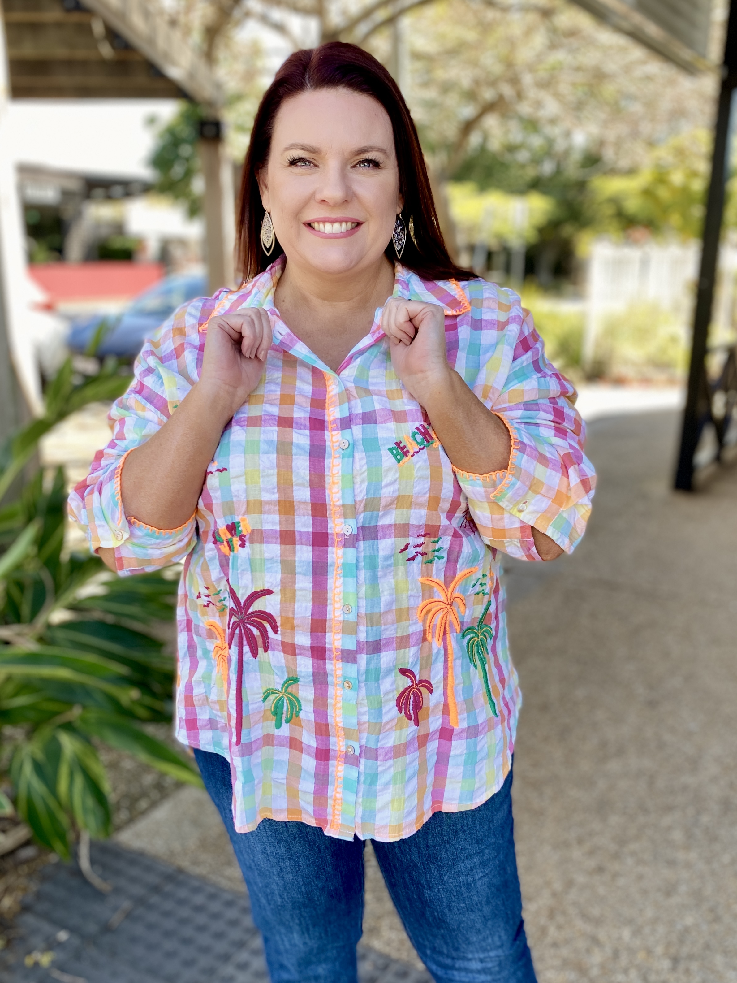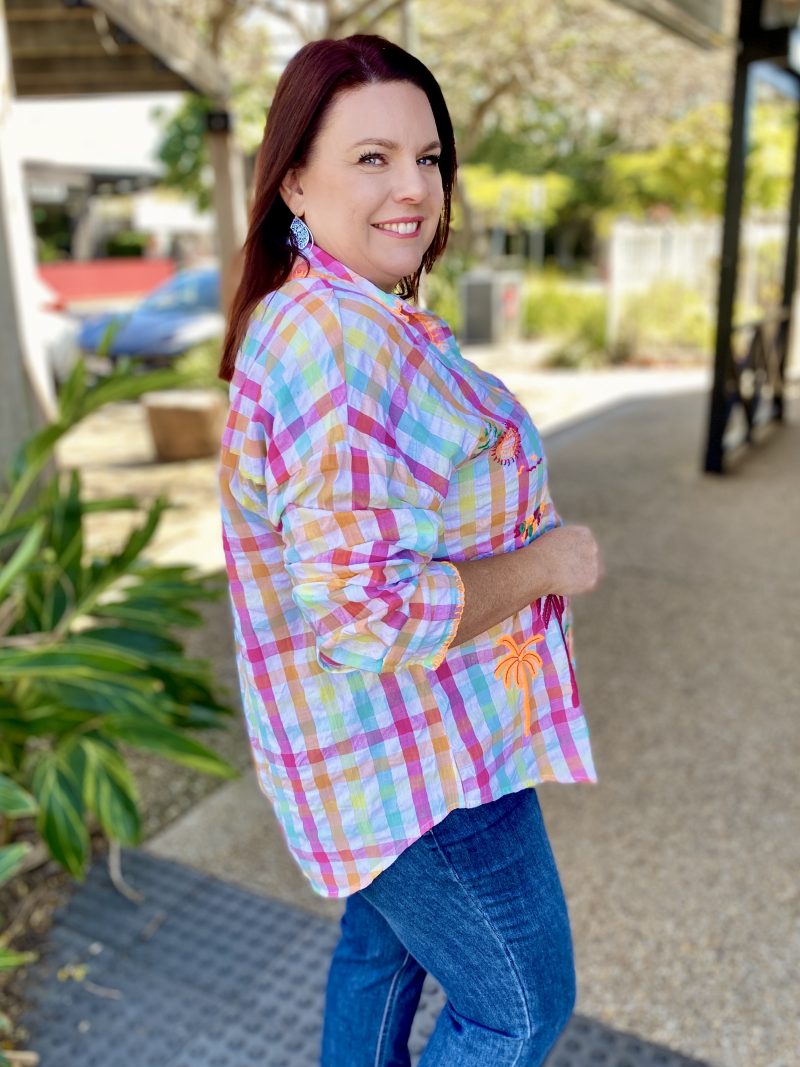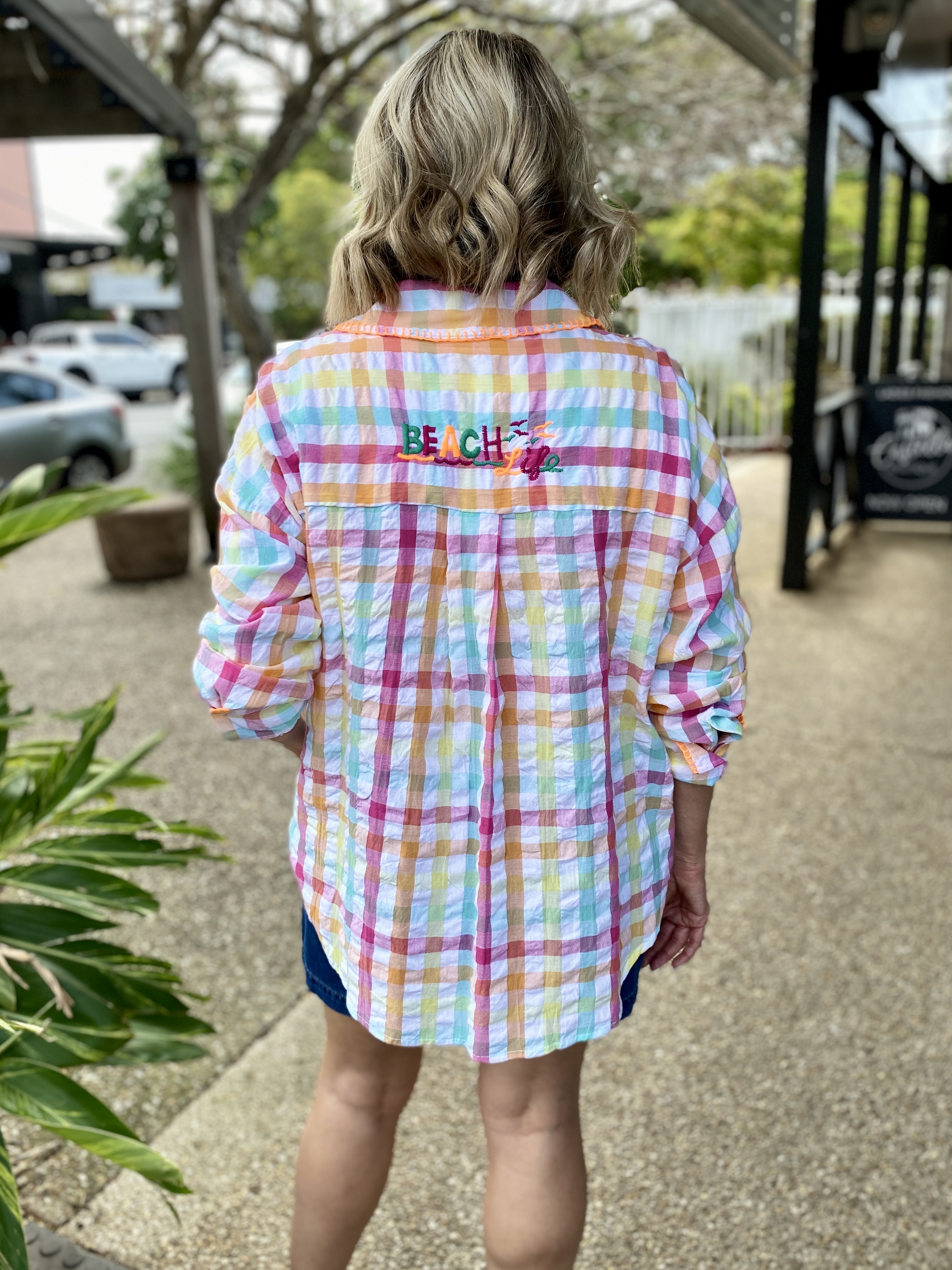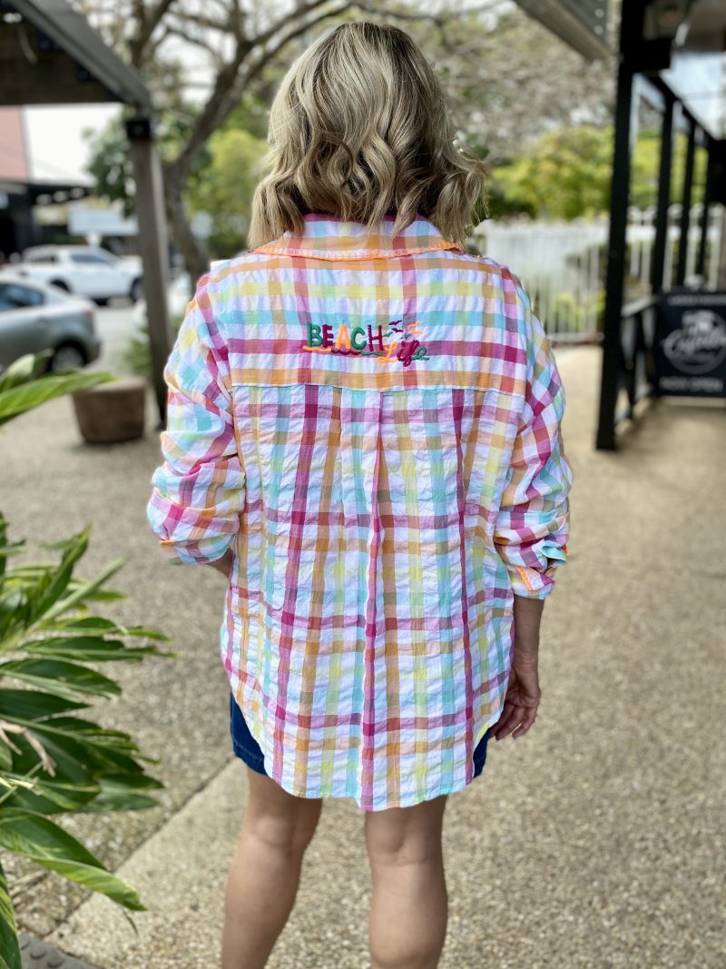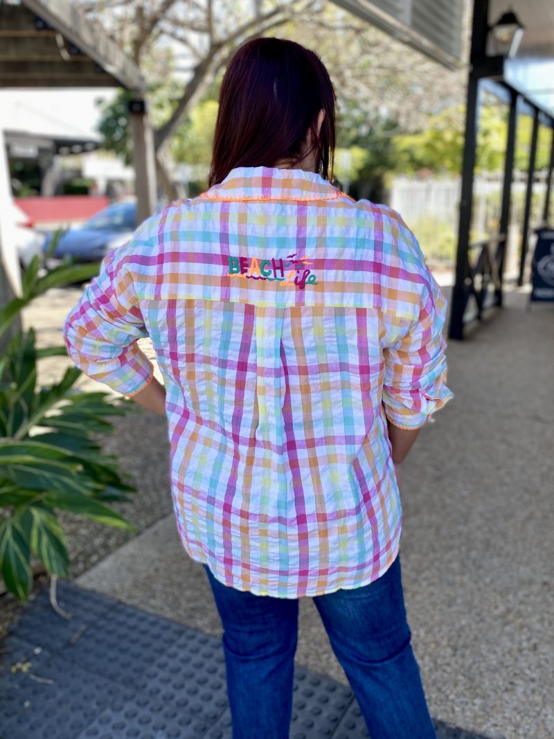 Brighten up your wardrobe with our eye-catching Beach Life shirt, designed for the modern woman who loves bold style with effortless versatility. Featuring a lively check pattern and vibrant contrast stitching, this shirt brings a fun, fashion-forward twist to a timeless classic.