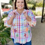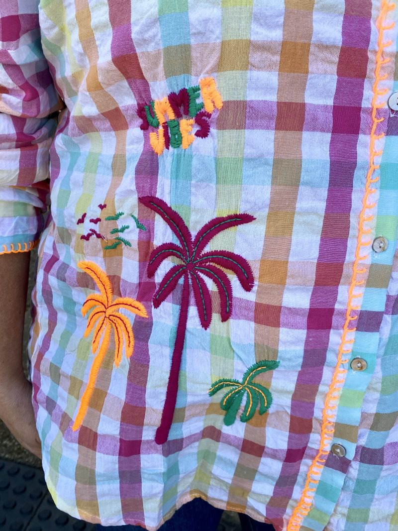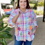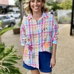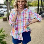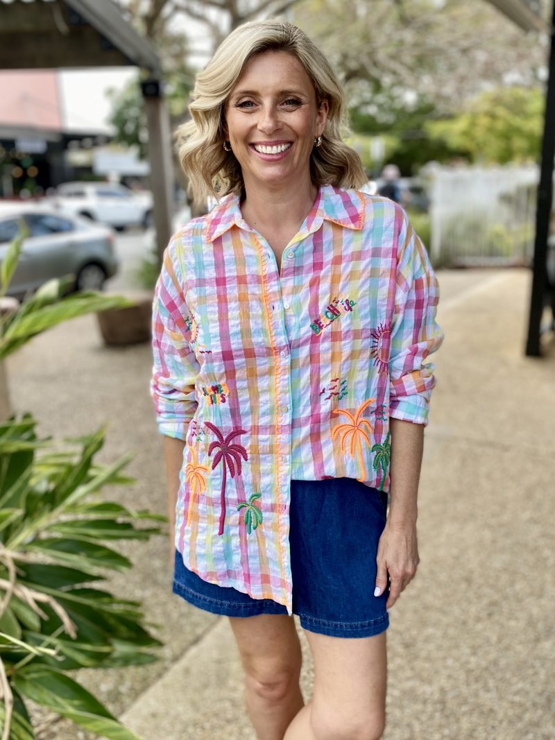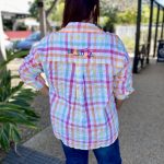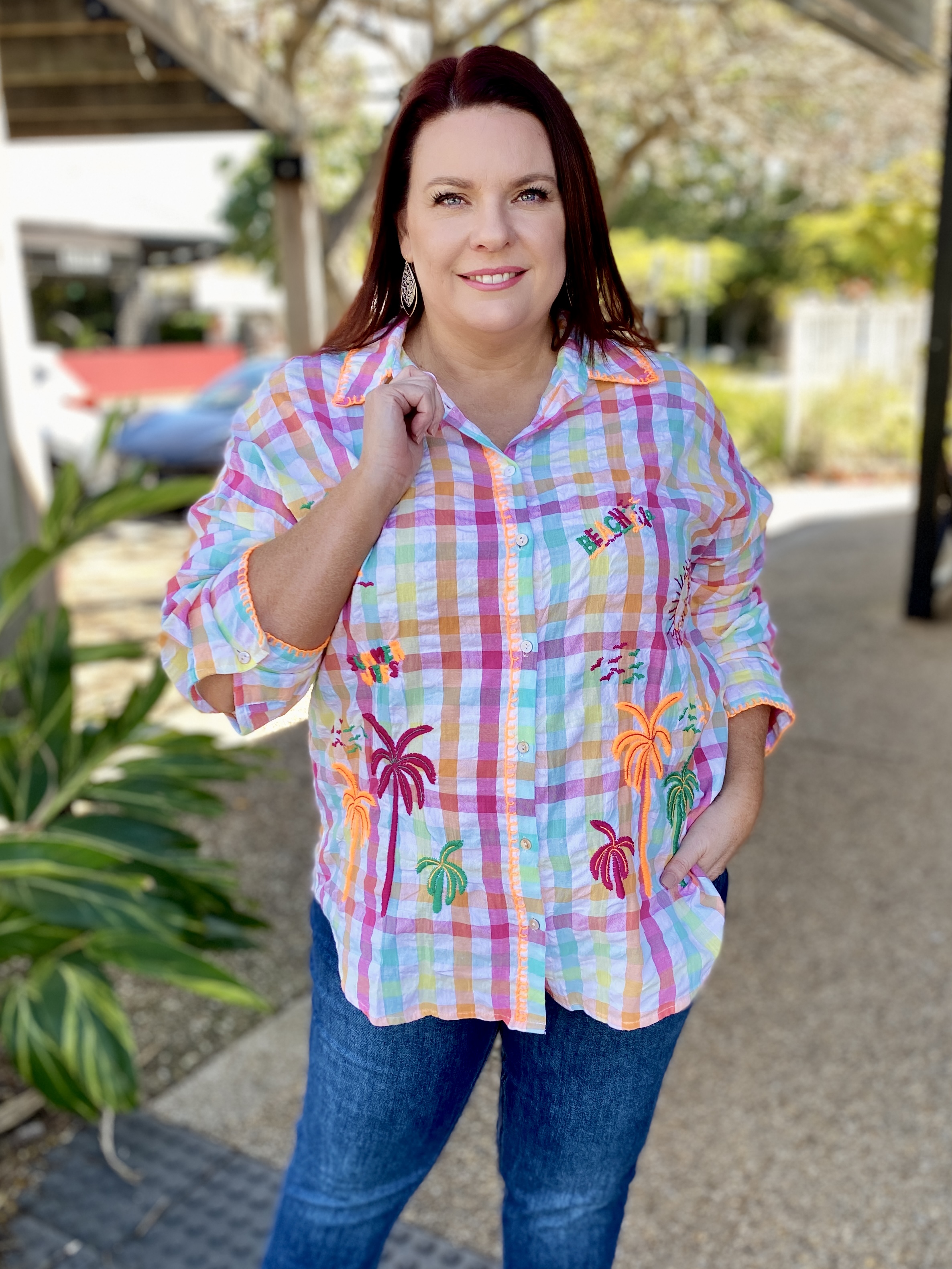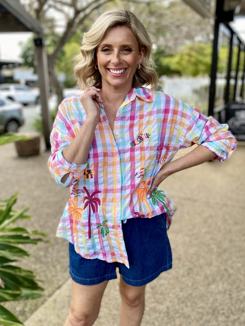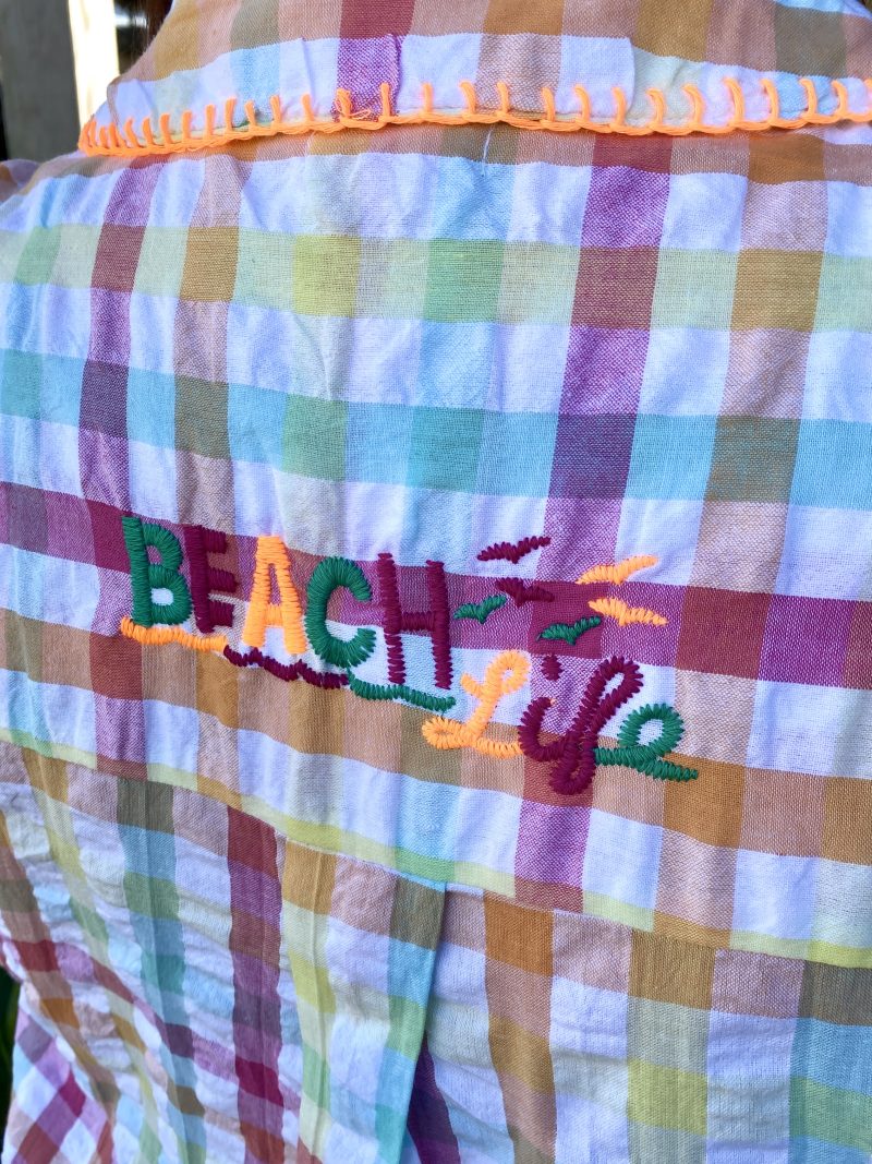 Brighten up your wardrobe with our eye-catching Beach Life shirt, designed for the modern woman who loves bold style with effortless versatility. Featuring a lively check pattern and vibrant contrast stitching, this shirt brings a fun, fashion-forward twist to a timeless classic.