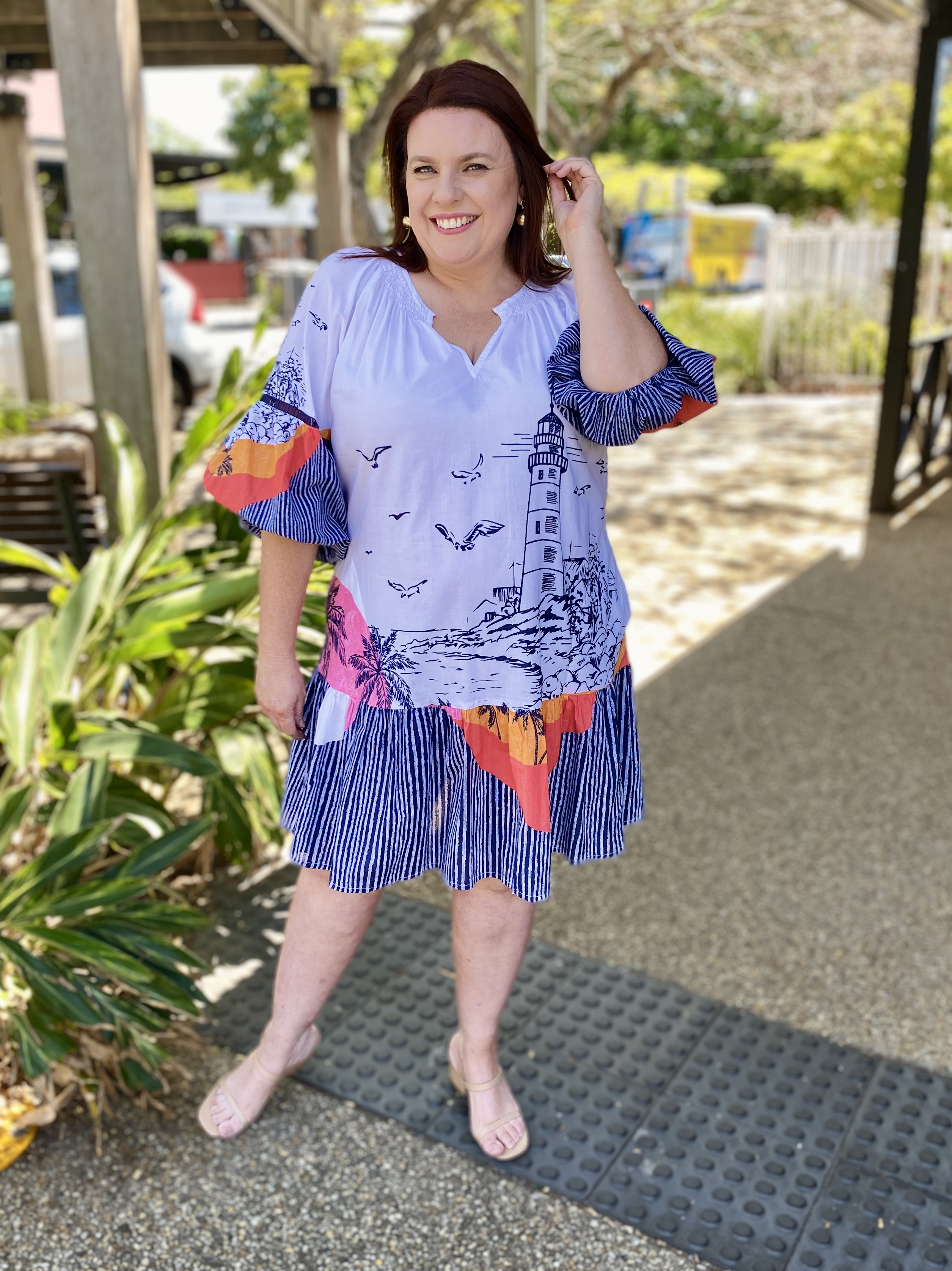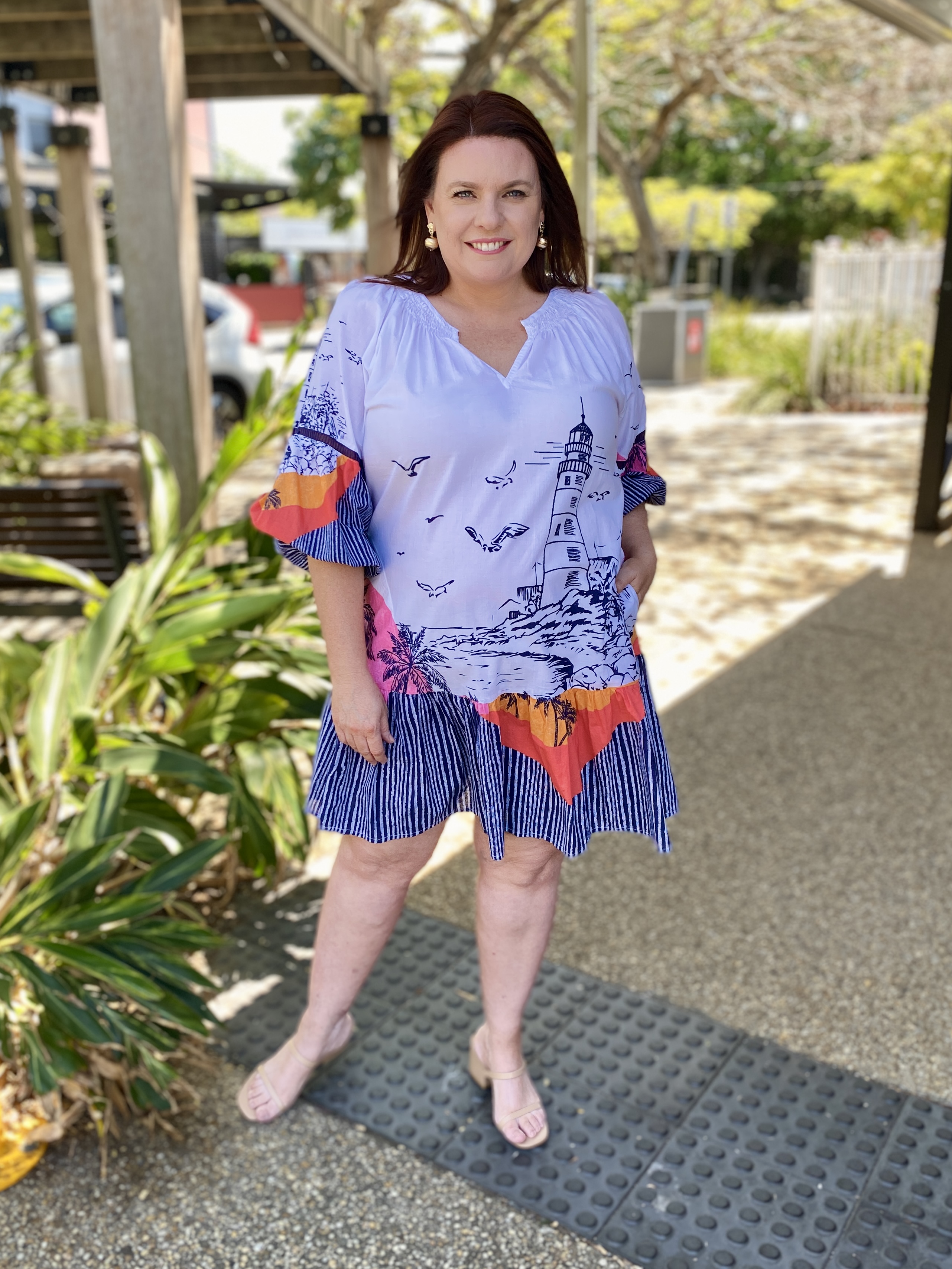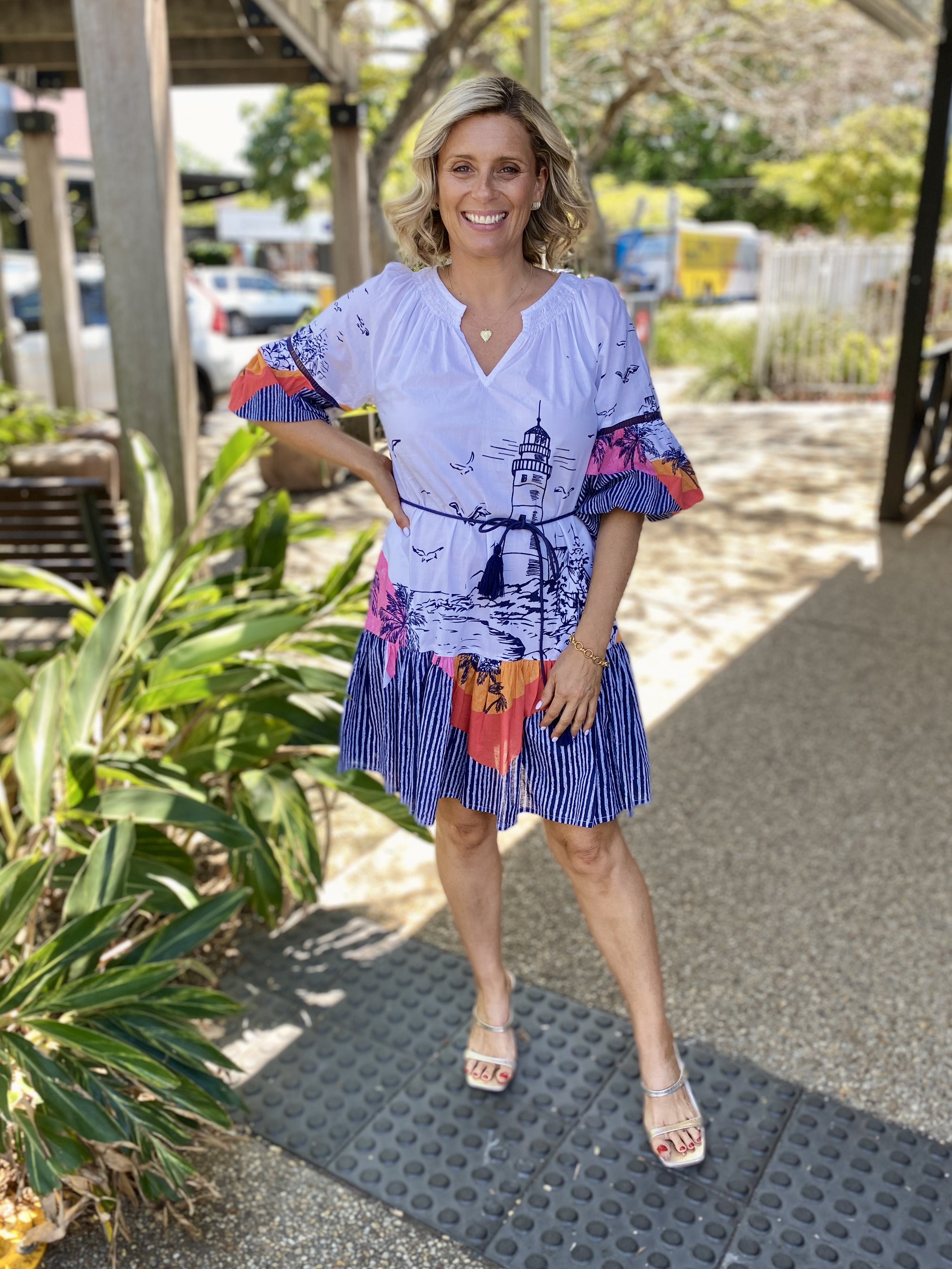 The Byron Dress is a breezy and feminine piece designed for effortless summer style. Made from lightweight fabric, it features a relaxed fit with a round neckline highlighted by shirring and gathers for soft detail. The ¾ raglan sleeves are finished with ladder lace and elastic hems, while the gathered flounce hem adds movement and charm. With side pockets and an optional waist rope tie for versatile styling, this above-knee digital print dress is perfect for everyday wear, weekend outings, or holiday escapes.