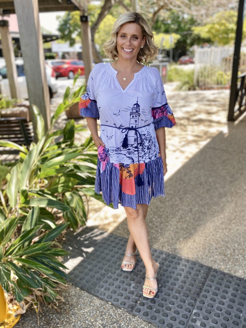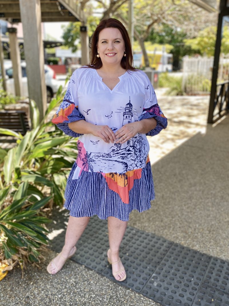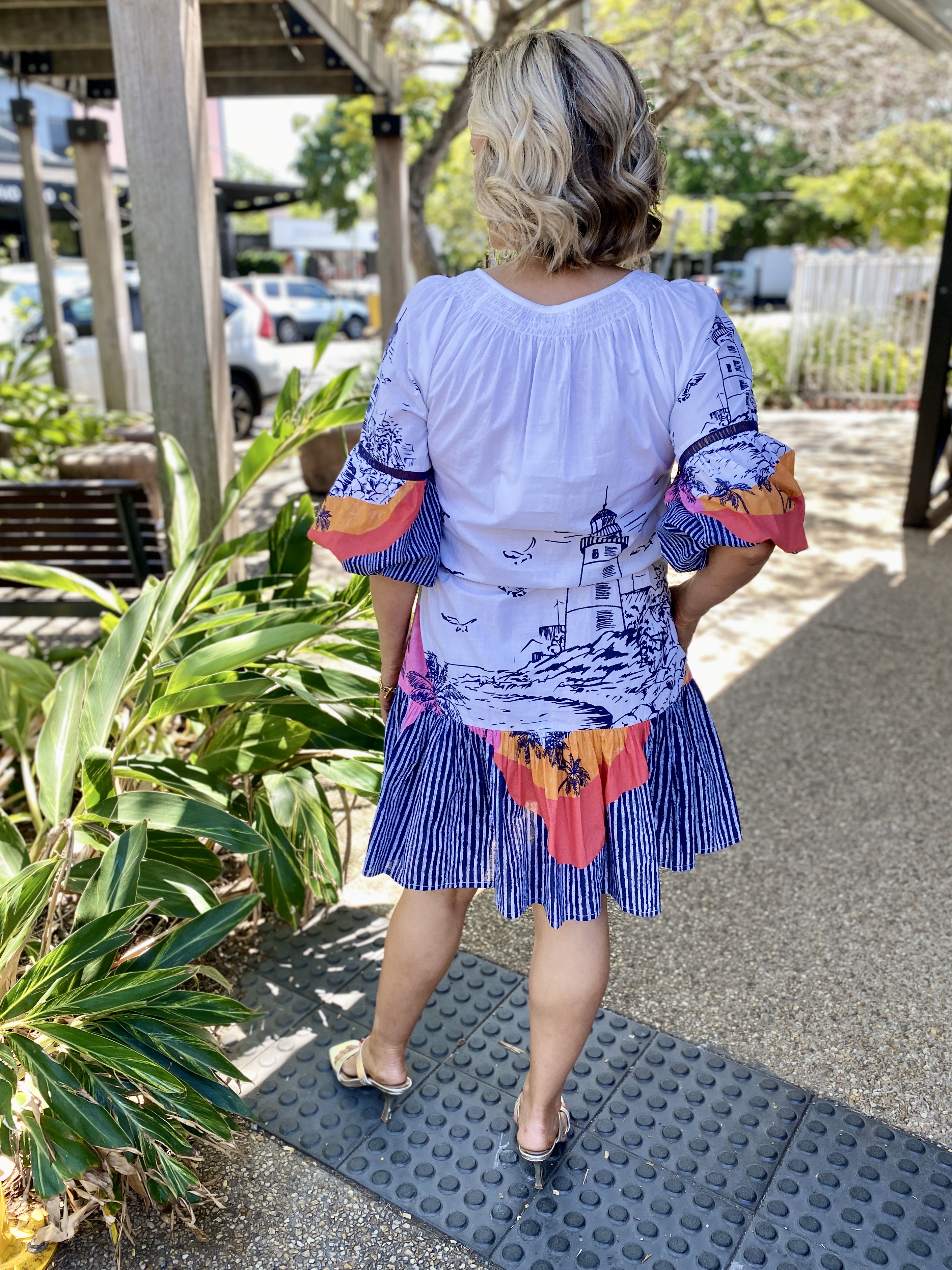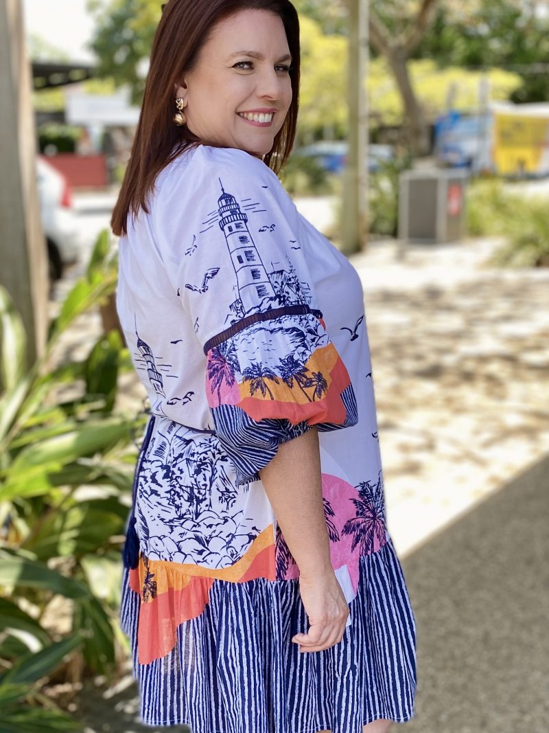 The Byron Dress is a breezy and feminine piece designed for effortless summer style. Made from lightweight fabric, it features a relaxed fit with a round neckline highlighted by shirring and gathers for soft detail. The ¾ raglan sleeves are finished with ladder lace and elastic hems, while the gathered flounce hem adds movement and charm. With side pockets and an optional waist rope tie for versatile styling, this above-knee digital print dress is perfect for everyday wear, weekend outings, or holiday escapes.