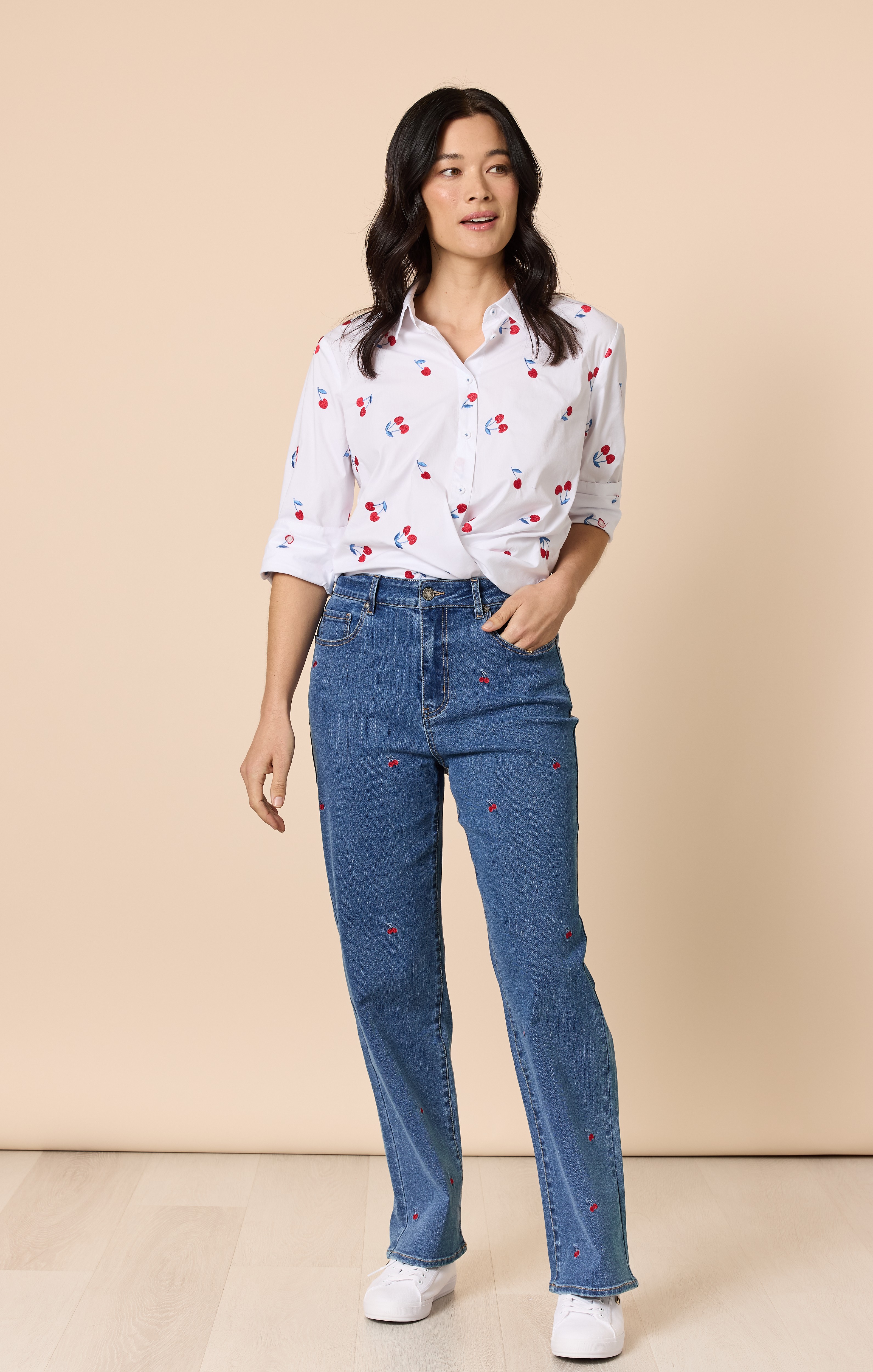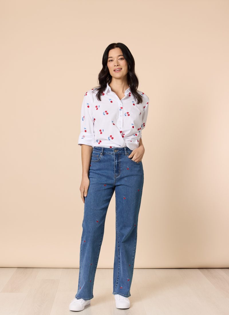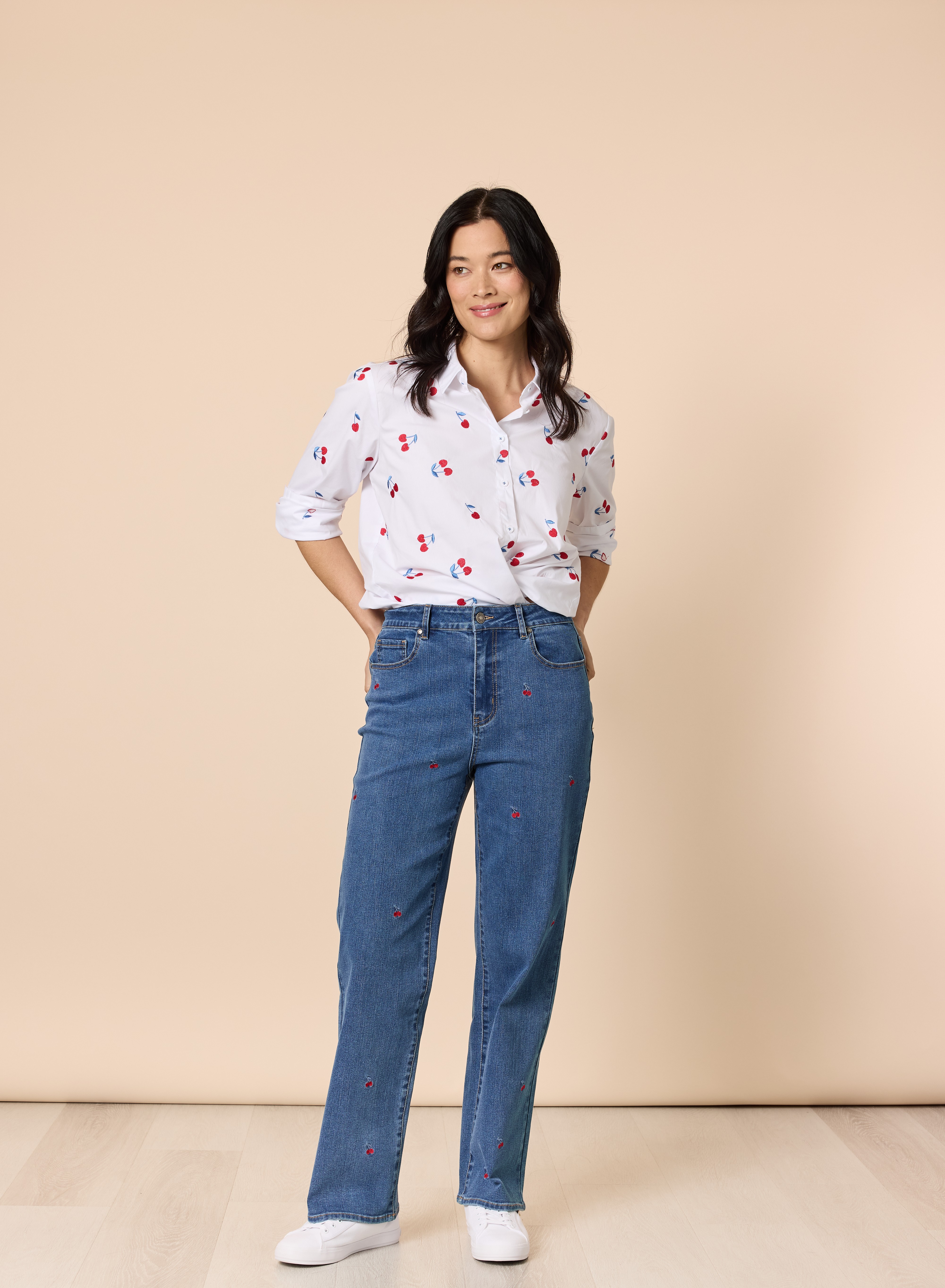 Add a playful twist to your everyday denim with these Embroidered Cherry Jeans. Crafted from soft, durable cotton denim with a touch of stretch, they feature charming cherry embroidery scattered throughout for a fun yet subtle pop of colour.
