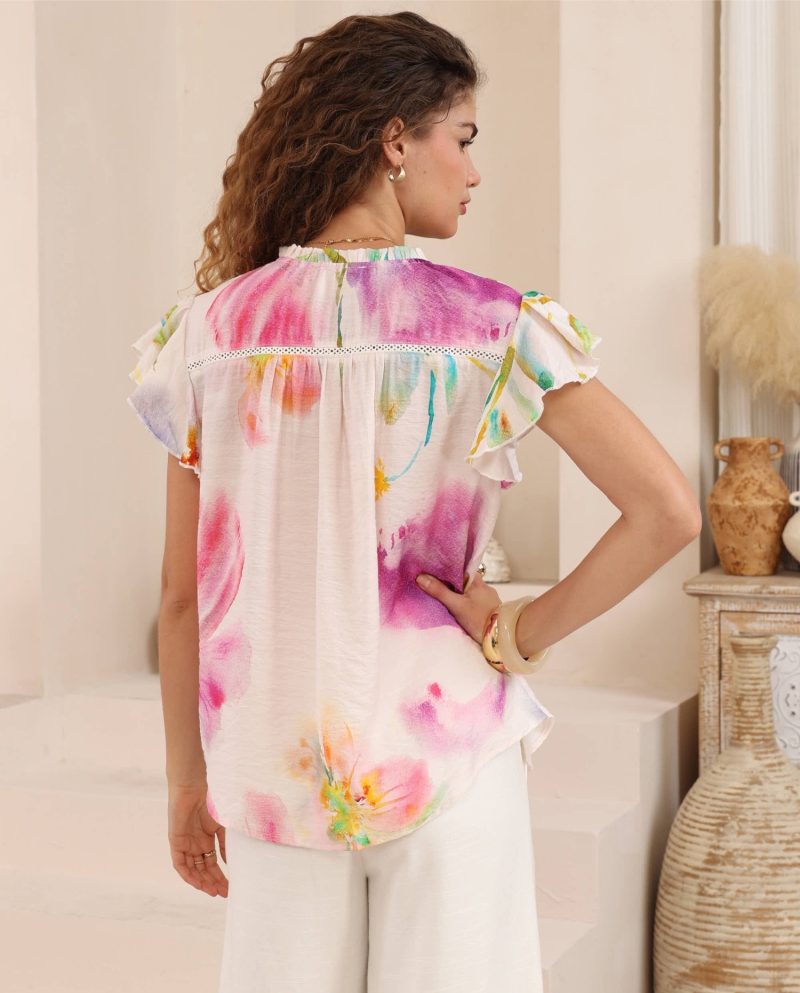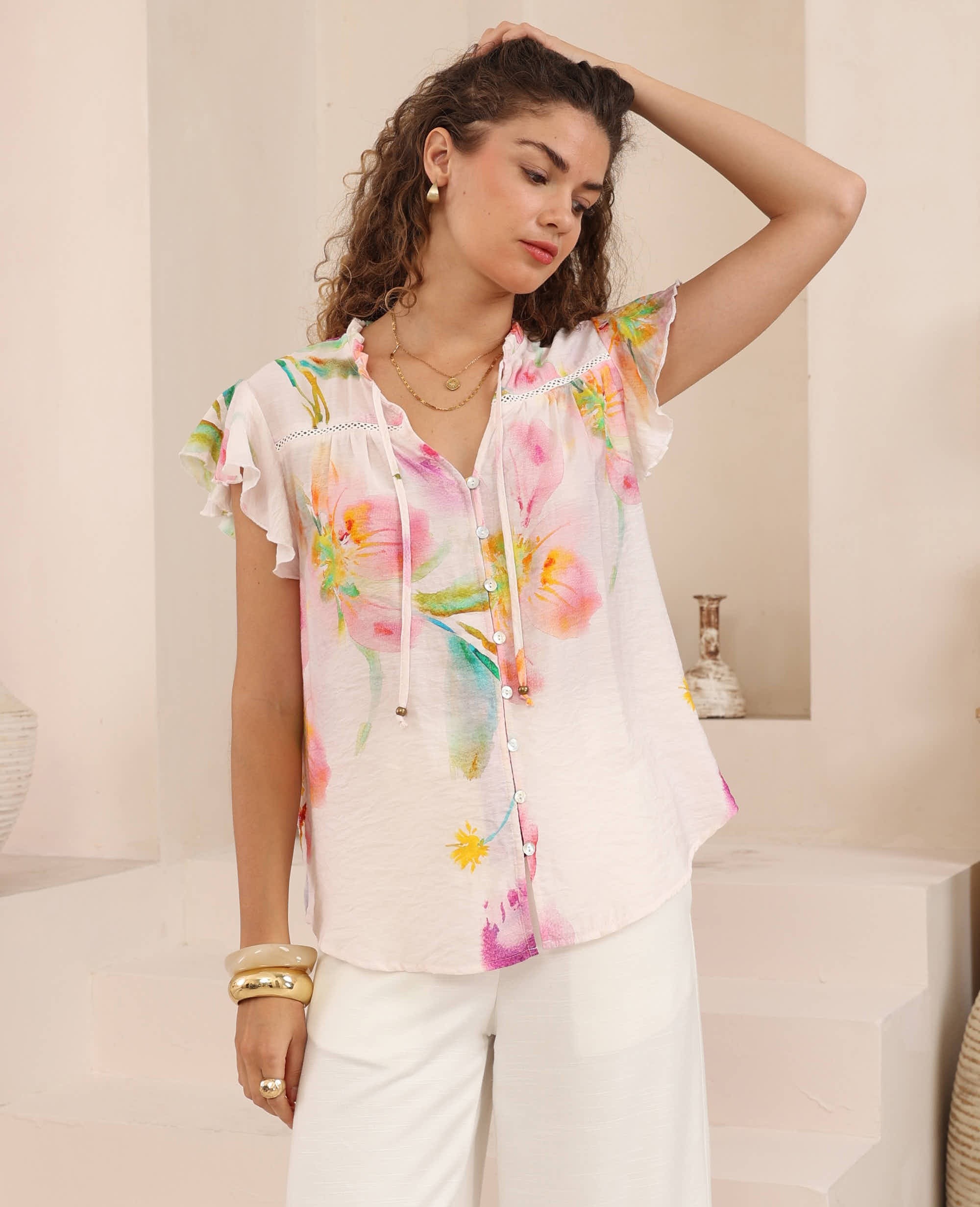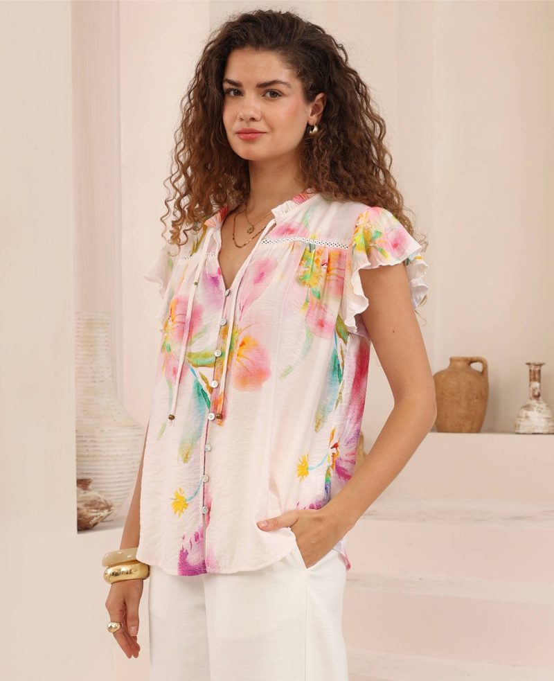The Cybill Shirt in Watercolours brings relaxed elegance to your everyday wardrobe. Whether you’re planning coastal escapes or city strolls, this breezy staple is made for sun-soaked days and spontaneous getaways.