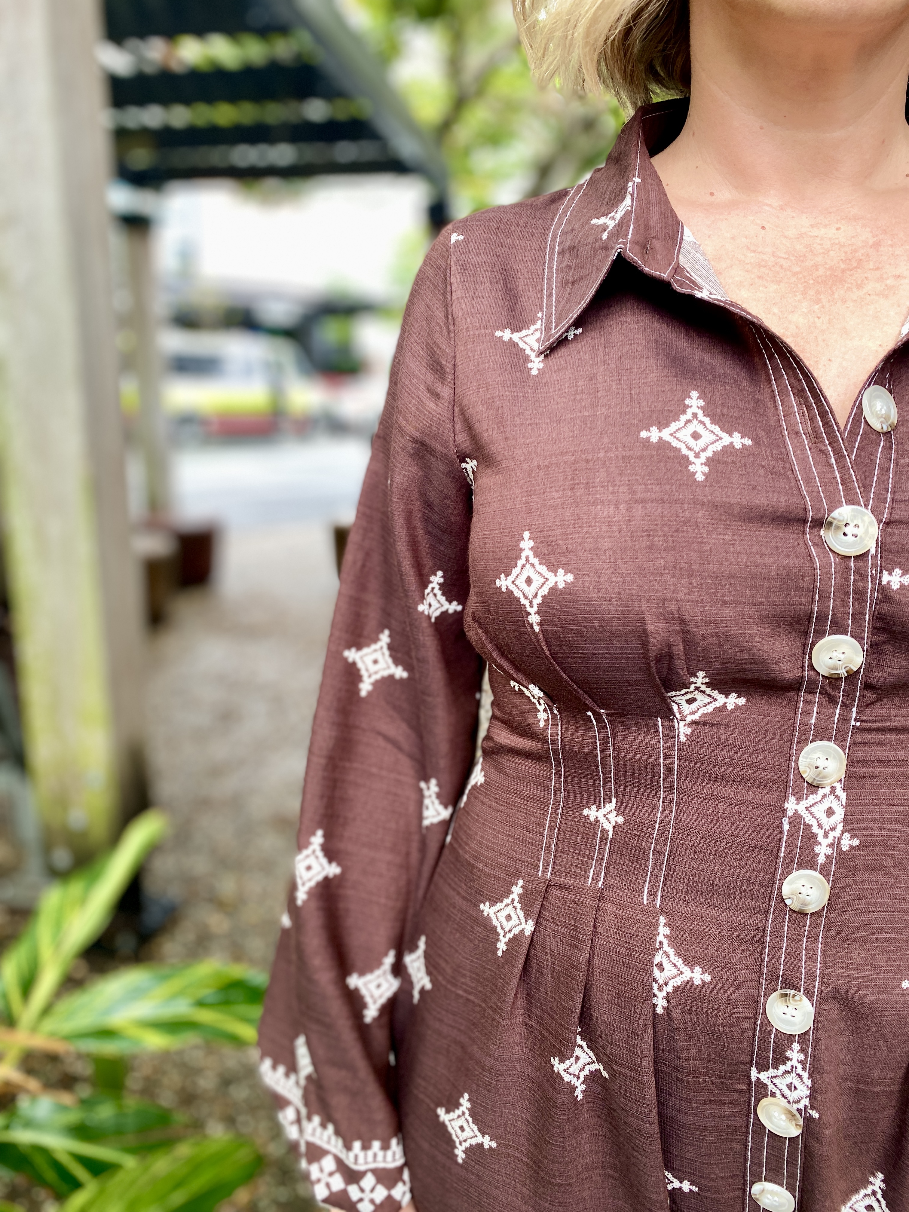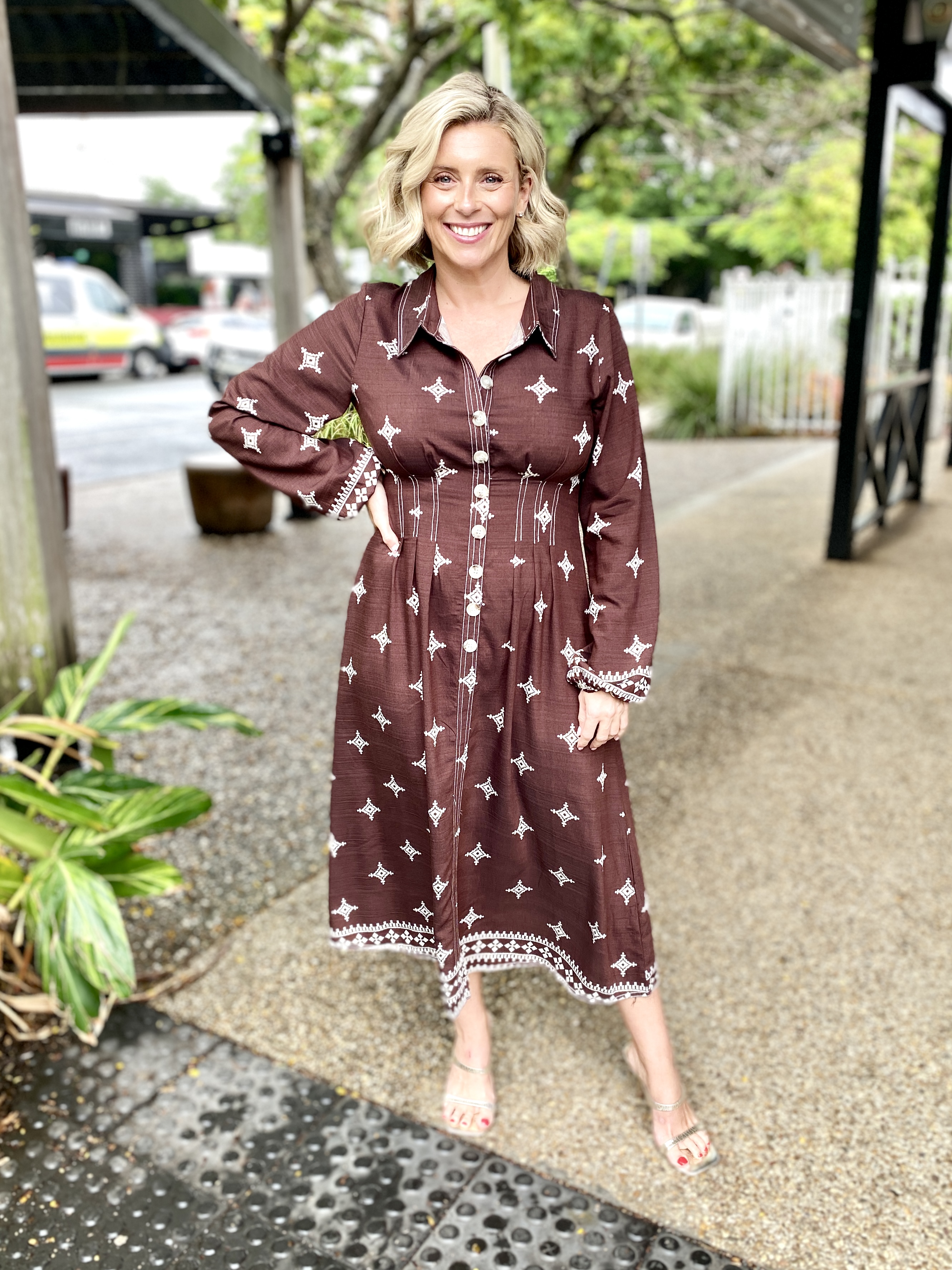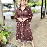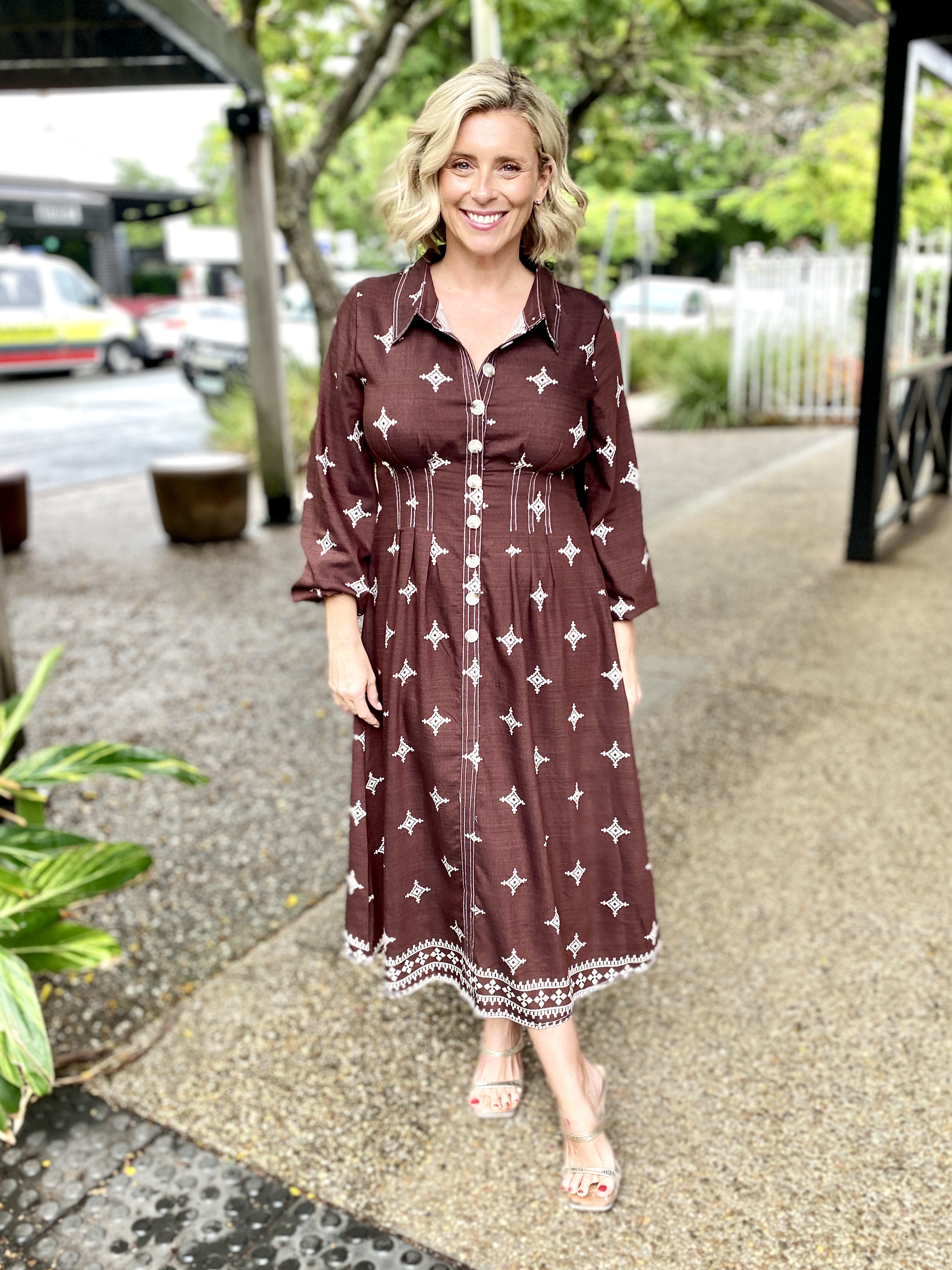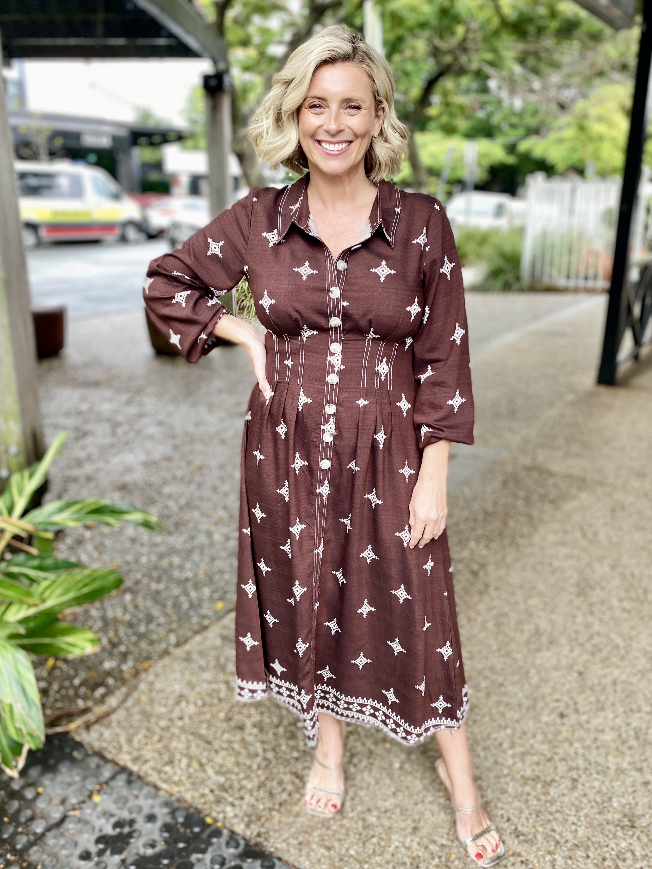 Modern yet timeless, the Delaney Midi Dress in Chocolate with white print is a go to piece for workdays, events and everything in between. Designed in breathable fabric with an effortless drape, this midi is both polished and practical.