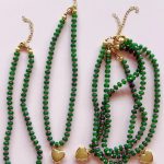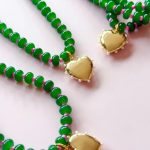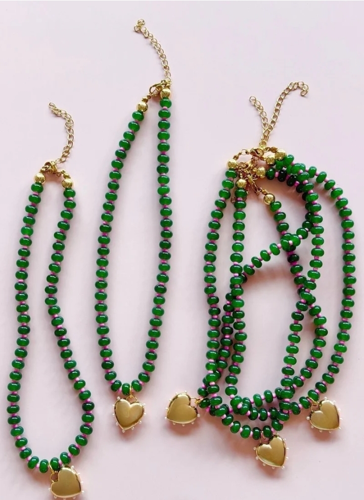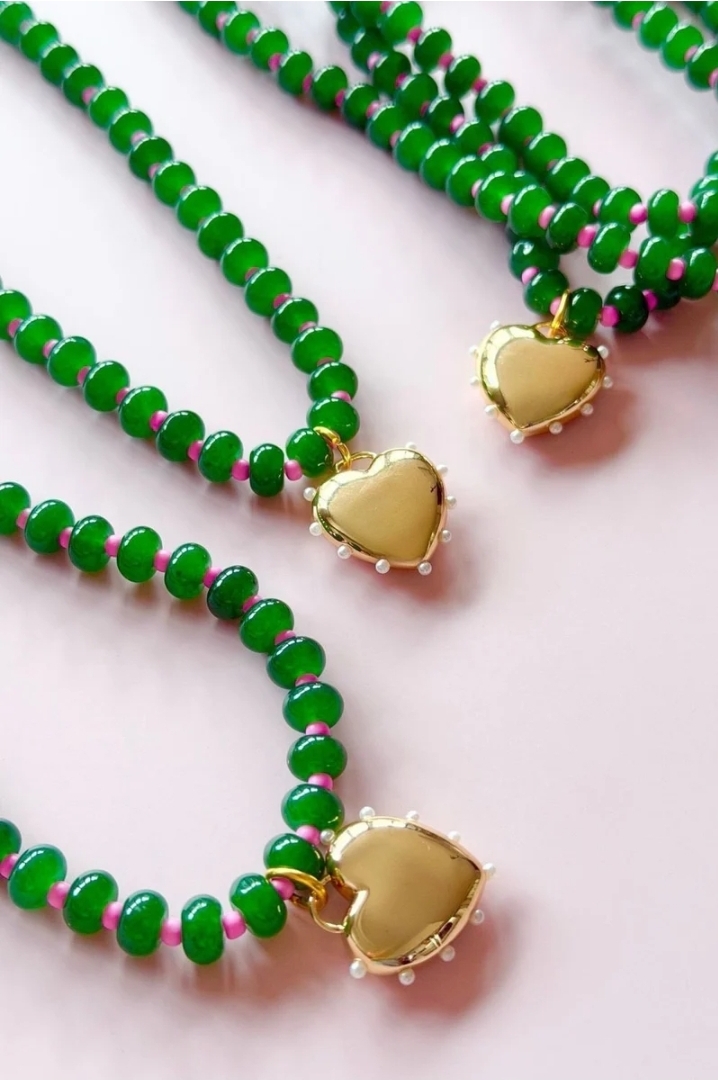 • Made with the most gorgeous green and bubblegum glass beads, paired with a fabulous chunky gold heart pendant finished with a hint of pearl detailing