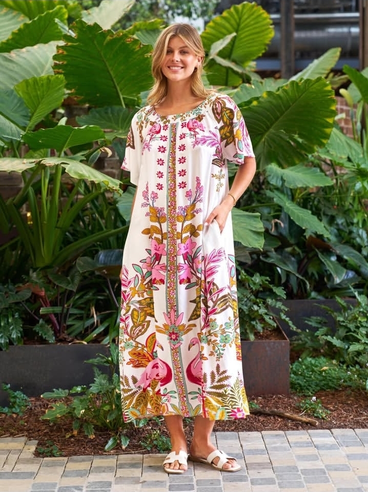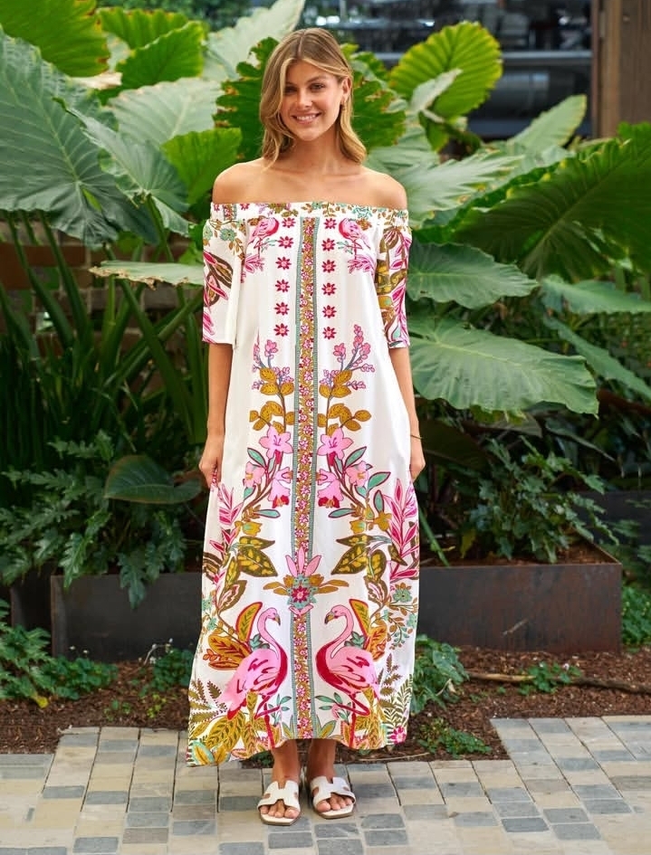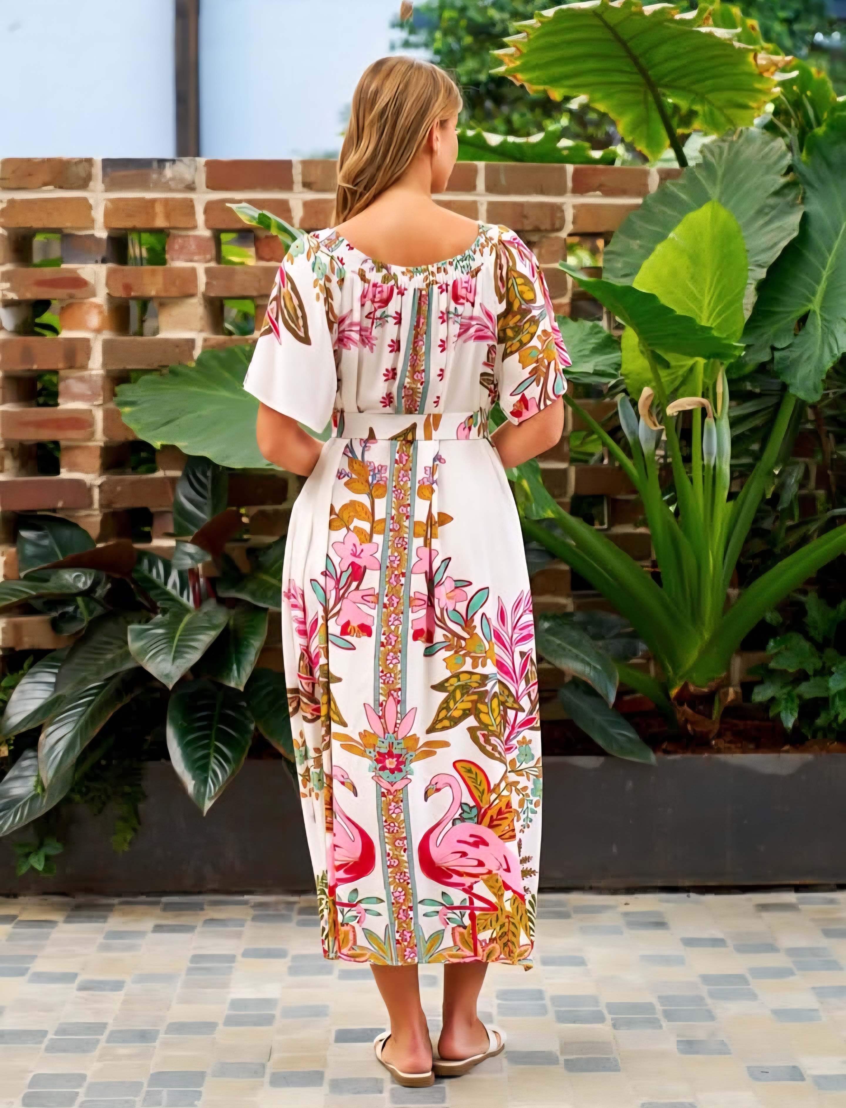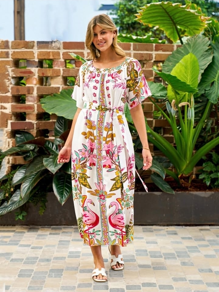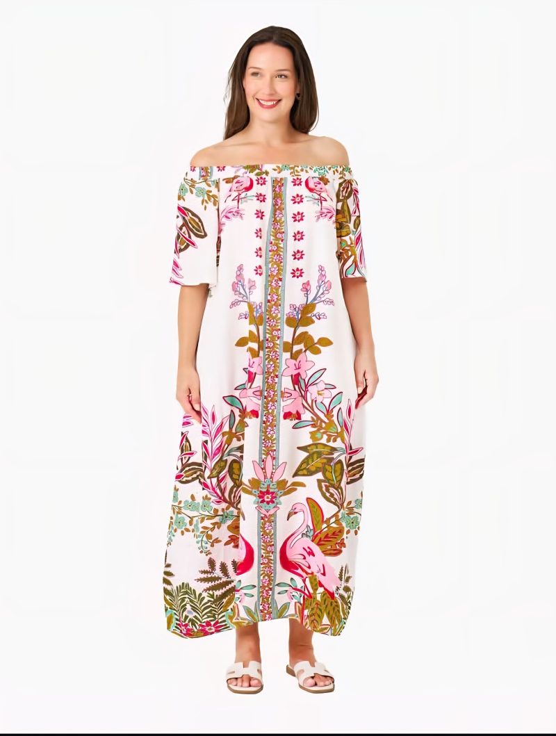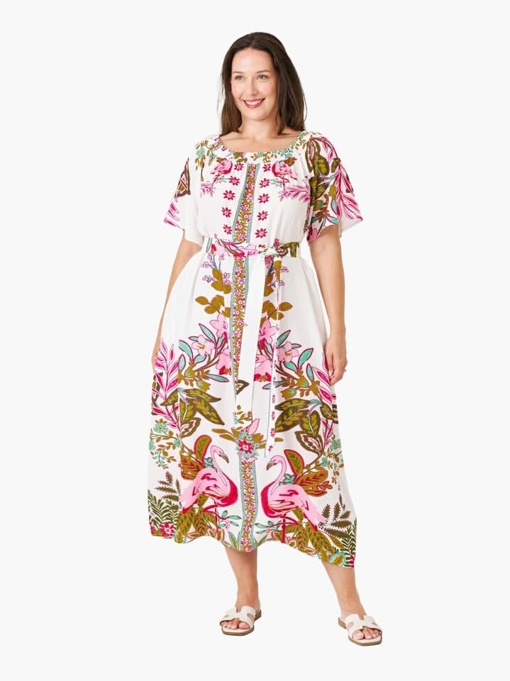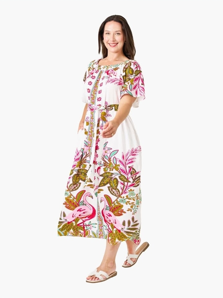 Our Flamingo Shirt Dress is a must-have style for your everyday wardrobe! This shirt dress features a self waist tie and can be worn on or off the shoulders. Wear yours to work with nude pumps, to wine night with strappy heels!