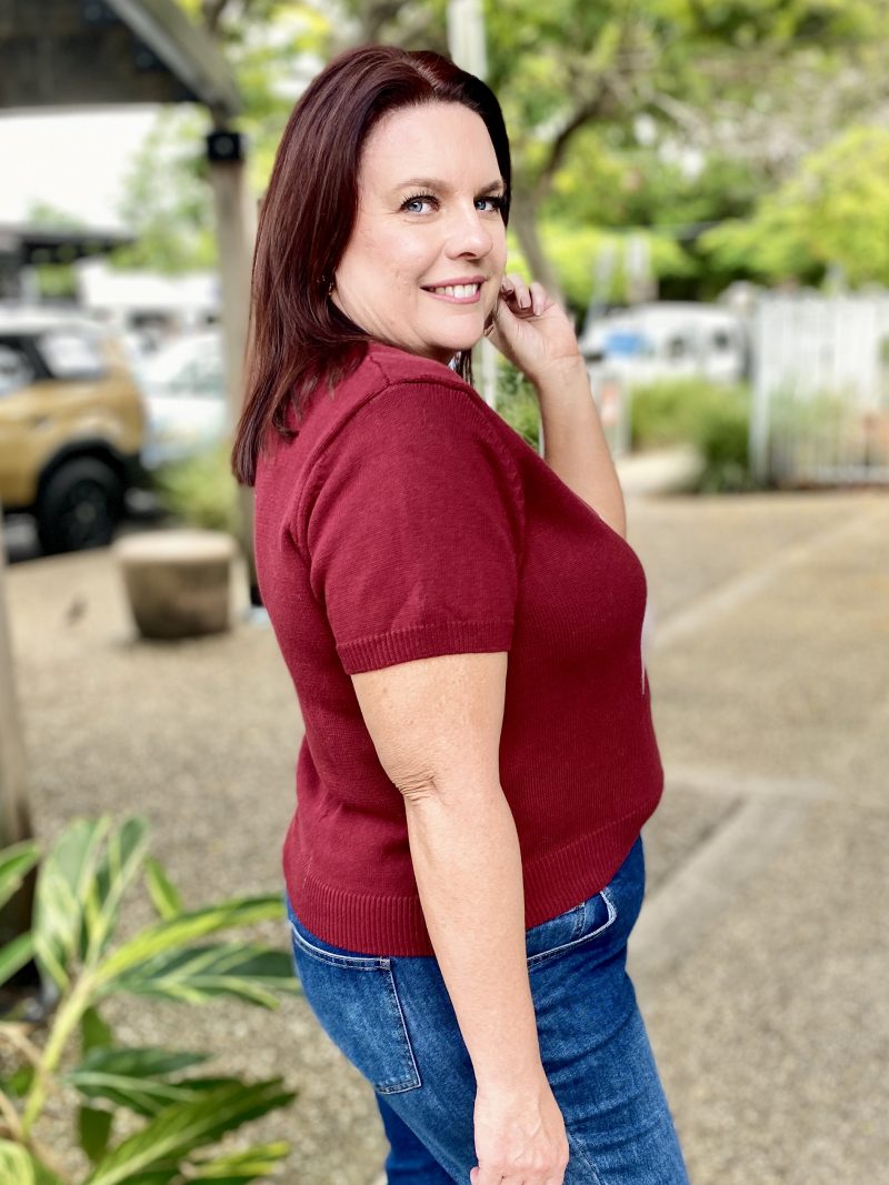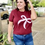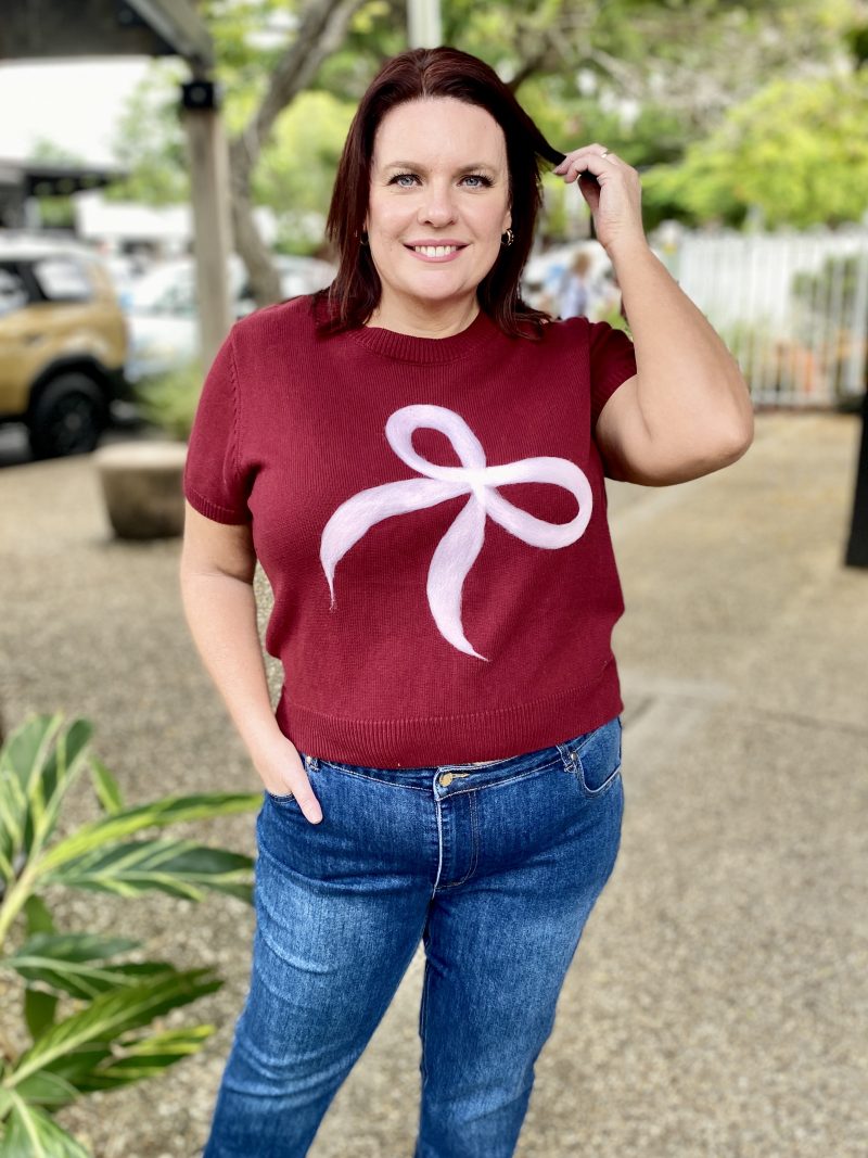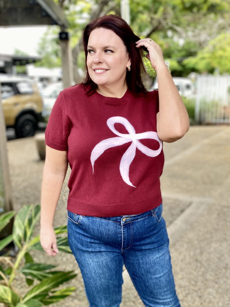 The Lara Bow Knit in Wine with soft pink bow brings a playful yet polished touch to your knitwear collection. Designed in a wine base with statement bow detailing, this cosy style blends charm with everyday versatility.