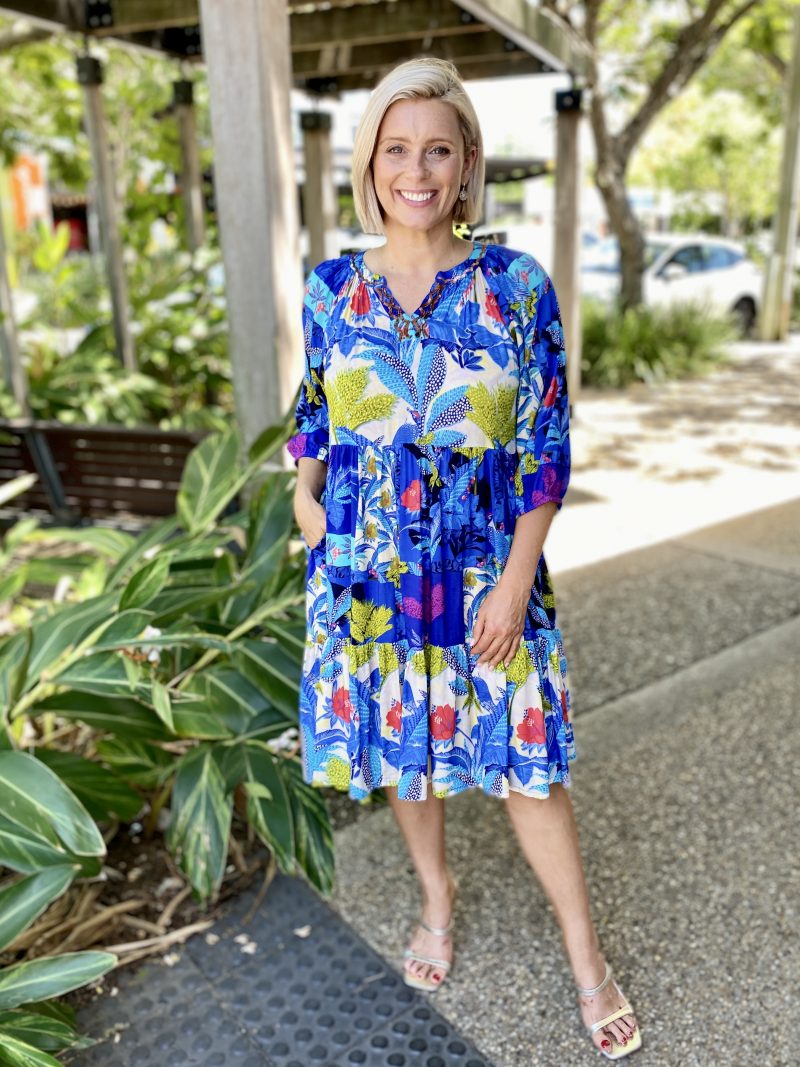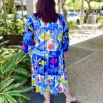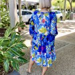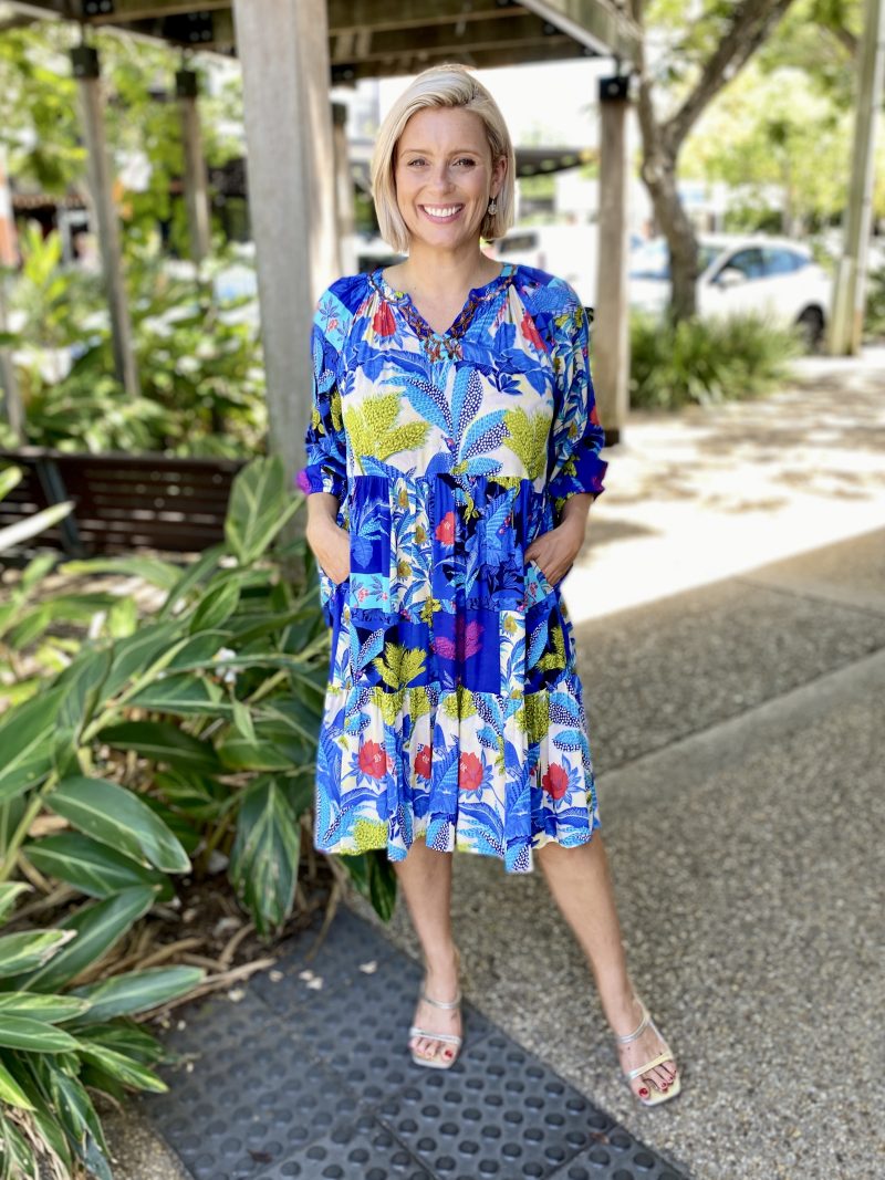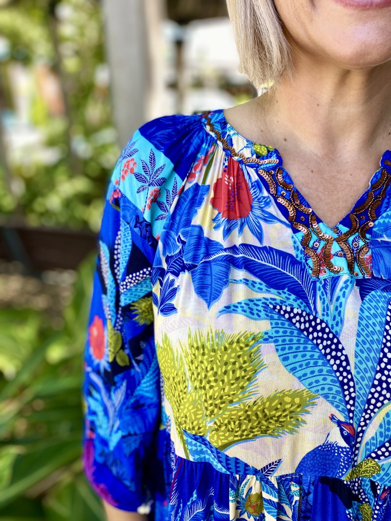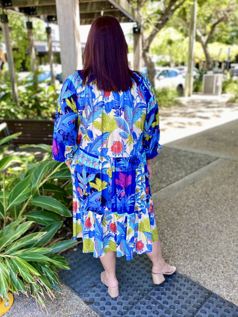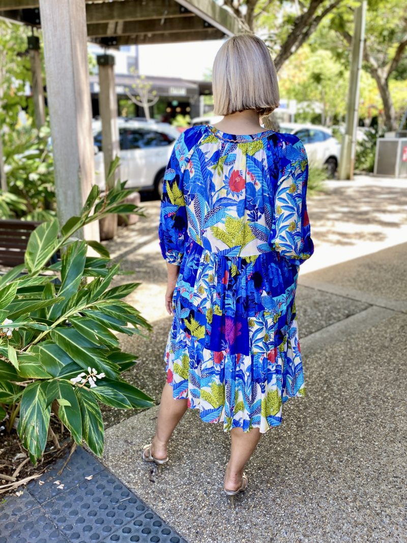 Chase the horizon in the story-woven Luna Dress. Featuring a deep azure floral jungle print, a mandarin collar, raglan sleeves, a tiered skirt that falls at the knee, gathered three-quarter frill sleeves, and colourful tropical prints, this dress is so fun to wear! This is the perfect dress for a day out at the beach.