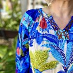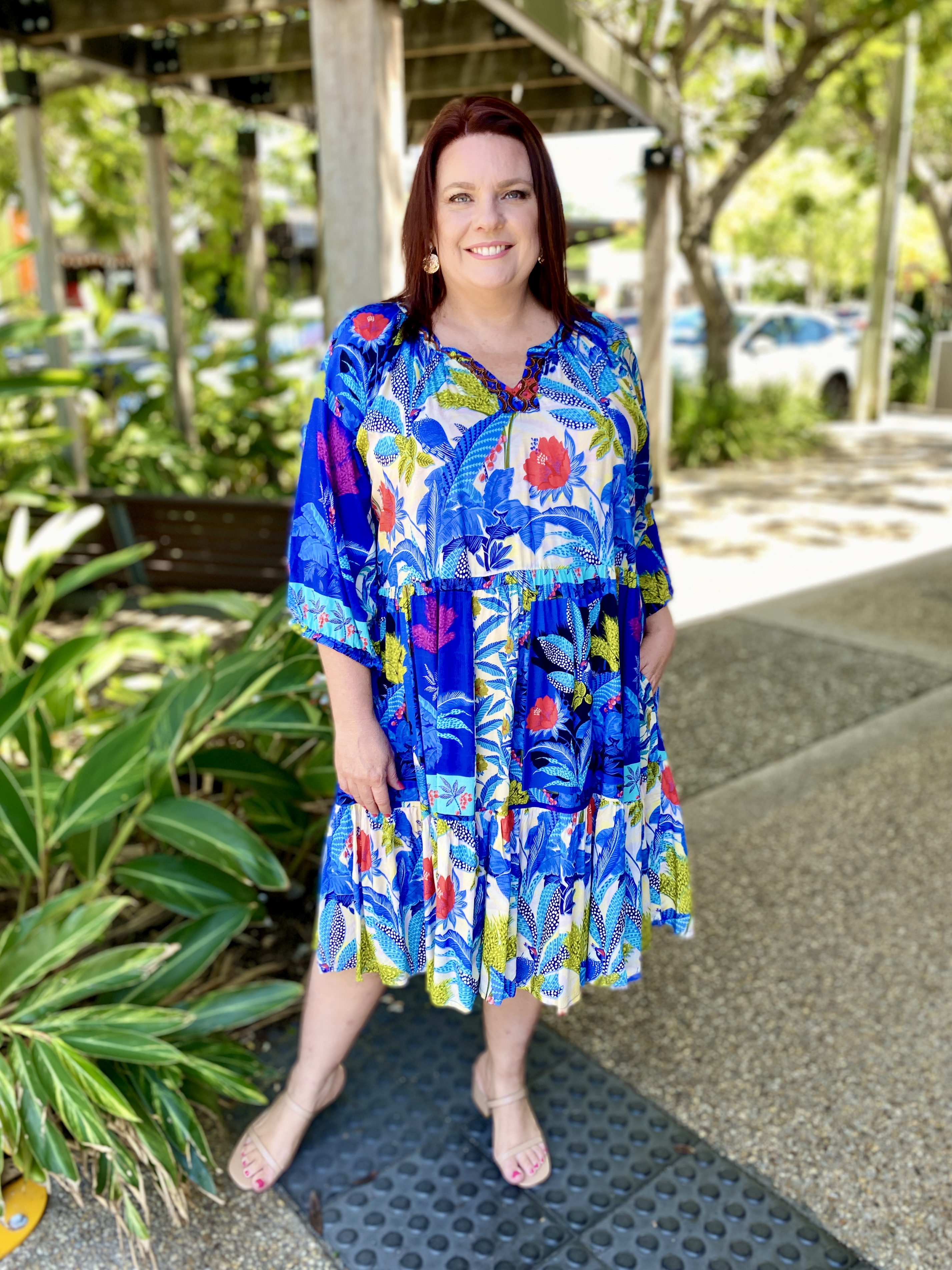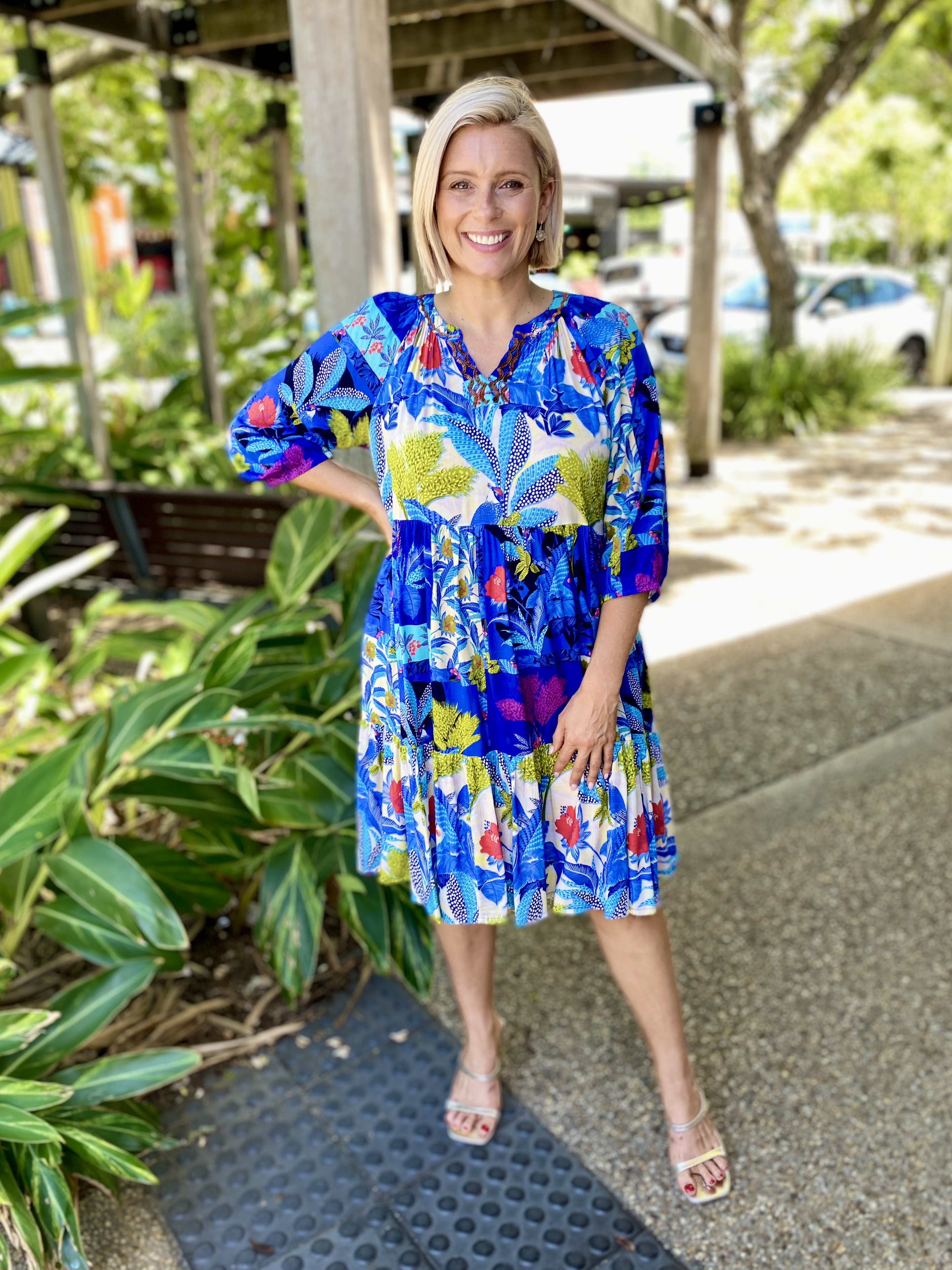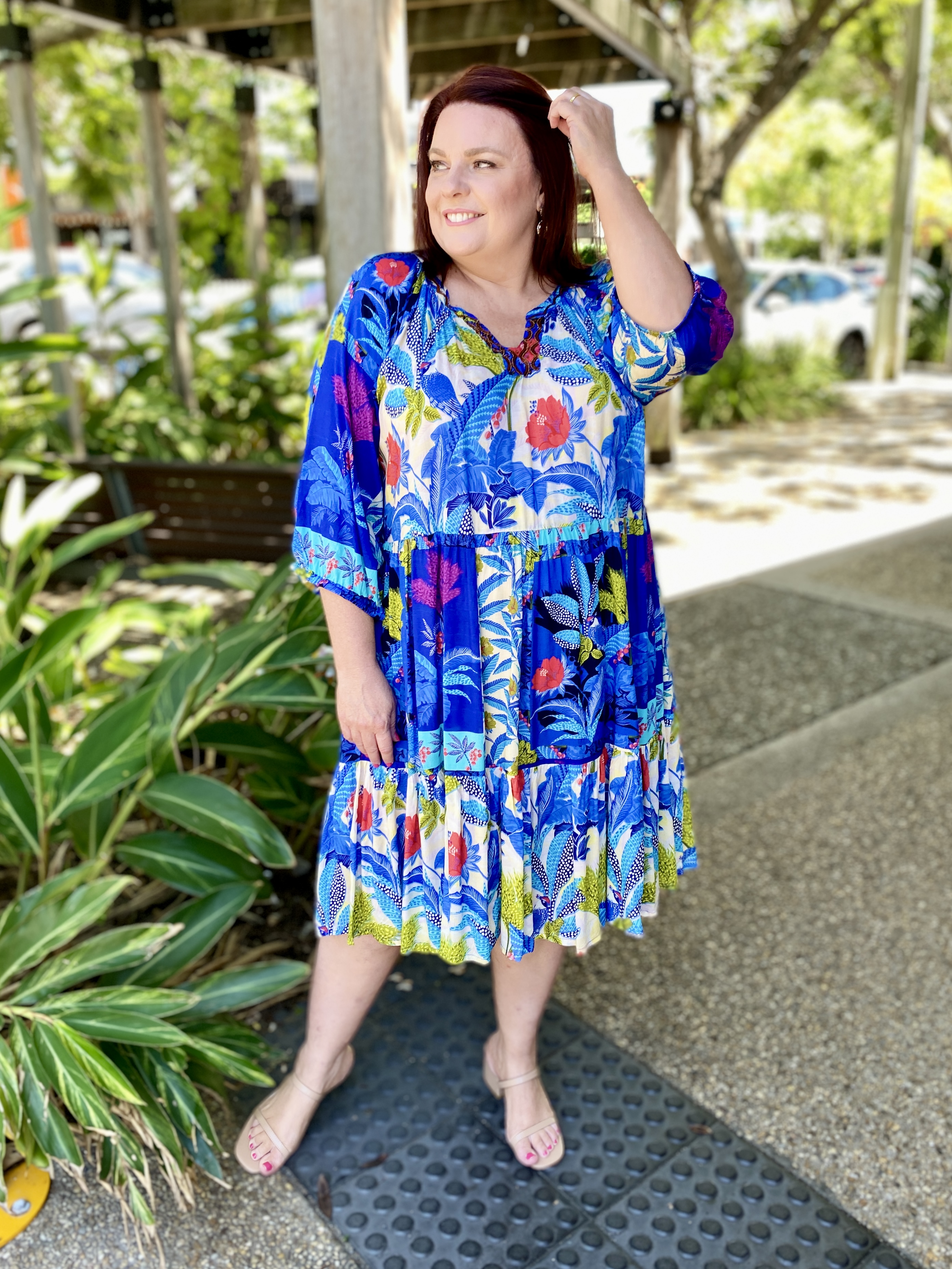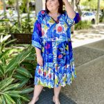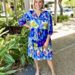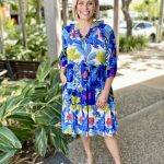 Chase the horizon in the story-woven Luna Dress. Featuring a deep azure floral jungle print, a mandarin collar, raglan sleeves, a tiered skirt that falls at the knee, gathered three-quarter frill sleeves, and colourful tropical prints, this dress is so fun to wear! This is the perfect dress for a day out at the beach.