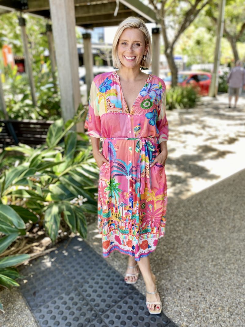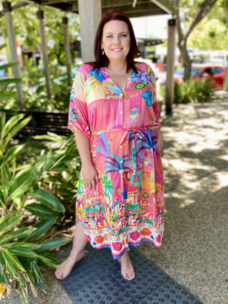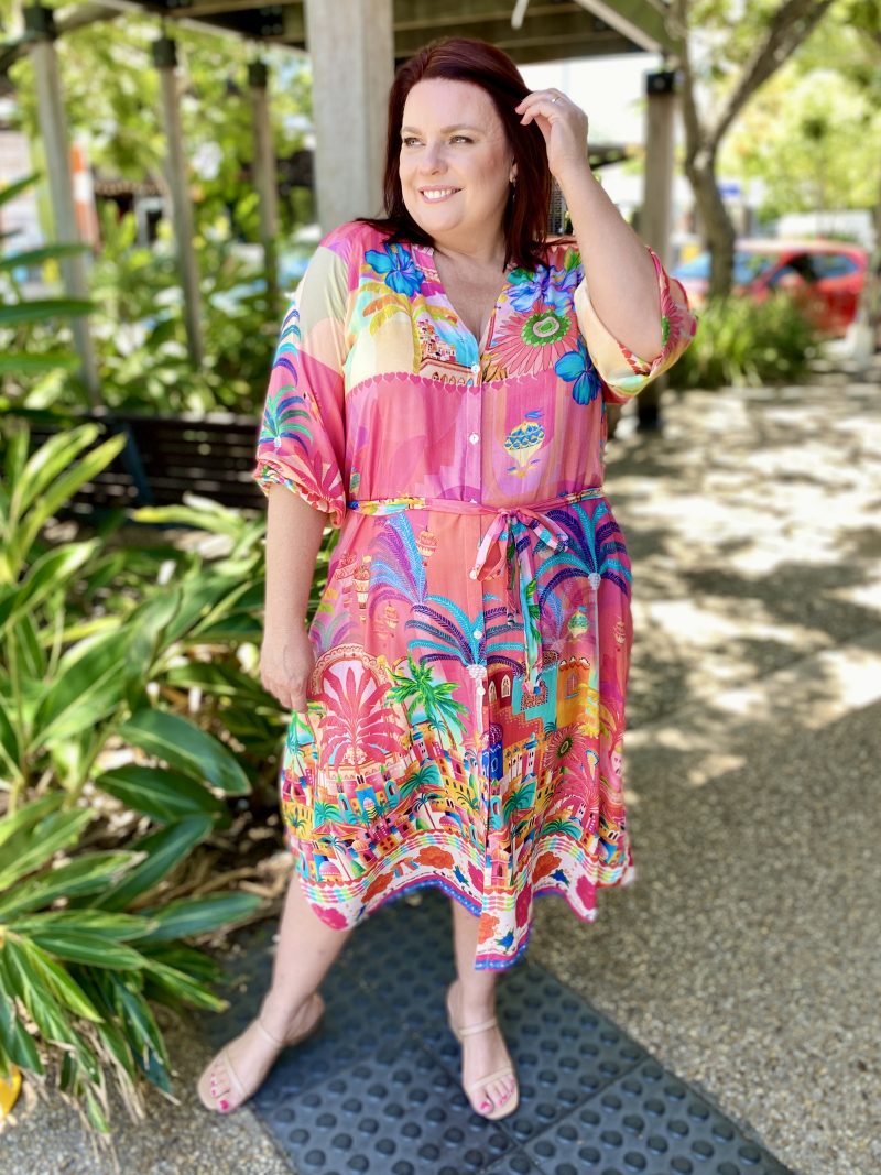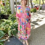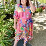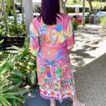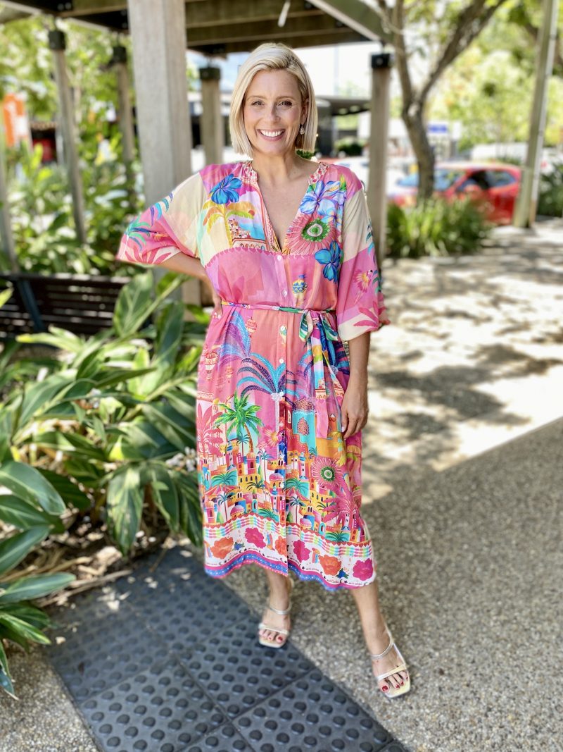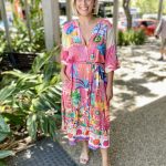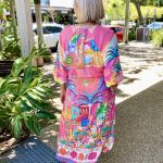 Step into holiday mode with the Mandalay Bay Dress, bursting with tropical charm in a kaleidoscope of pink, turquoise, yellow, and green.