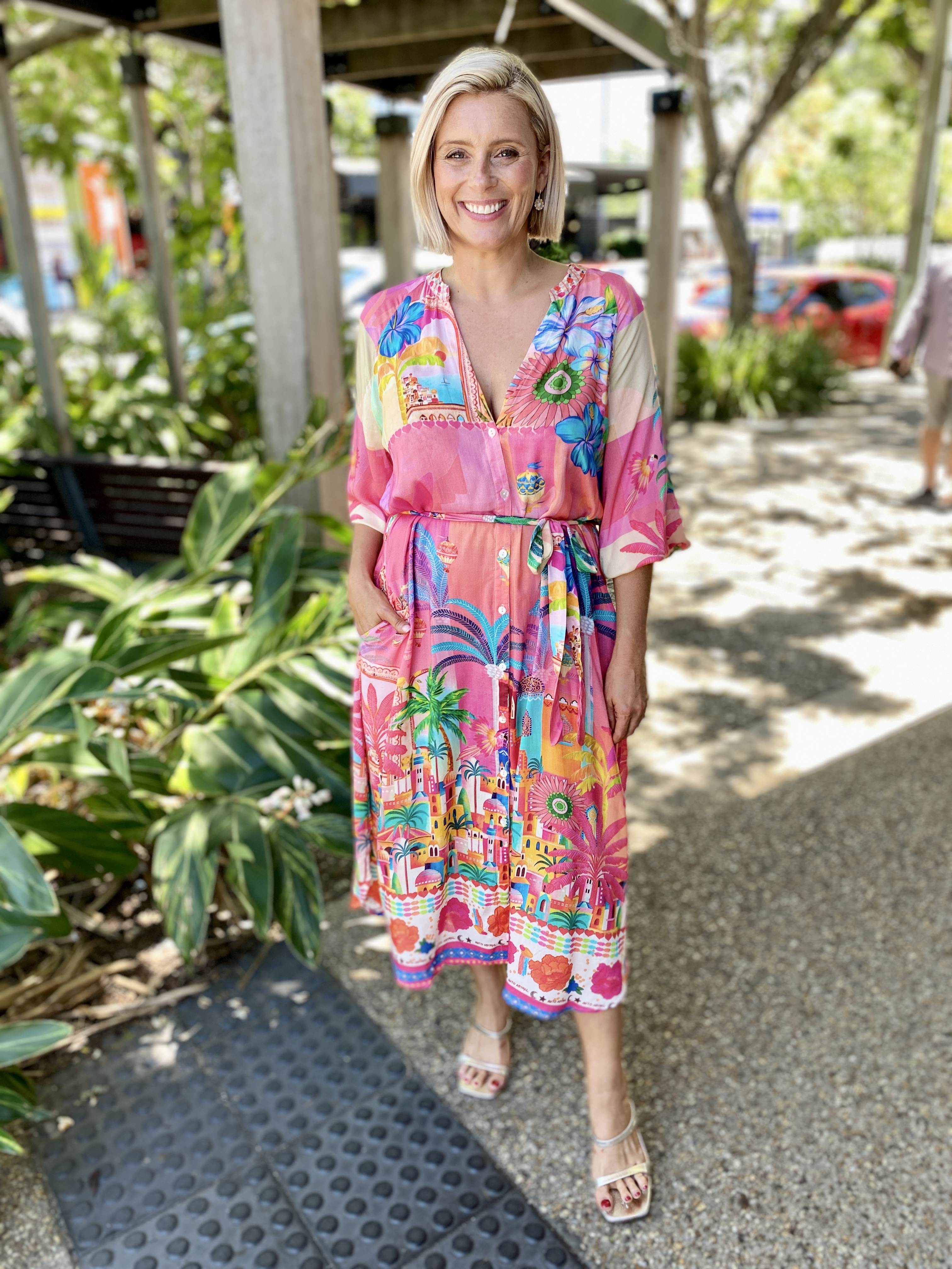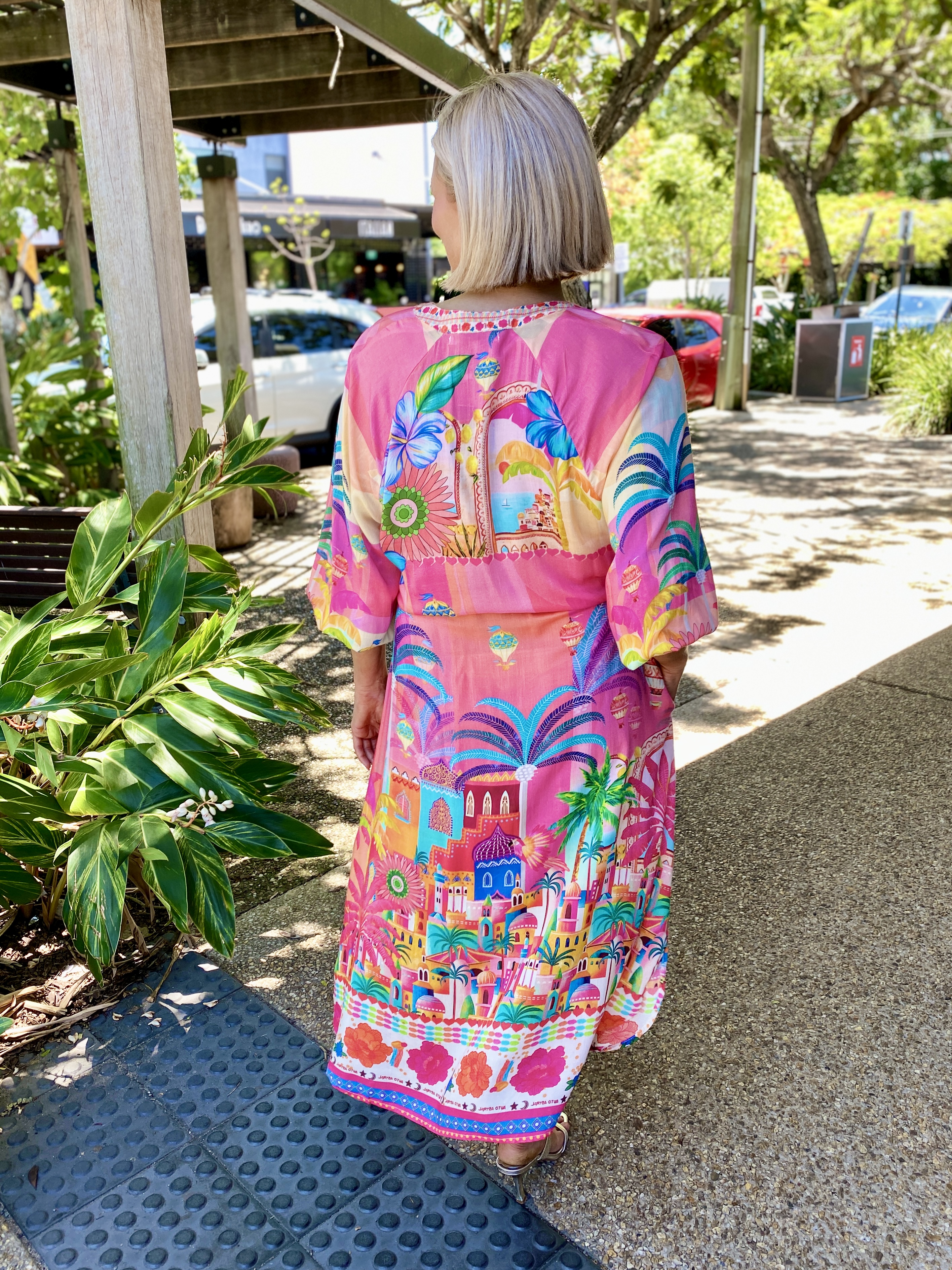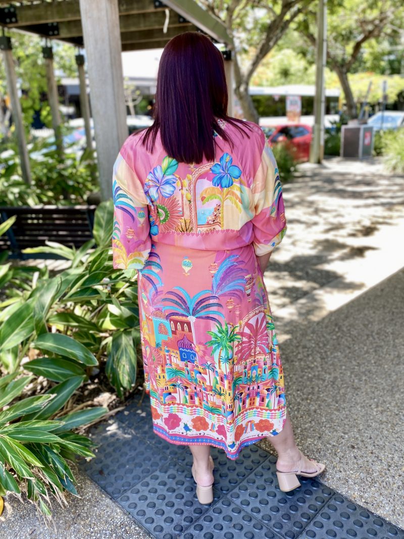 Step into holiday mode with the Mandalay Bay Dress, bursting with tropical charm in a kaleidoscope of pink, turquoise, yellow, and green.