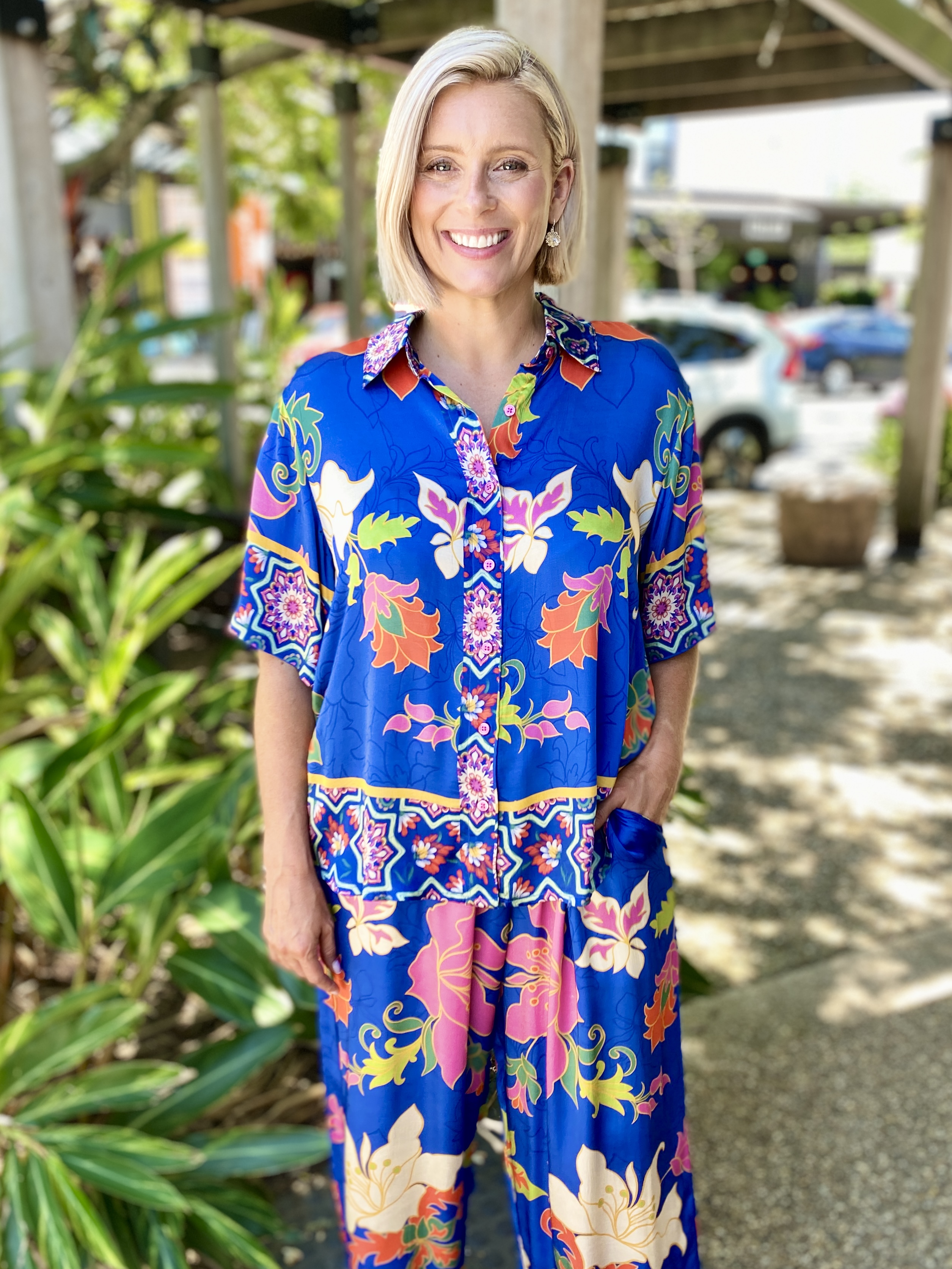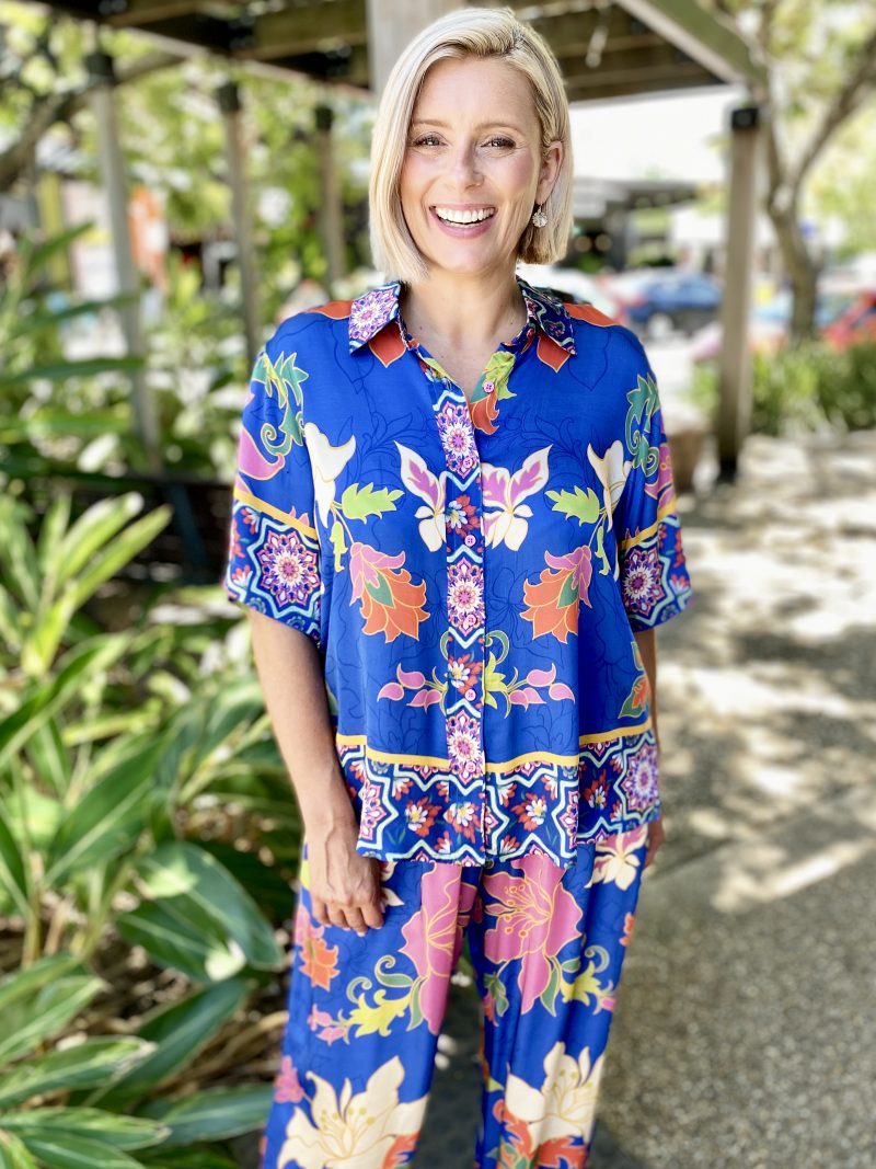 Relaxed, colourful, and beautifully lightweight, the Marquis Top is an easy go-to for warm days and laid-back styling. Crafted from smooth 100% satin modal, it drapes softly with a luxe, silky feel. The collared neckline and button-through front give it a clean, polished look, while the relaxed sleeve and curved hem add comfort and ease. Finished with a vibrant digital print and designed in Australia, this top pairs perfectly with linen, denim, or the matching Marquis Pant for a coordinated, standout outfit.
