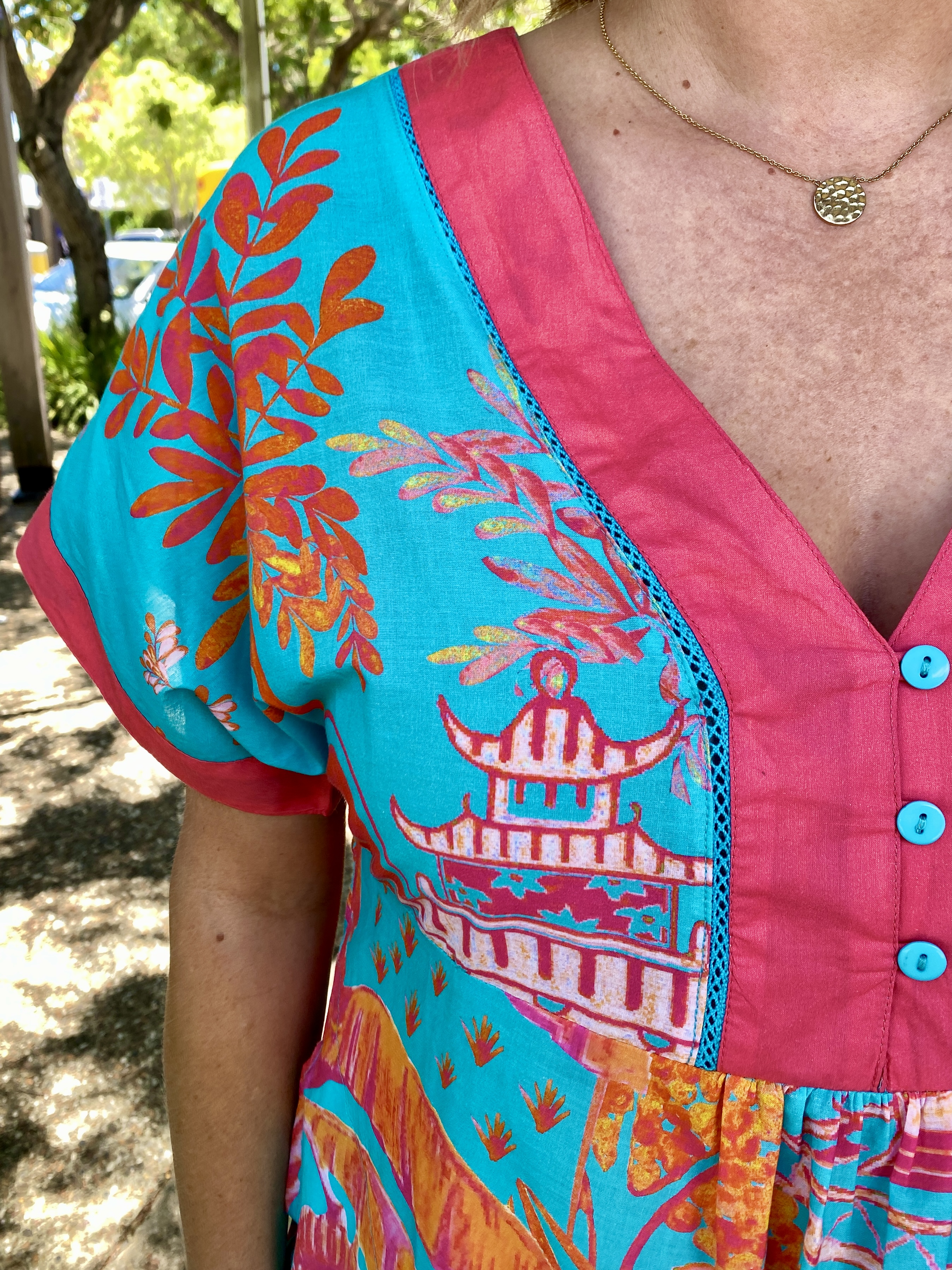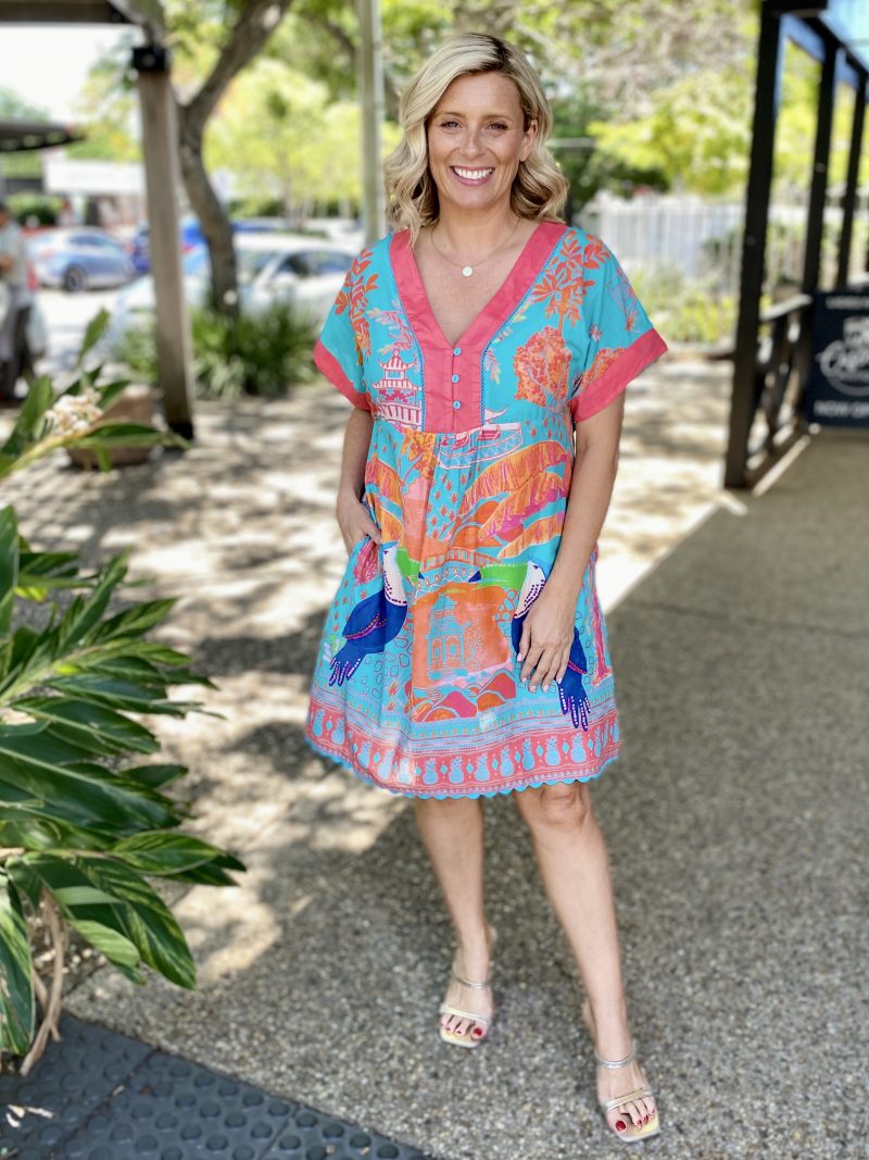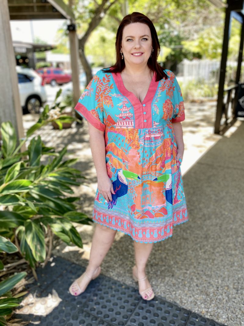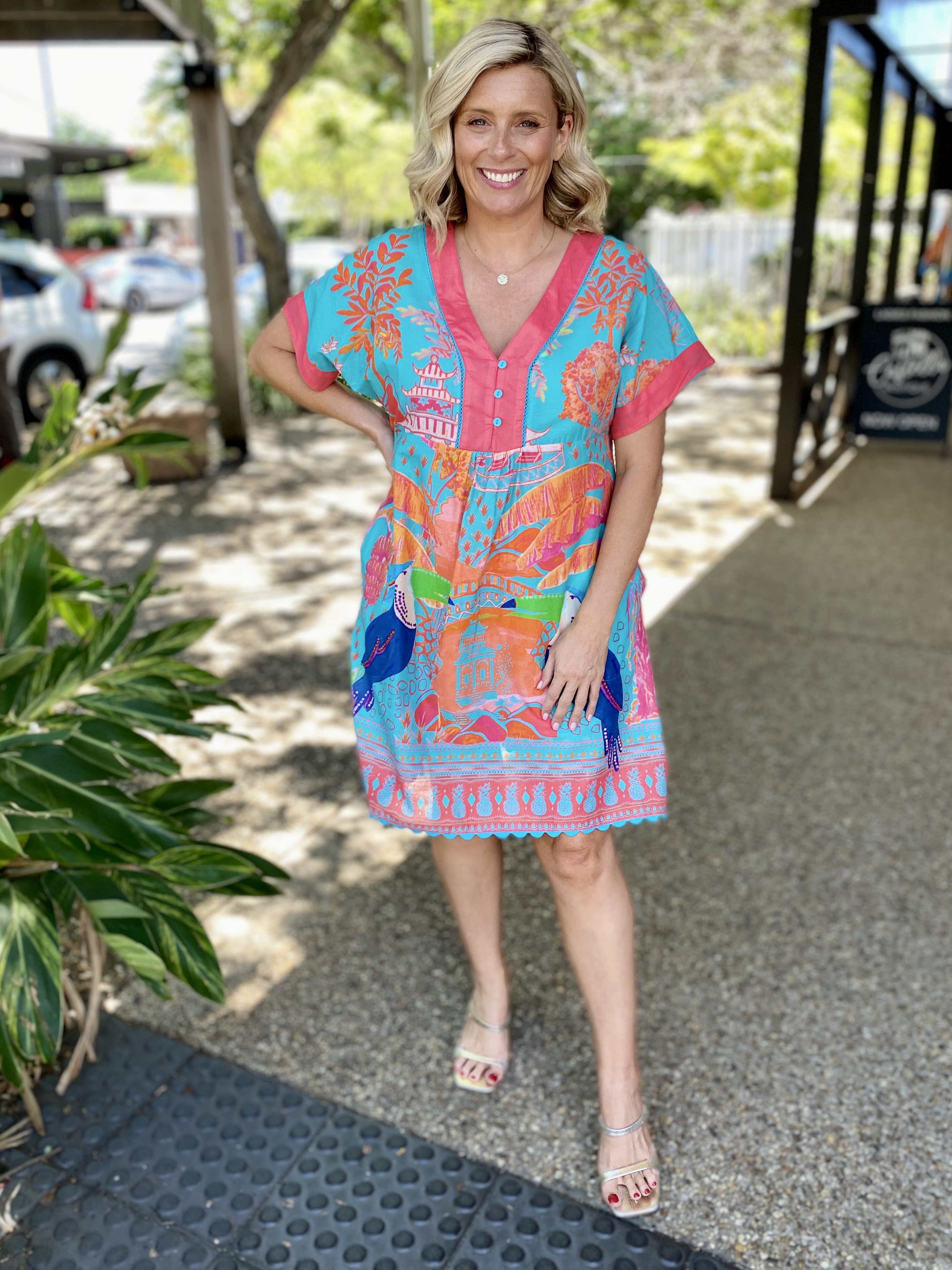 Step into summer with the Marquita Dress, a perfect blend of comfort and style. Crafted from 100% cotton, this knee-length dress features a V-neck with a contrasting band, a front buttoned empire bodice, and a flattering A-line skirt. Practical side pockets make it easy to carry essentials, while the bordered hem adds a touch of elegance.