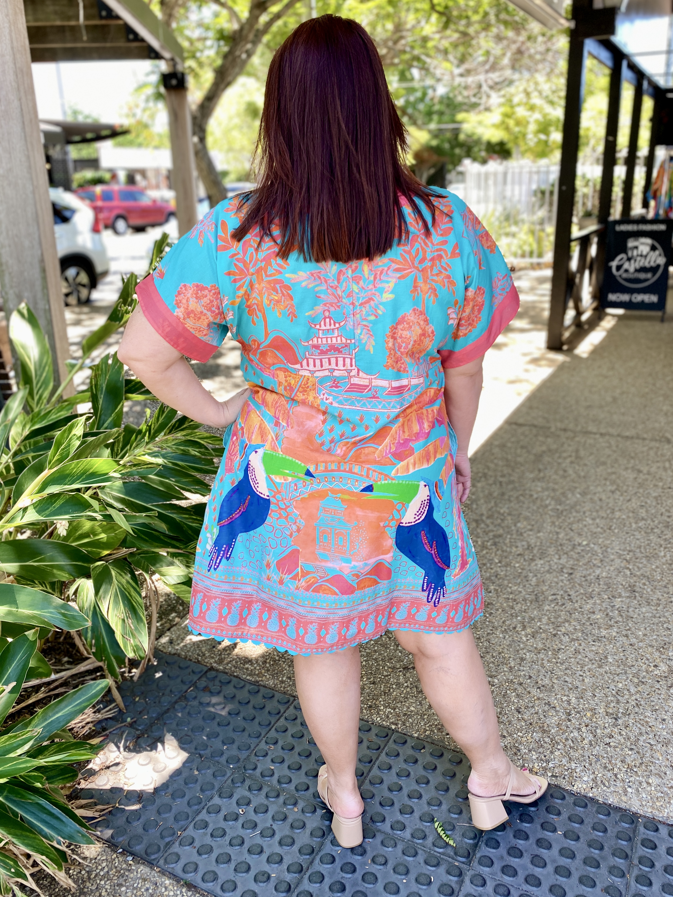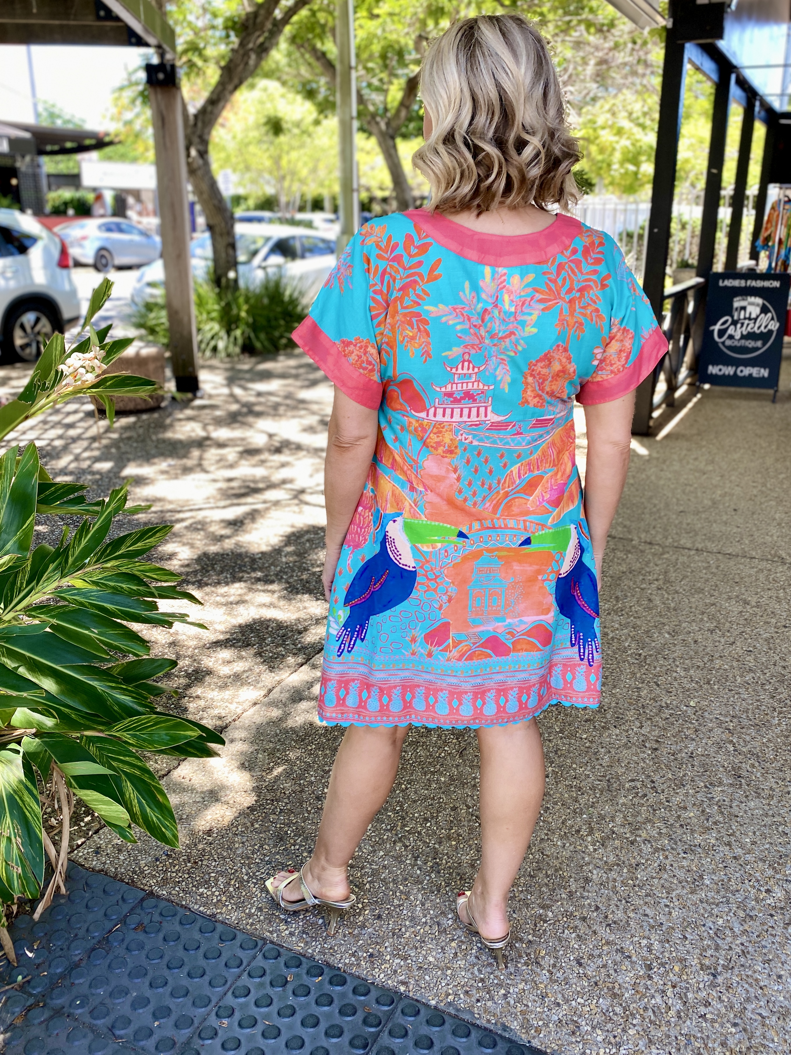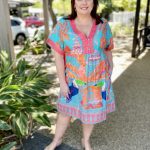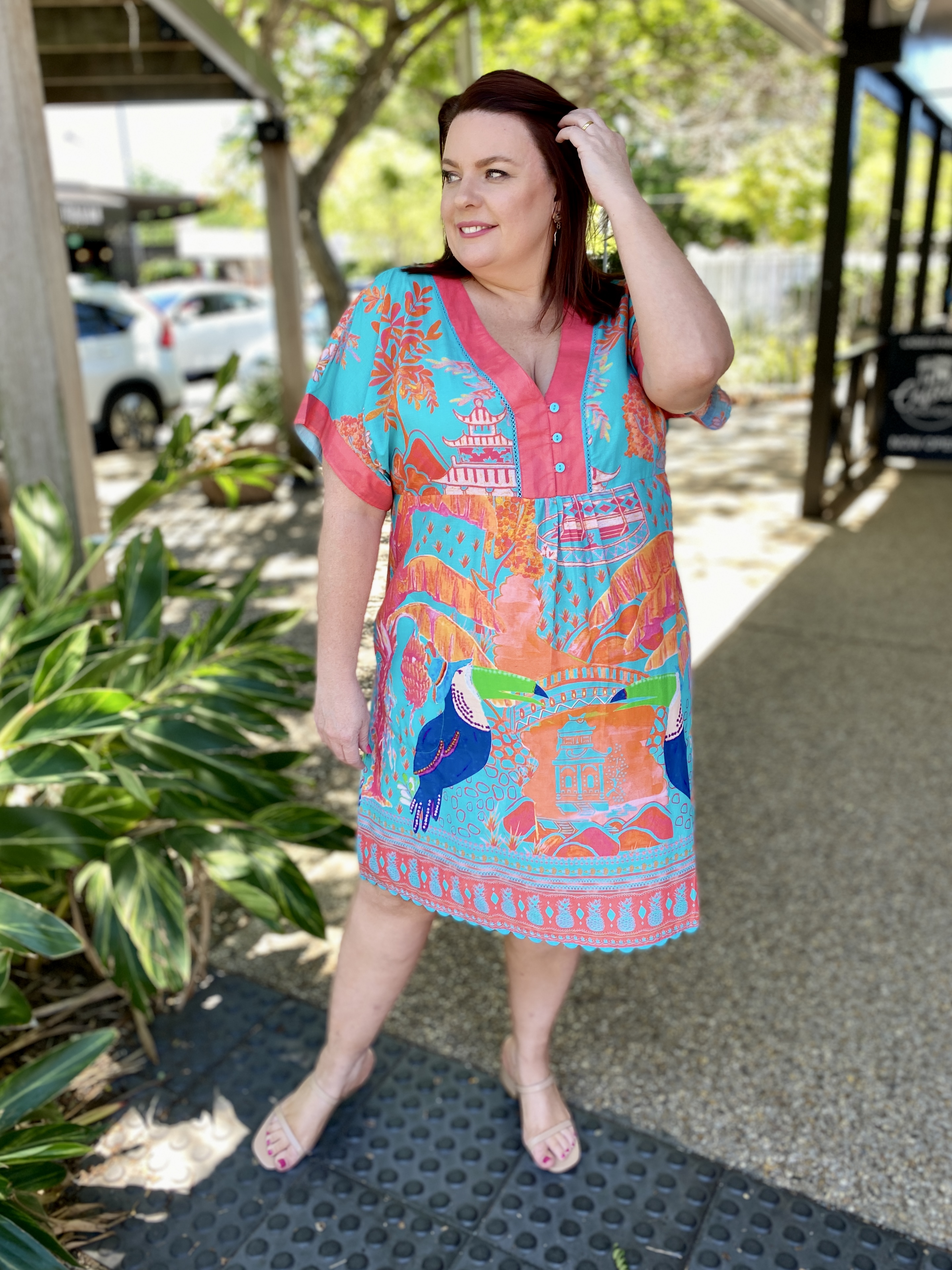 Step into summer with the Marquita Dress, a perfect blend of comfort and style. Crafted from 100% cotton, this knee-length dress features a V-neck with a contrasting band, a front buttoned empire bodice, and a flattering A-line skirt. Practical side pockets make it easy to carry essentials, while the bordered hem adds a touch of elegance.