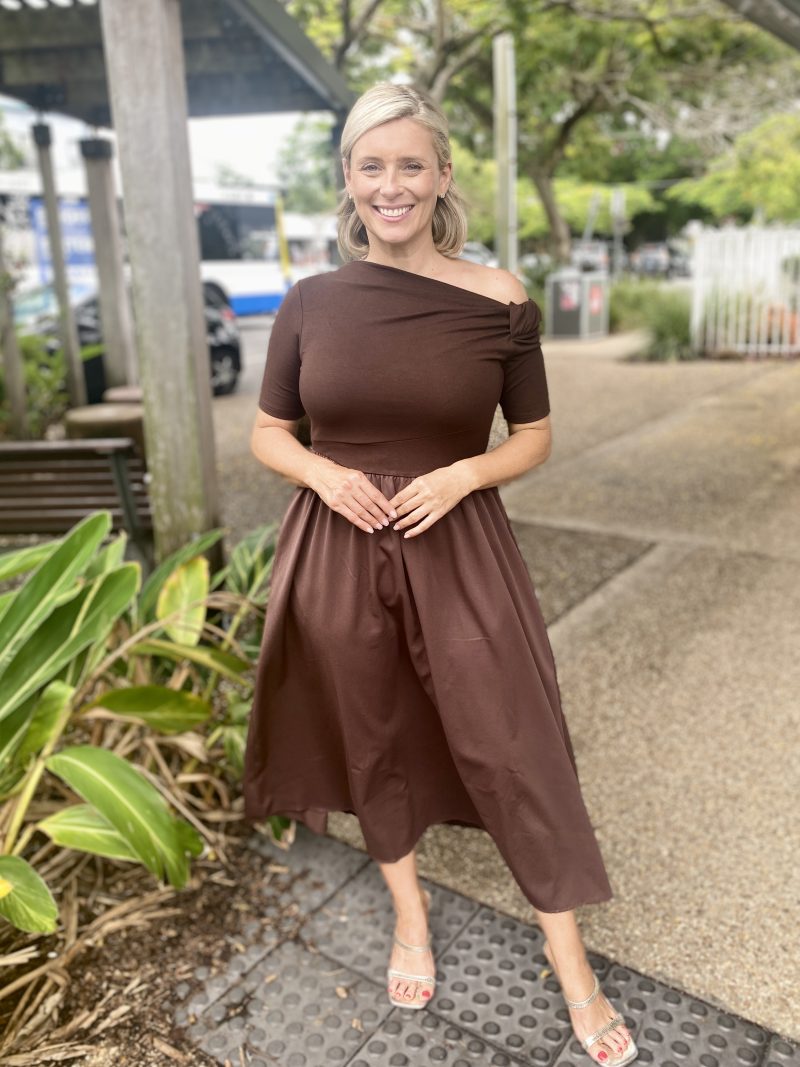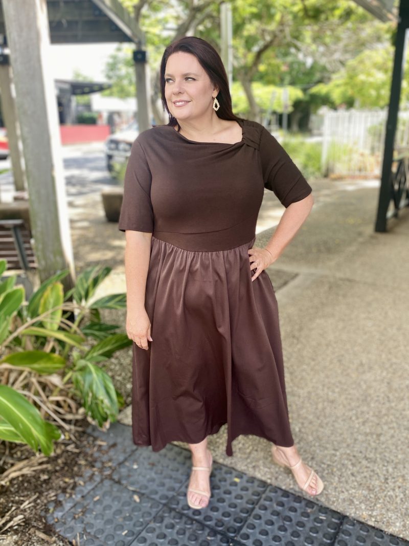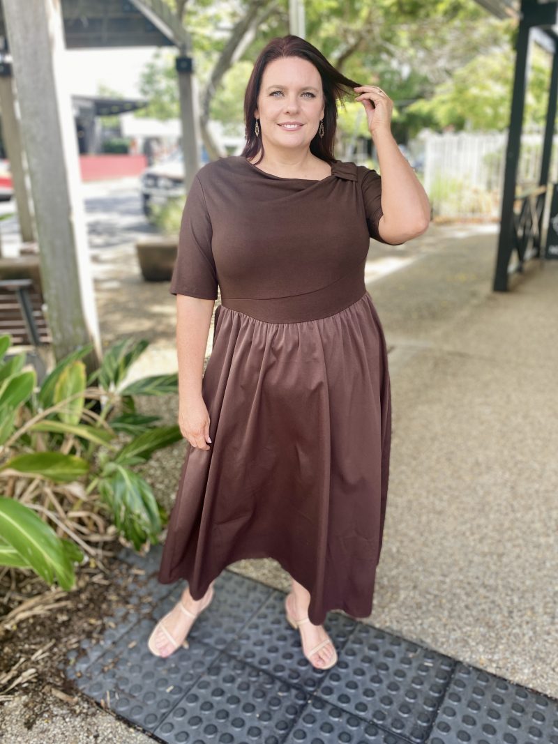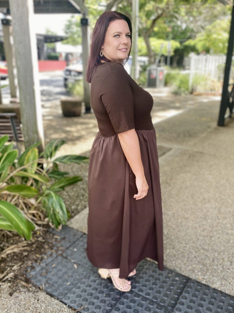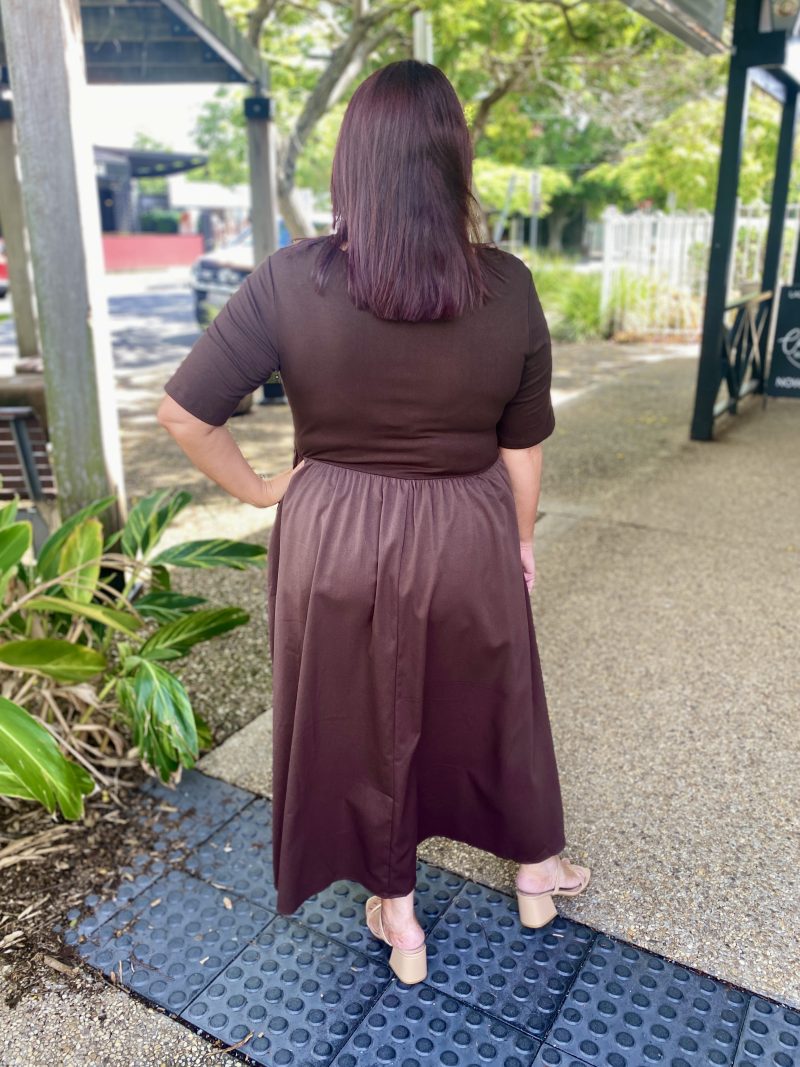 The Miriam Midi Dress in Choc offers effortless sophistication with a flattering fit-and-flare silhouette. Designed in a soft, stretch knit, this midi-length style gently skims the body while providing all-day comfort.