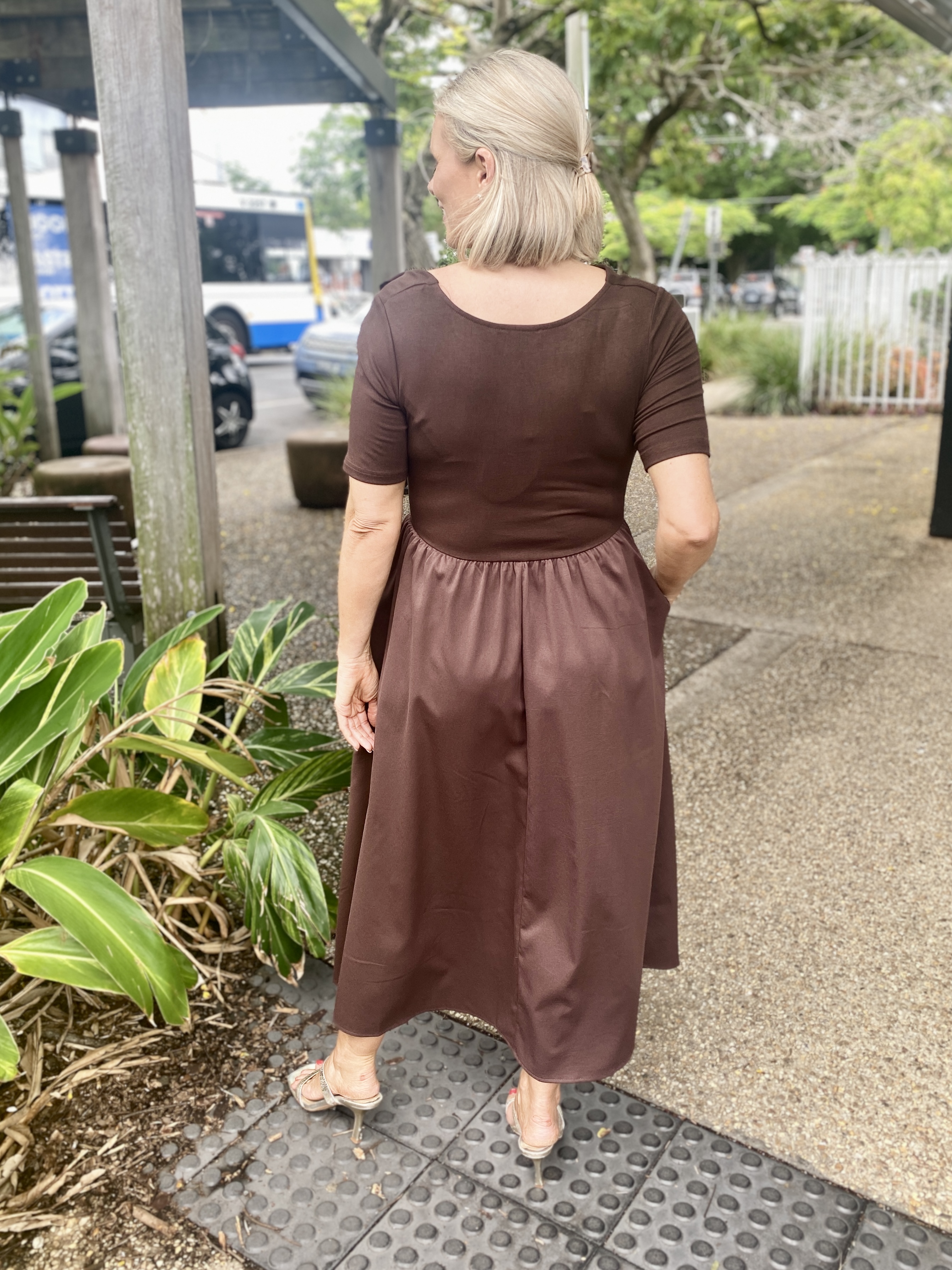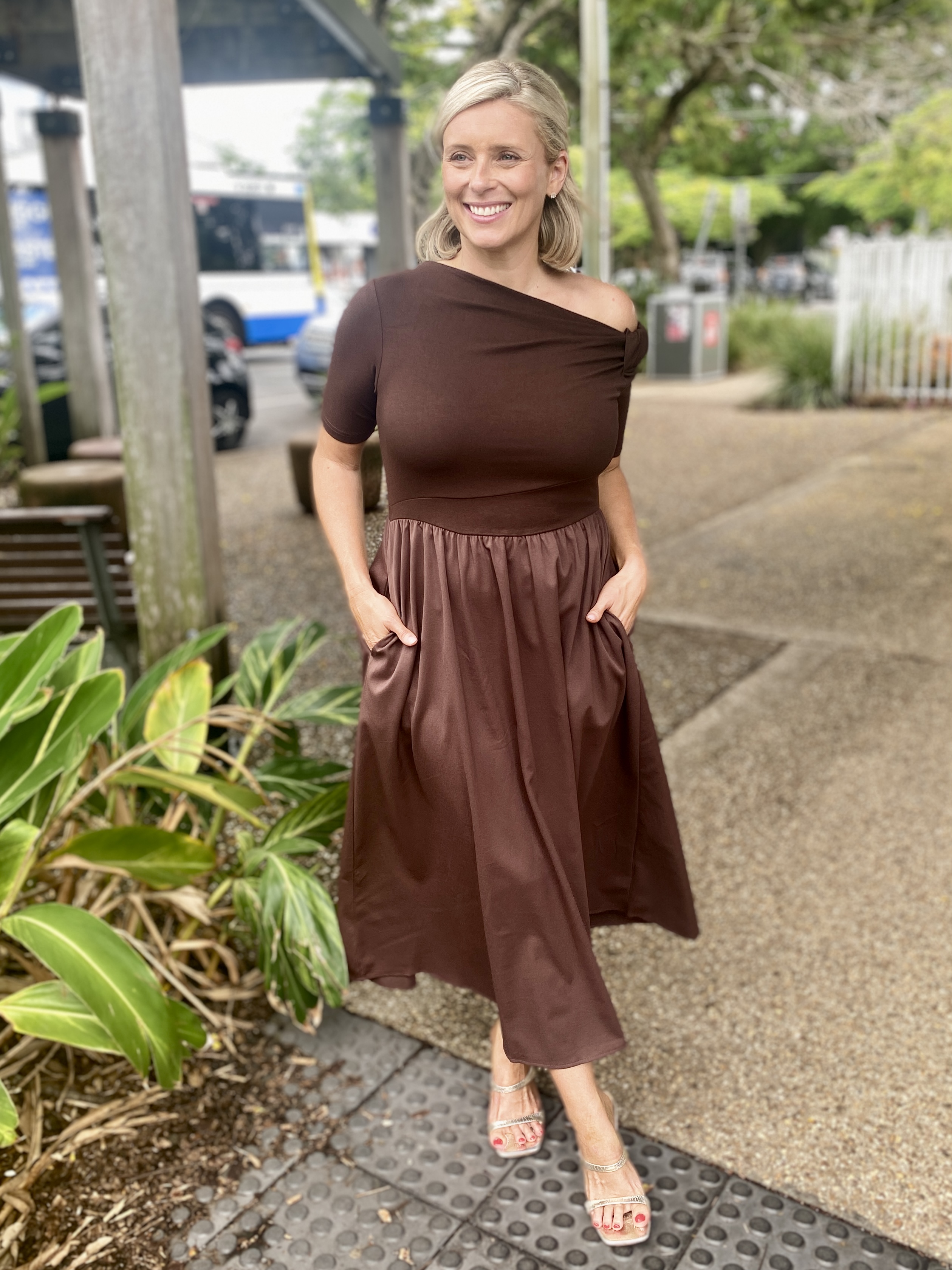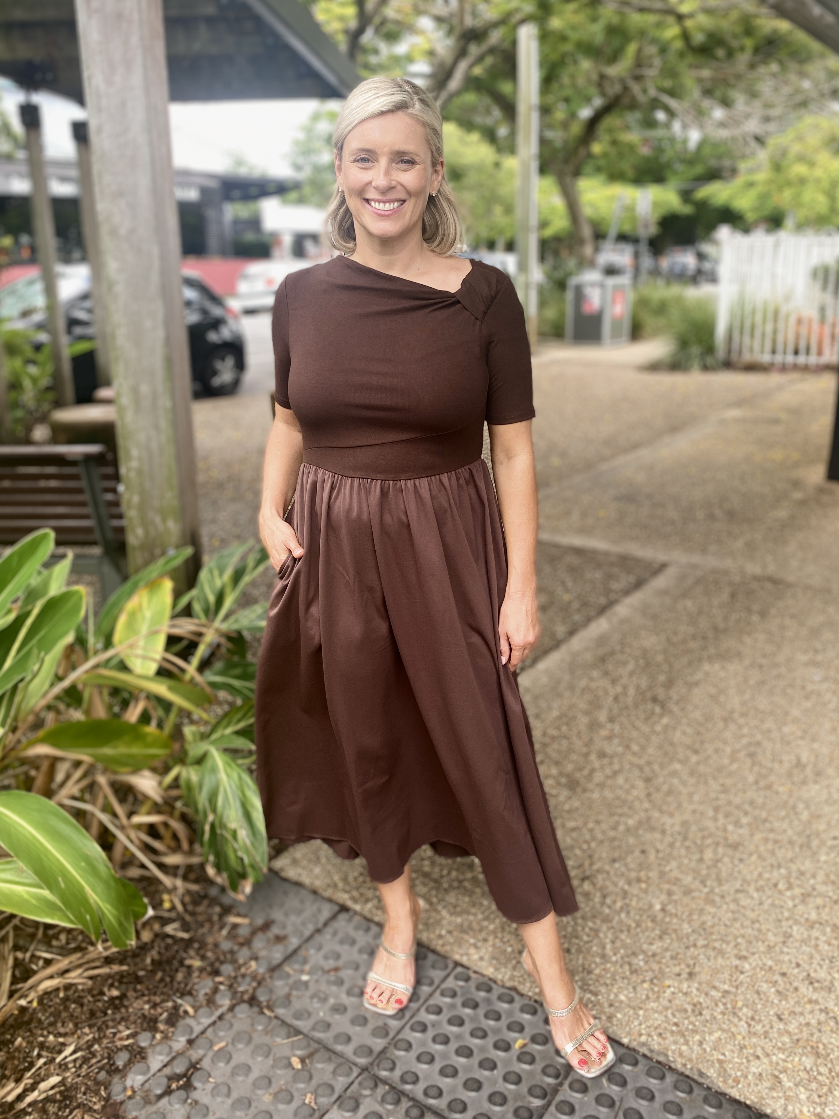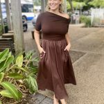 The Miriam Midi Dress in Choc offers effortless sophistication with a flattering fit-and-flare silhouette. Designed in a soft, stretch knit, this midi-length style gently skims the body while providing all-day comfort.