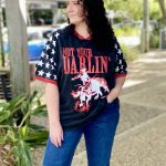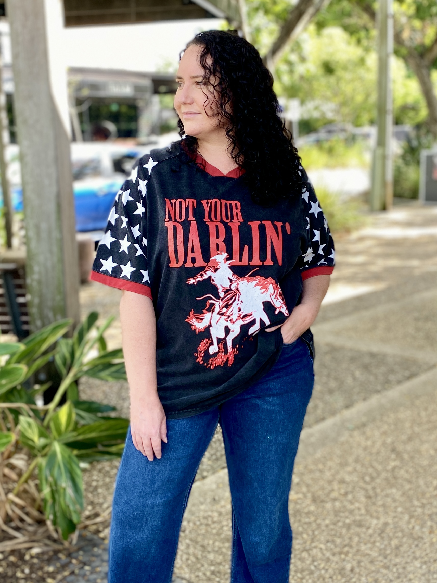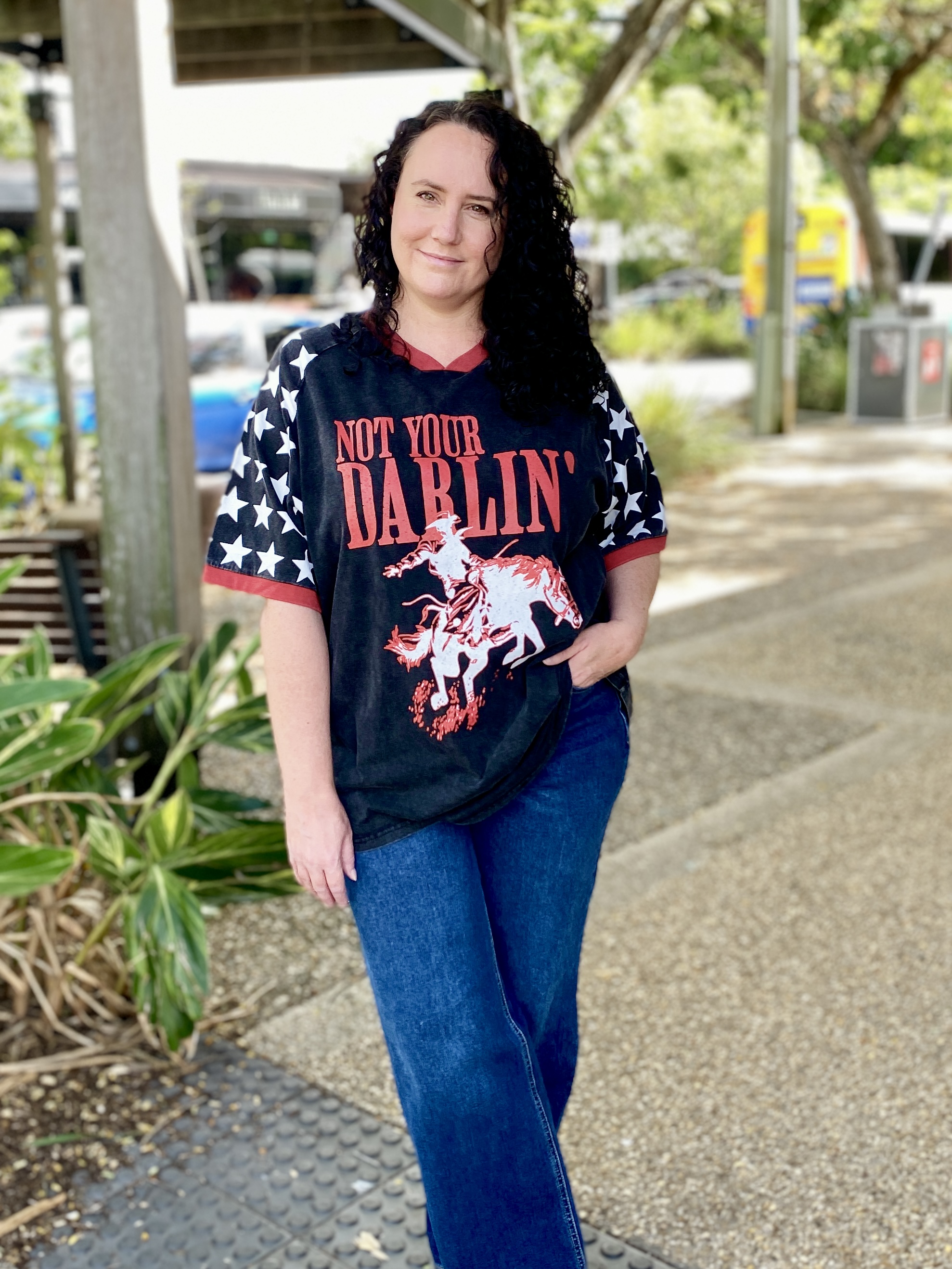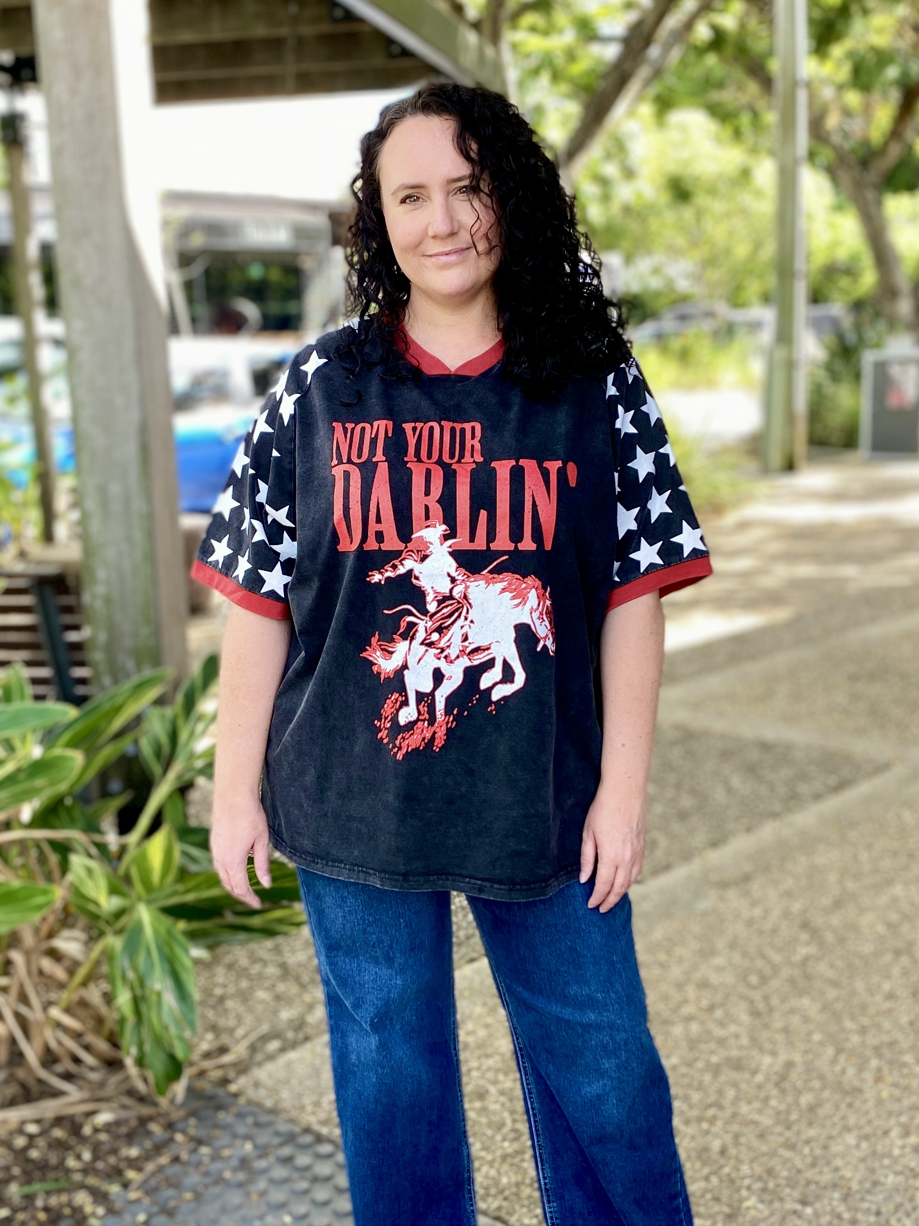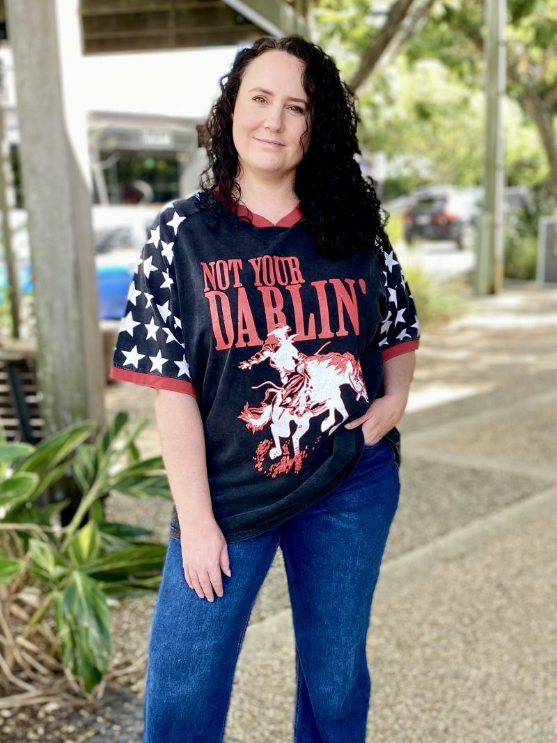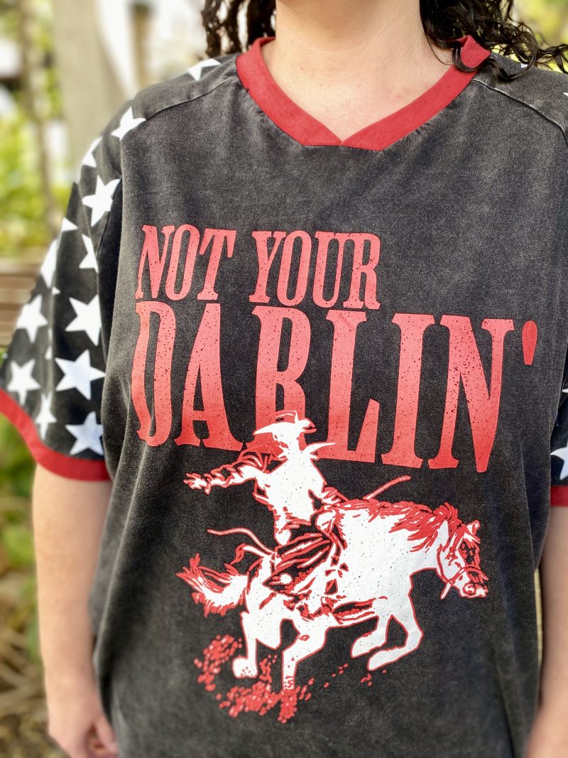 Add a bold touch to your casual rotation with the Not Your Darlin’ graphic oversized T-shirt. Made from a cotton material with an oversized fit and graphic print, it’s perfect for off-duty days. Style with shorts, gold earrings and sneakers for a relaxed look.