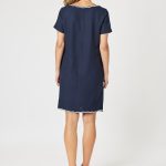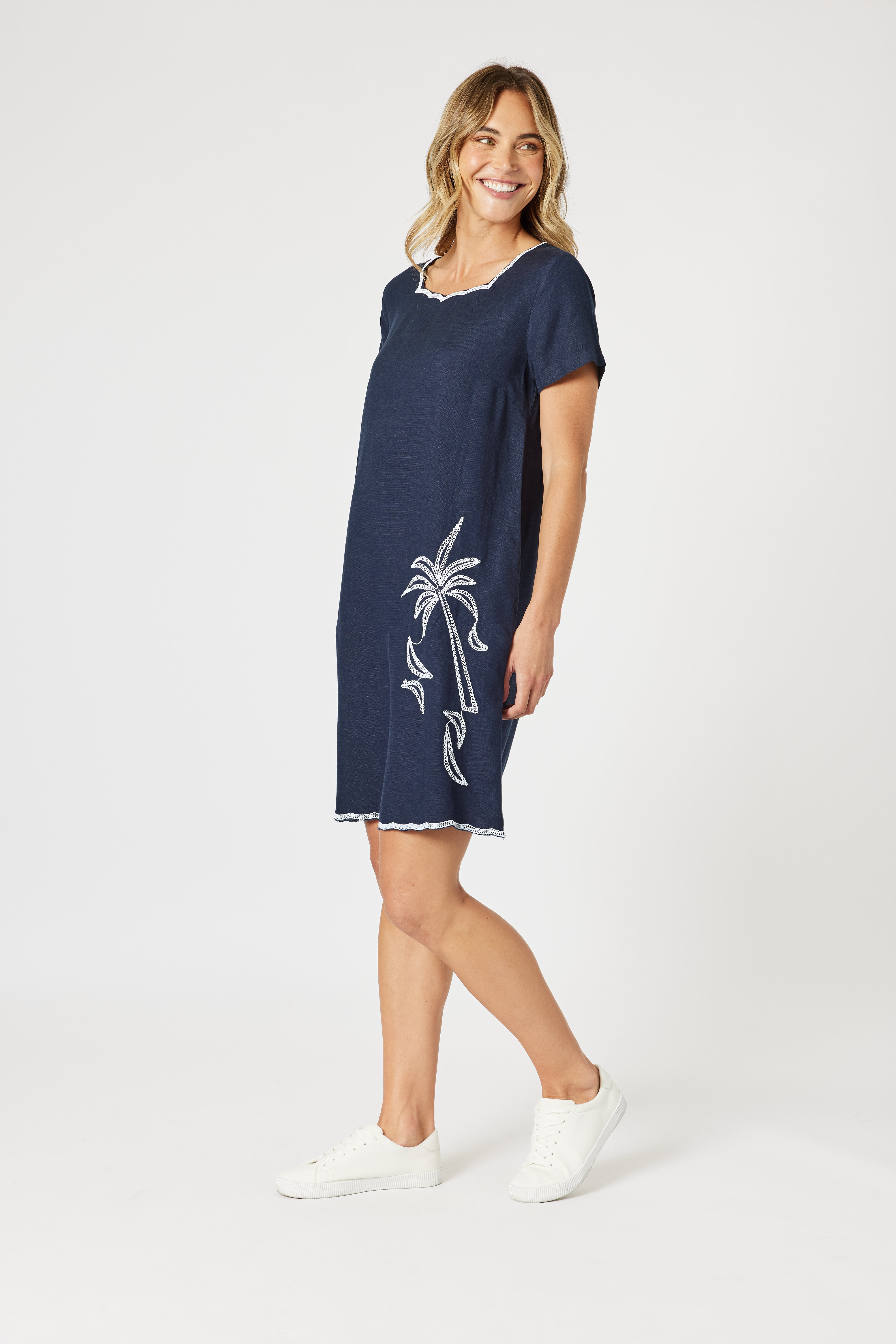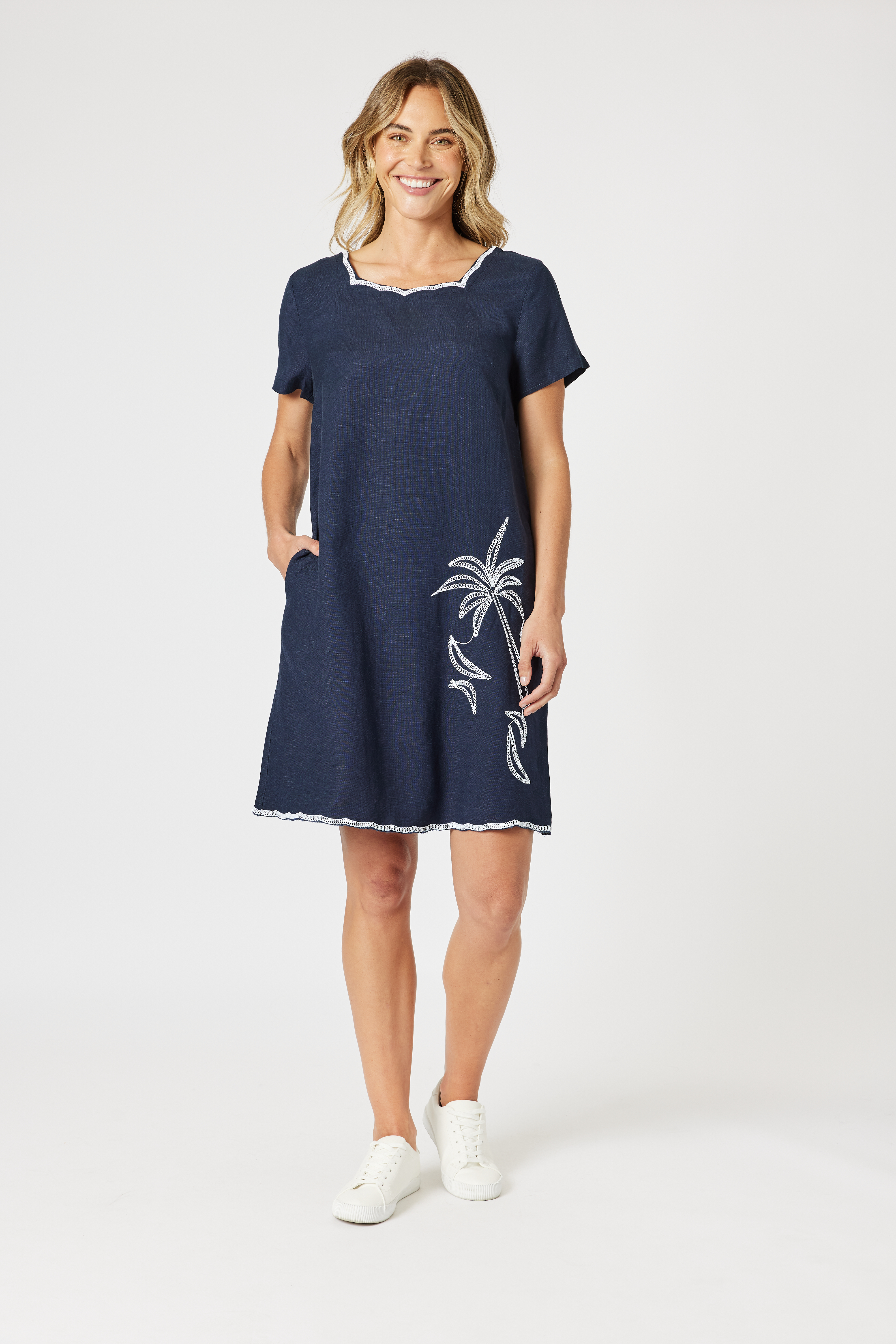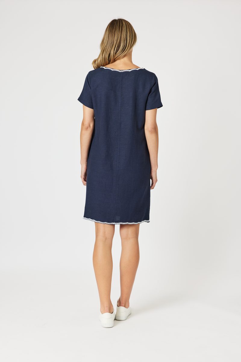 Crafted from lightweight linen blend, it features a classic neckline and hem, both enhanced with unique scallop-pattern embroidery.