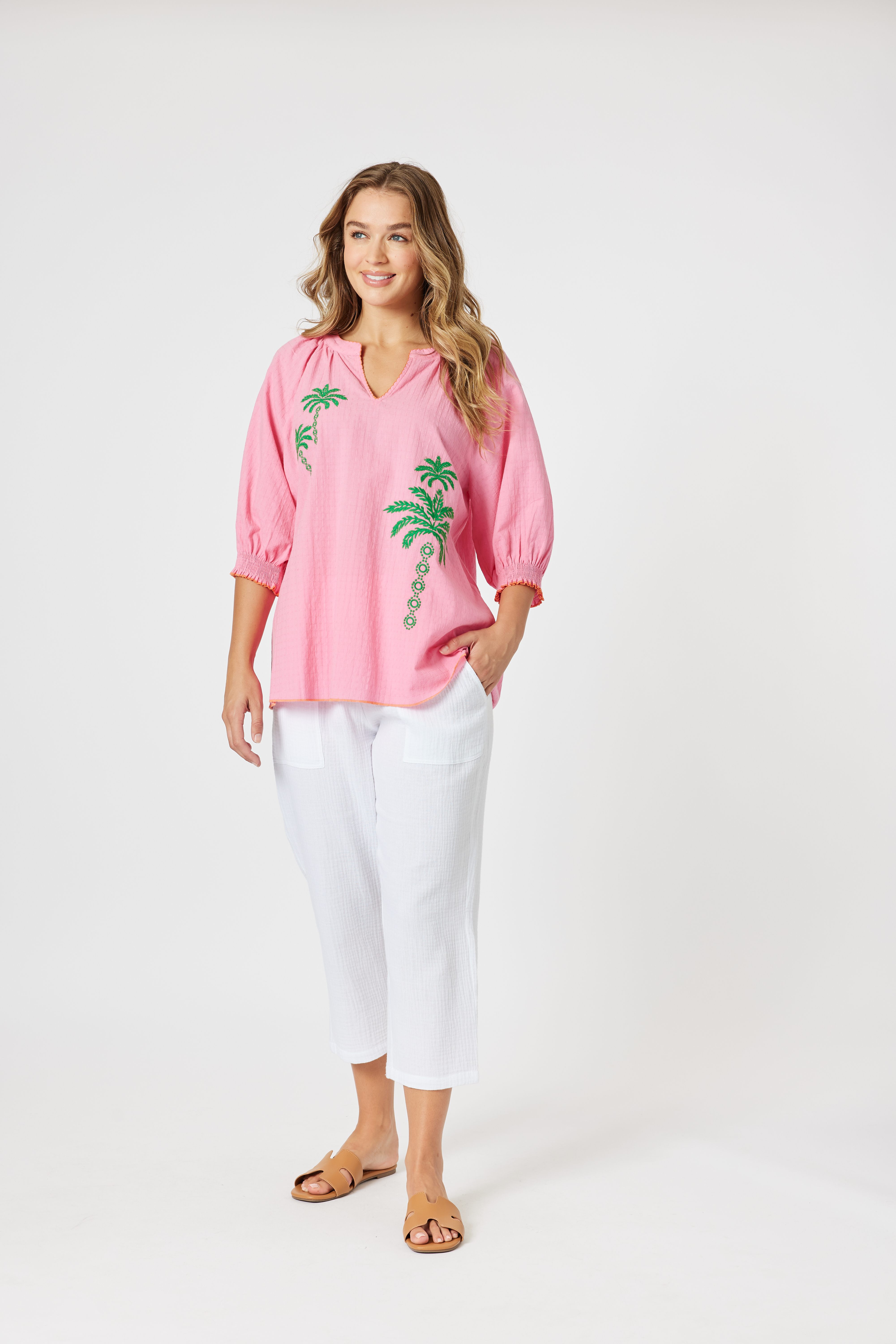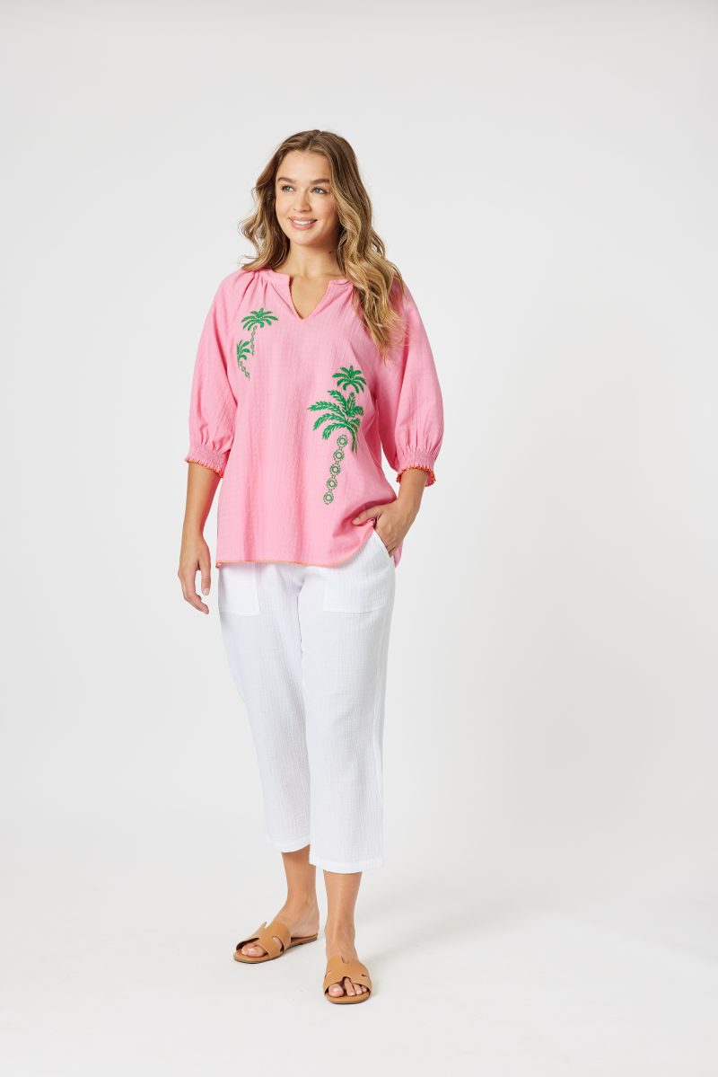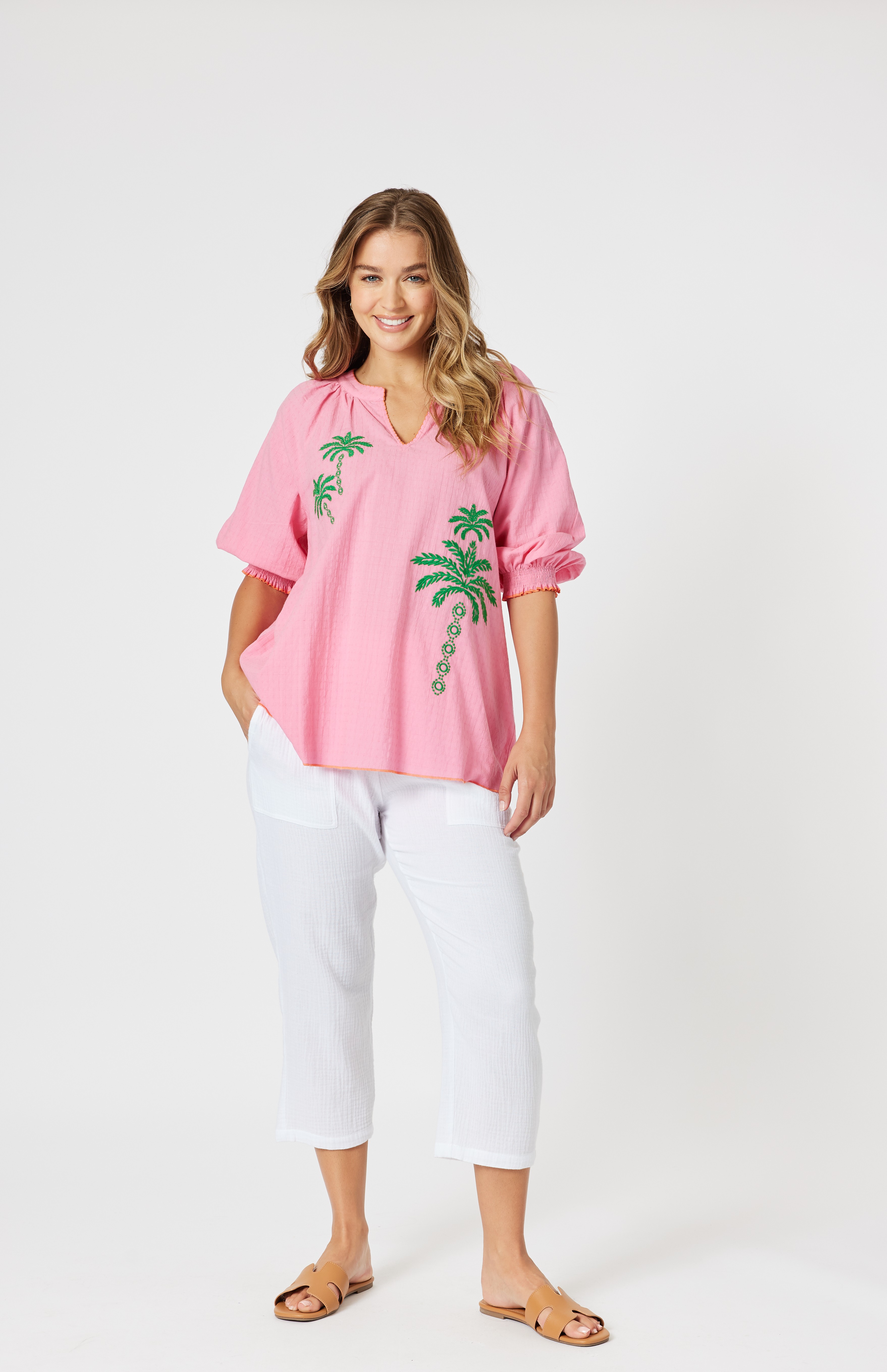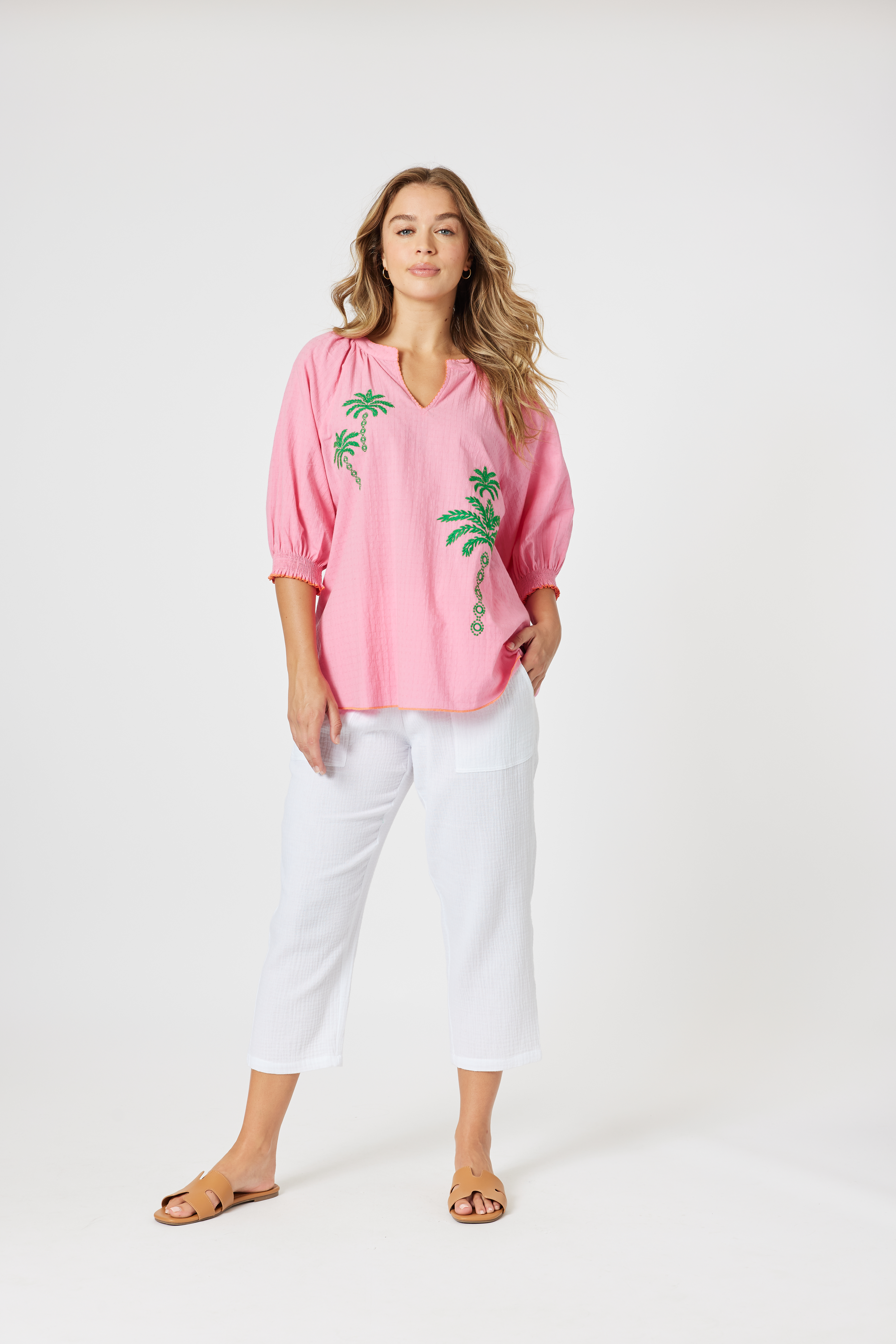 Add a playful splash of the tropics to your wardrobe with the Pina Colada Embroidered Top.