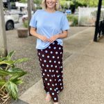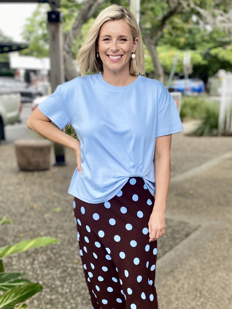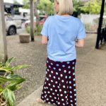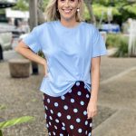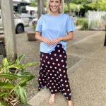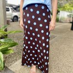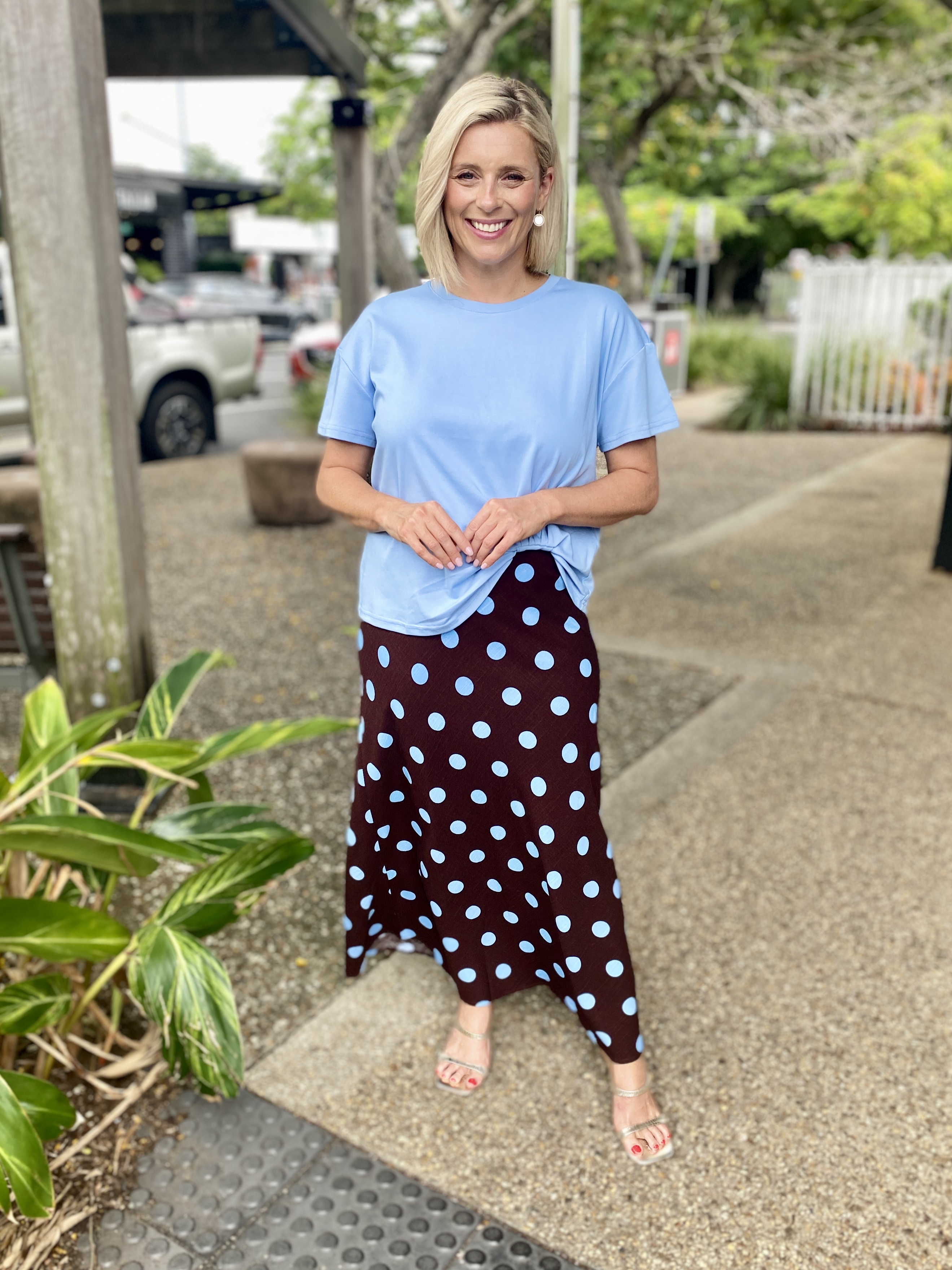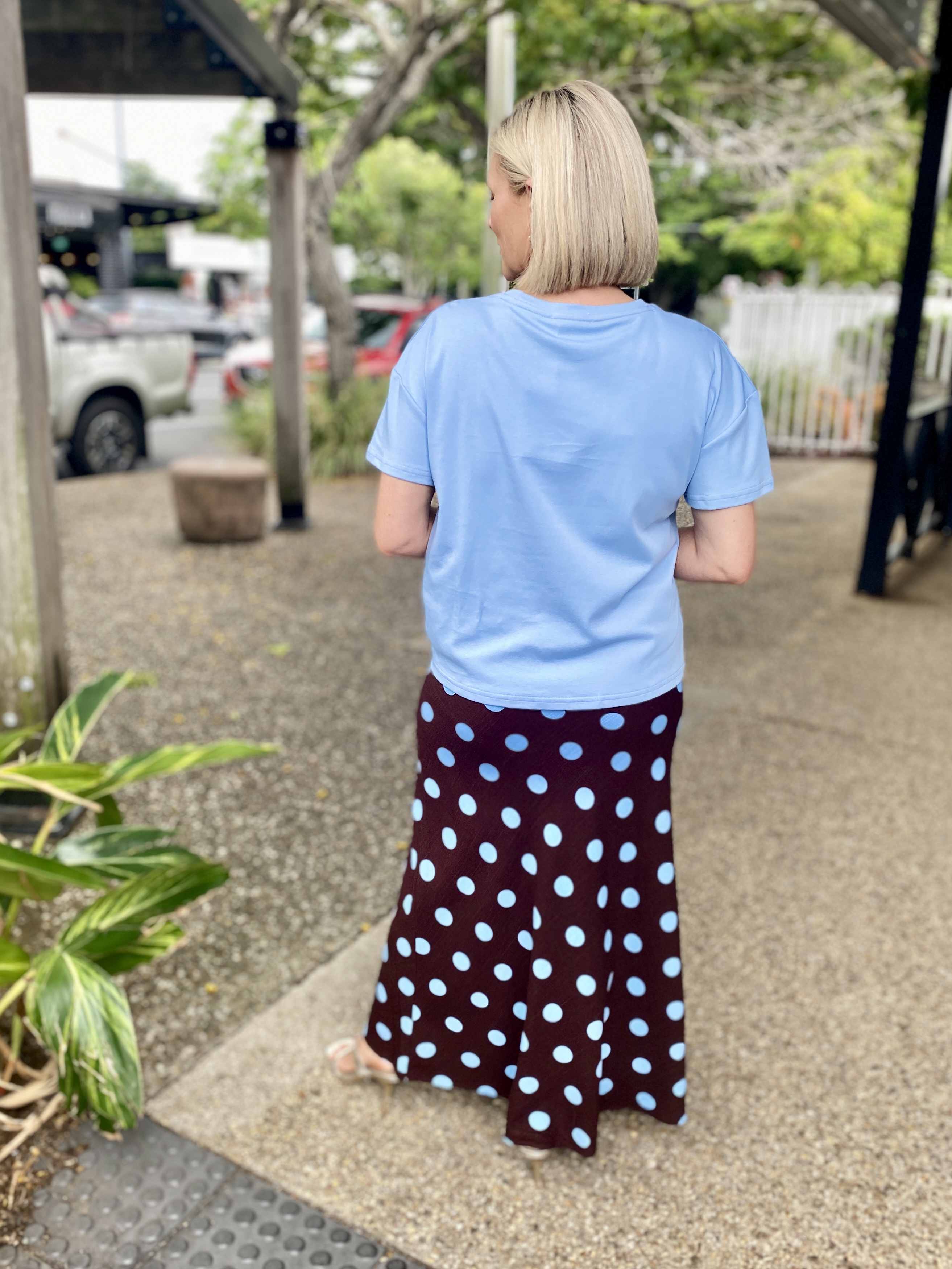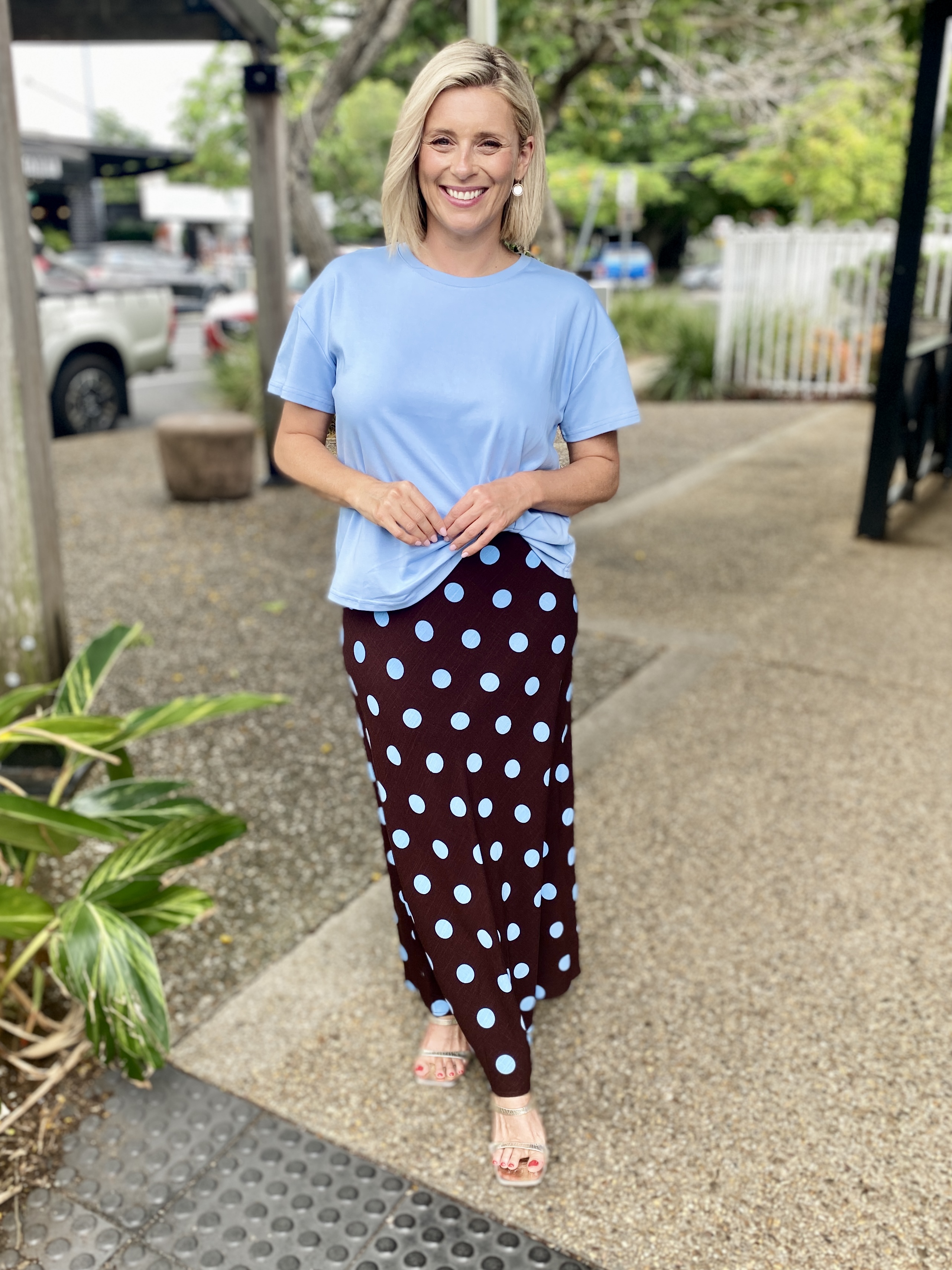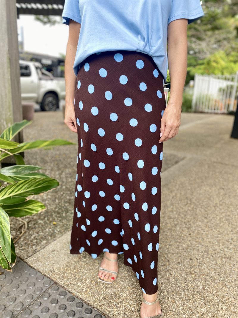 The Sabrina Maxi Skirt in Choc with blue spots is a fresh, feminine style designed for sunlit days and garden gatherings. With its choc base and spotty print, it delivers a breezy elegance that feels polished yet easy to wear.