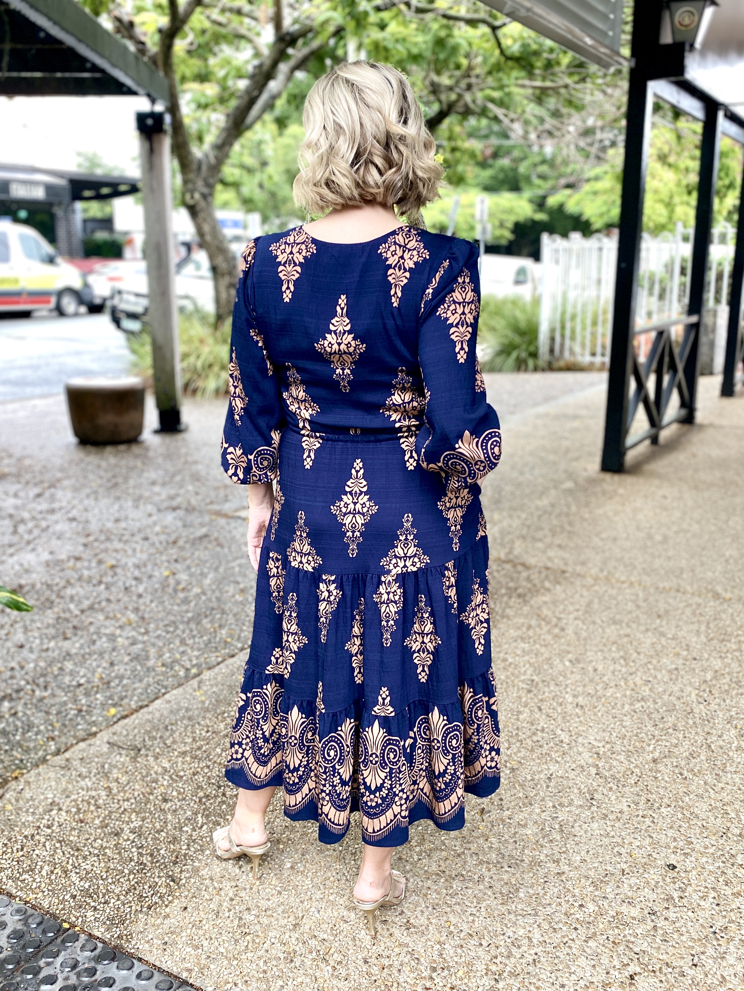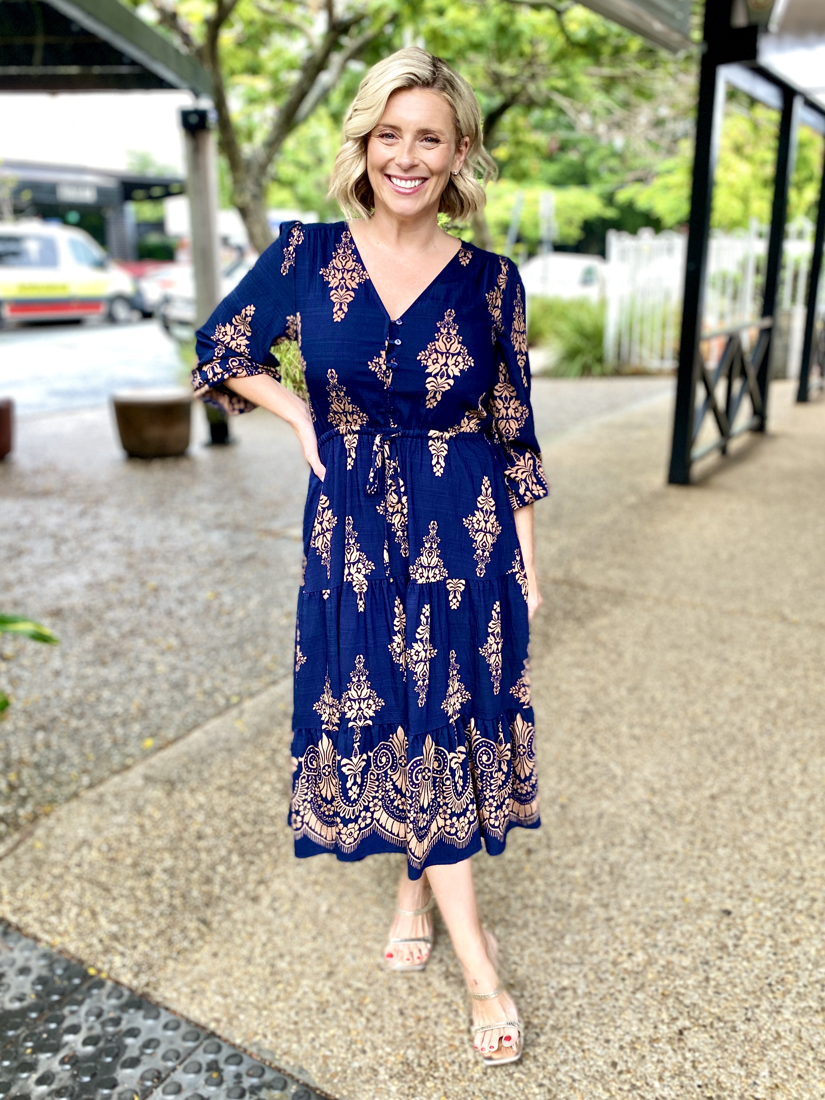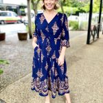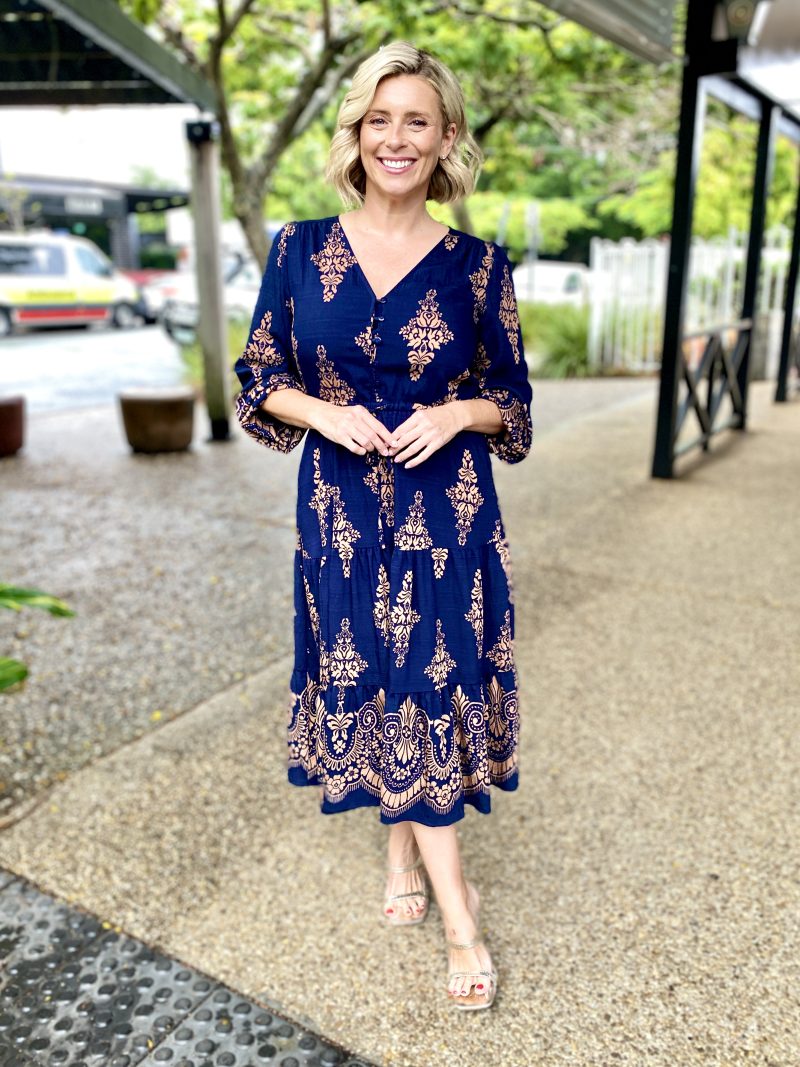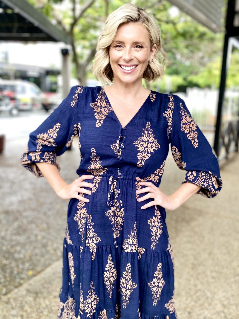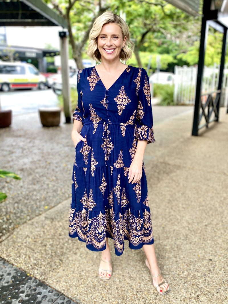Modern yet timeless, the Saffron Midi Dress in Navy with tan print is a go to piece for workdays, events and everything in between. Designed in breathable fabric with an effortless drape, this midi is both polished and practical.