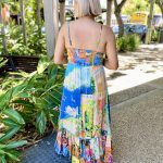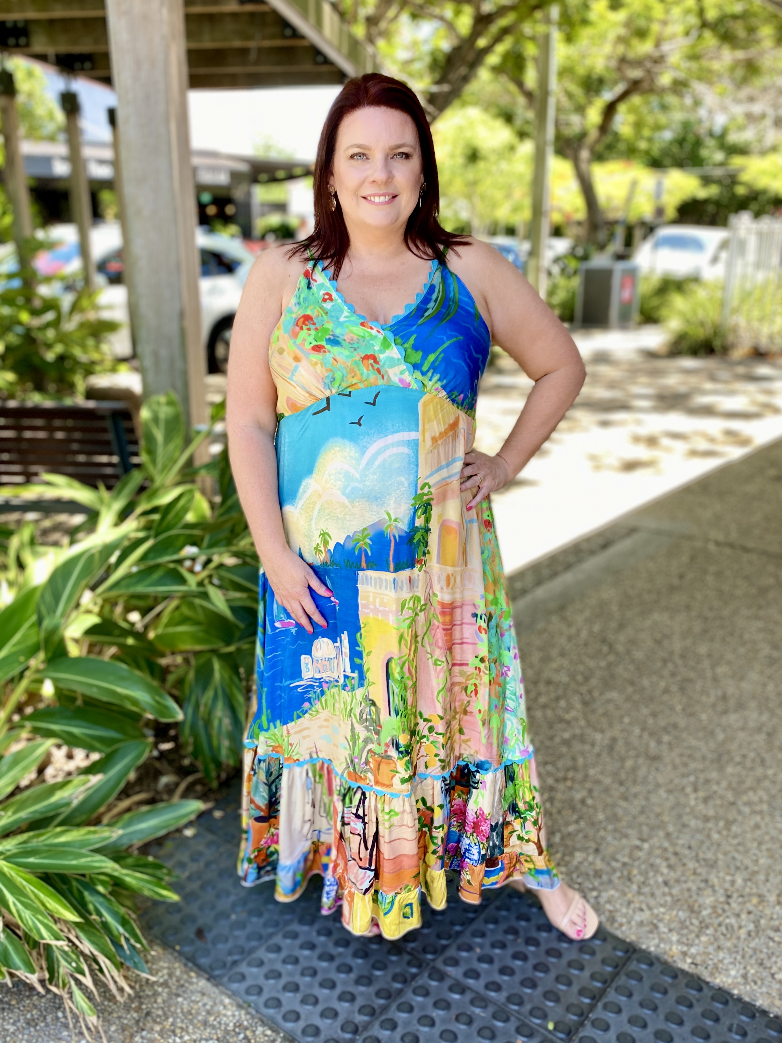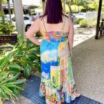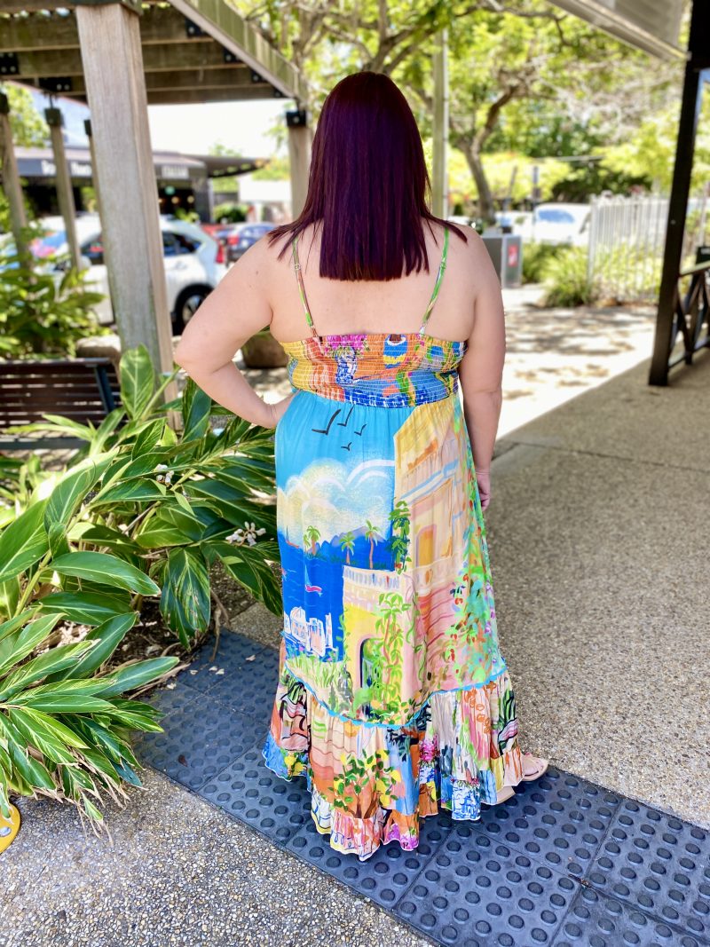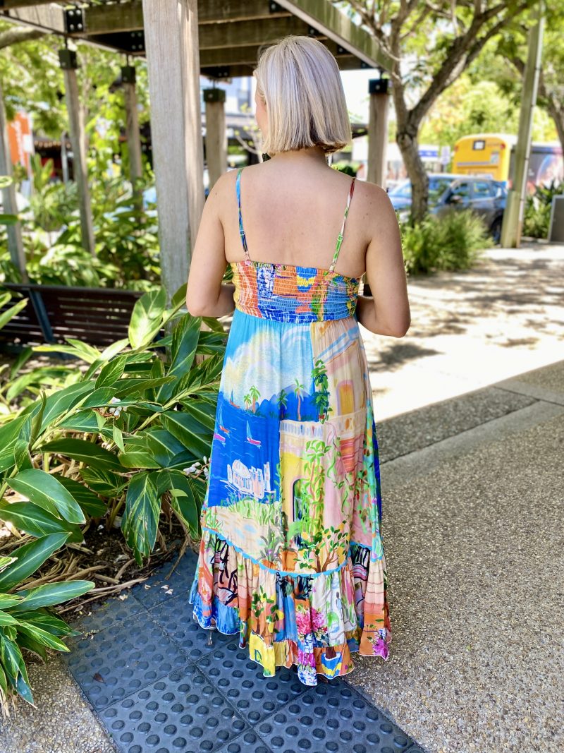 Begin your next chapter with the whispering Sardinia Sundress. Featuring flattering triangle panels at the bust, shirring at the back, maxi length skirt, and frill hem, this dress is a classic silhouette. The gorgeous colour and waterscape and terracotta garden print makes this dress the perfect option for any occasion this summer!