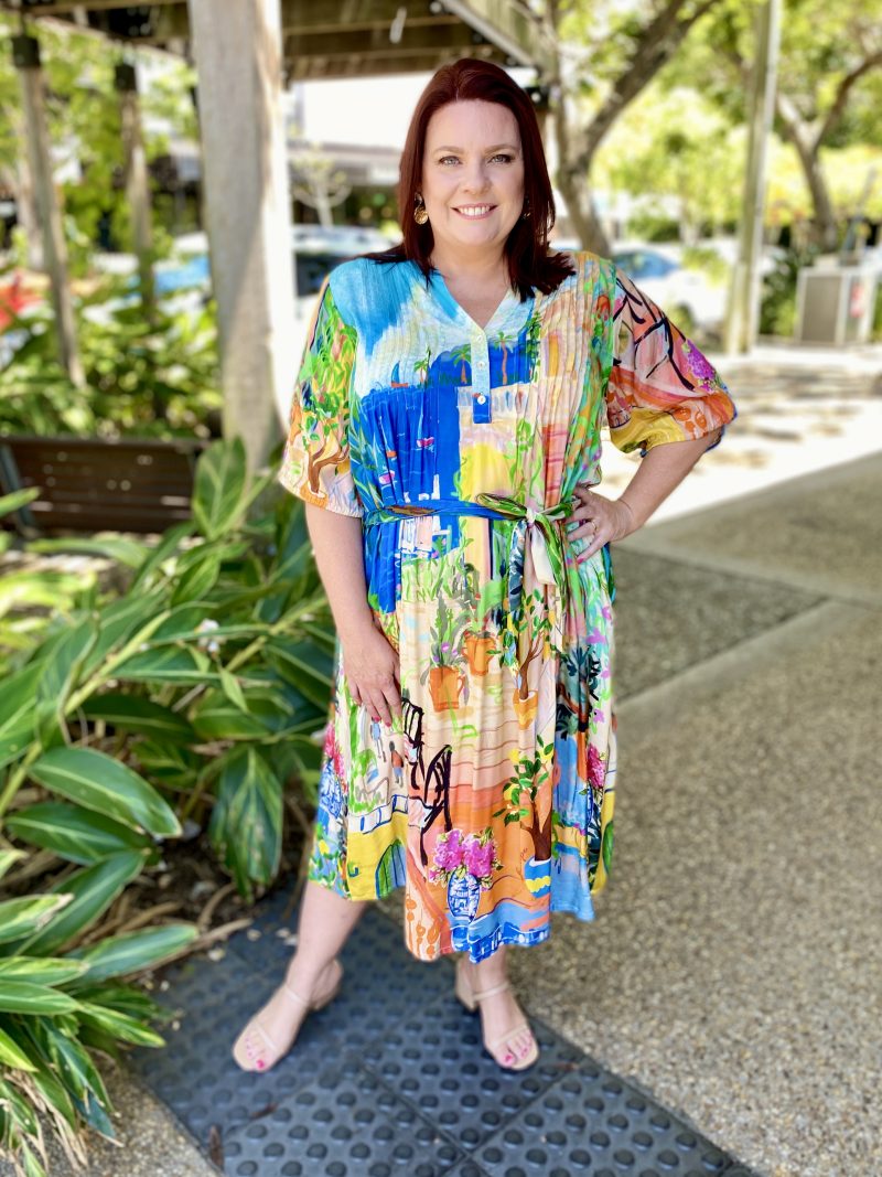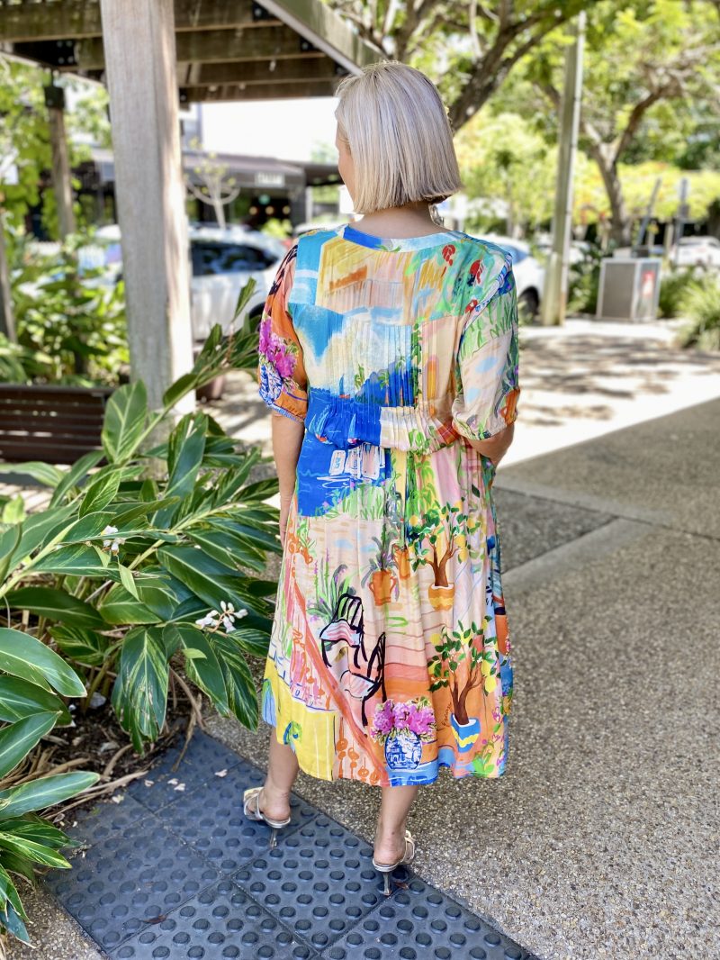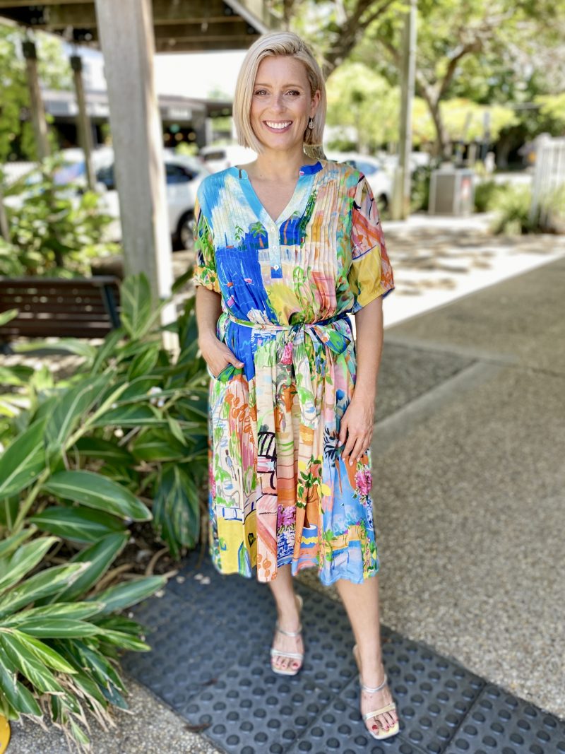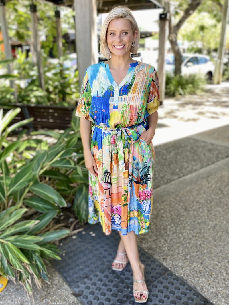 Answer the call of adventure in the waterscape and terracotta gardens that feature in the Sardinia Tie Waist Dress. You can let your elegance bloom. Captured in this beautiful design is the light and soft touches of a gathered half sleeve, fabric waist tie and light pleating.