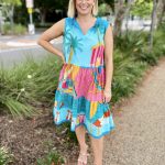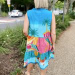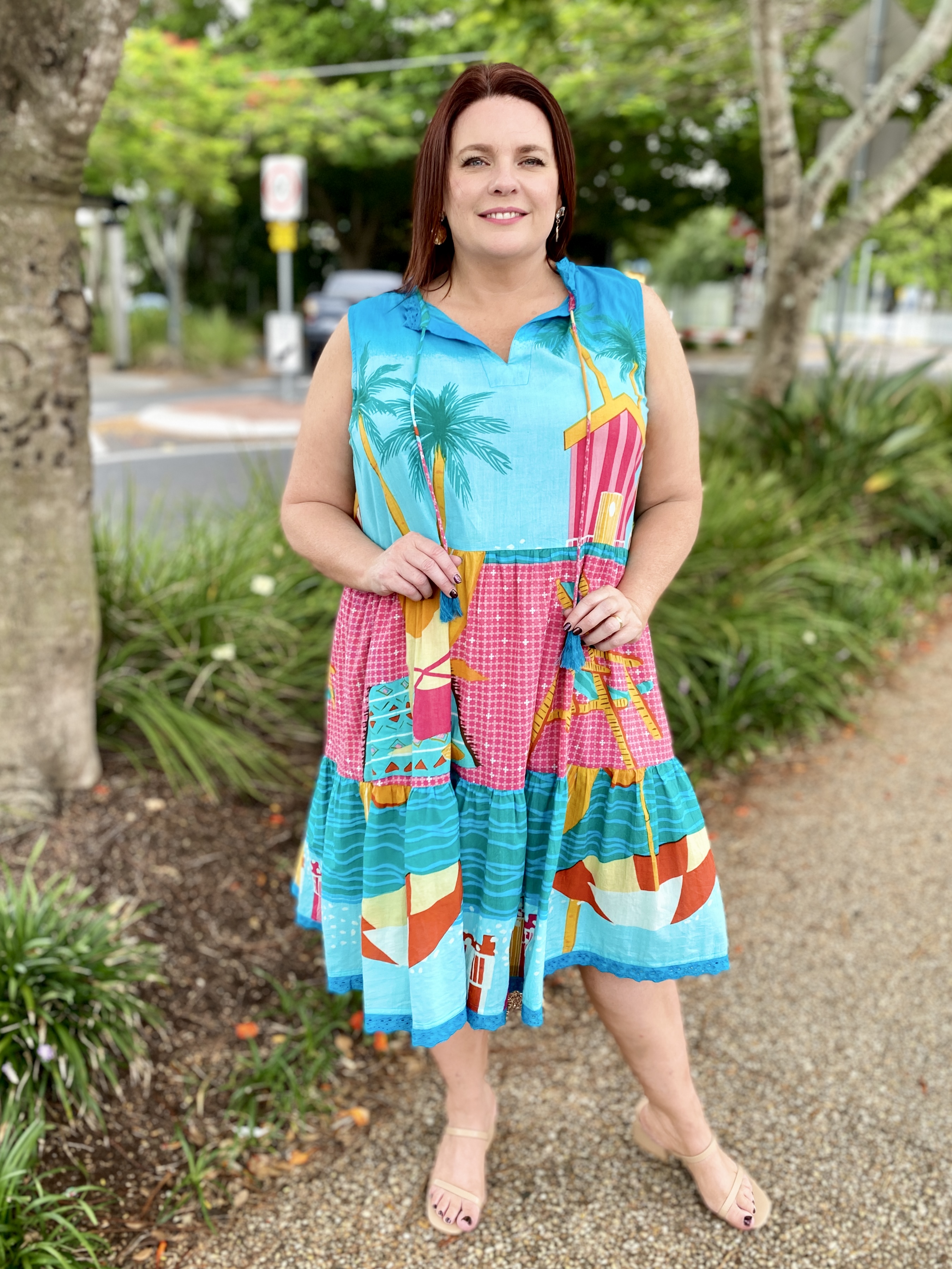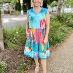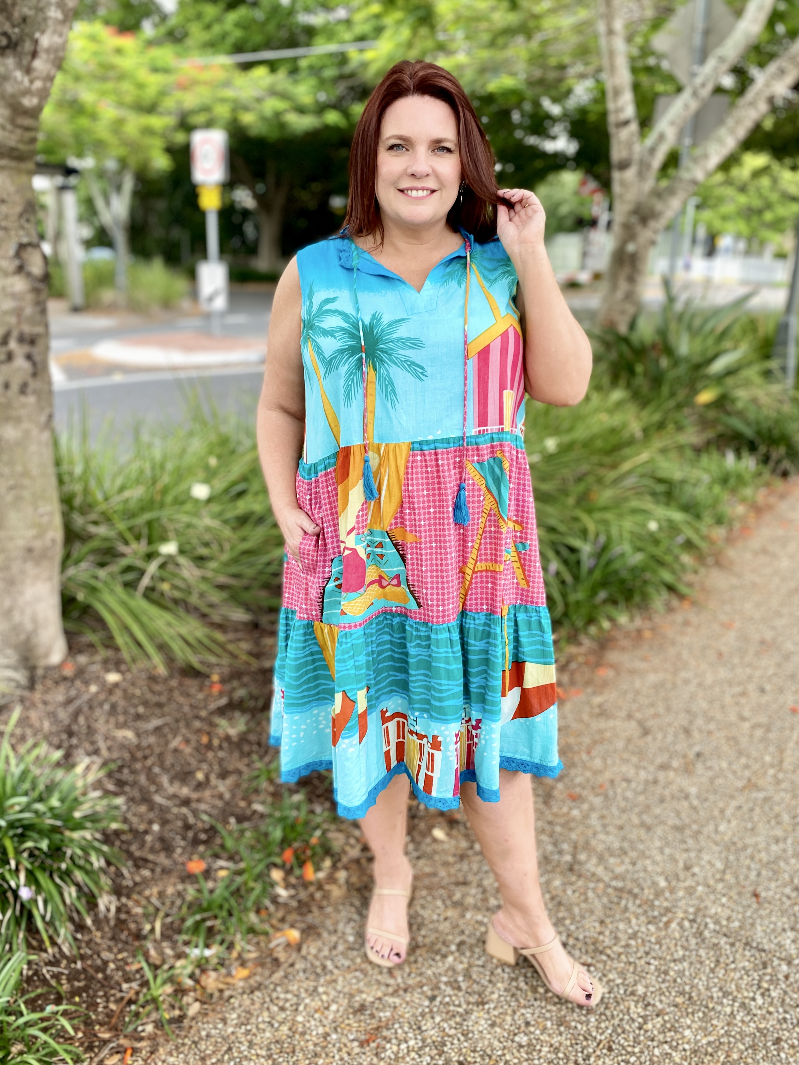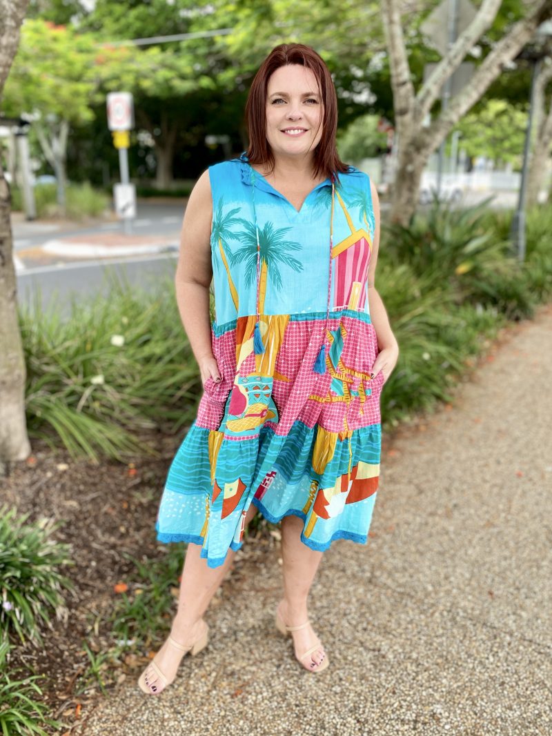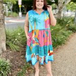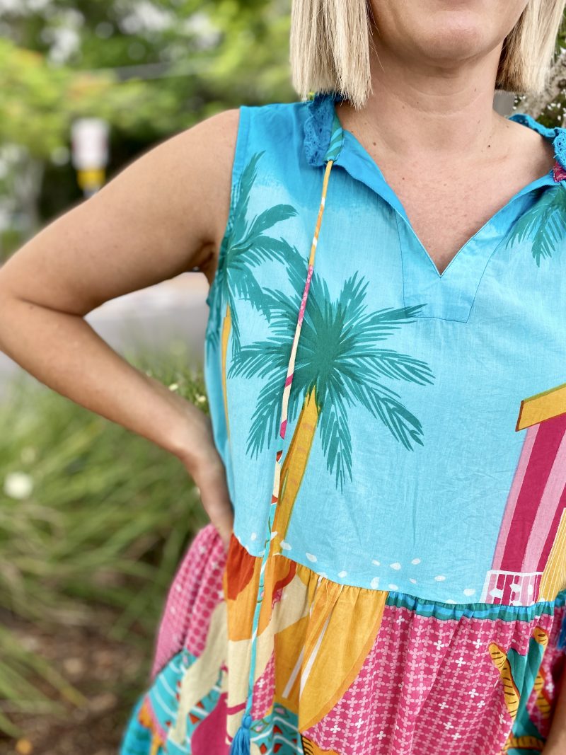 Bright, breezy, and beautifully detailed, the Seraphina S/L Dress is the perfect warm-weather go-to. Made from 100% cotton voile, it feels feather-light, breathable, and effortlessly comfortable. The adjustable neckline with tie and tassels adds a playful touch, while the tiered and gathered design gives the dress soft movement and relaxed charm. Practical side pockets, a flattering knee-length cut, and delicate lace hem edging complete the look. Finished in a vibrant digital print and proudly designed in Australia, this sleeveless dress is ideal for sunny days, holidays, and easy weekend style.