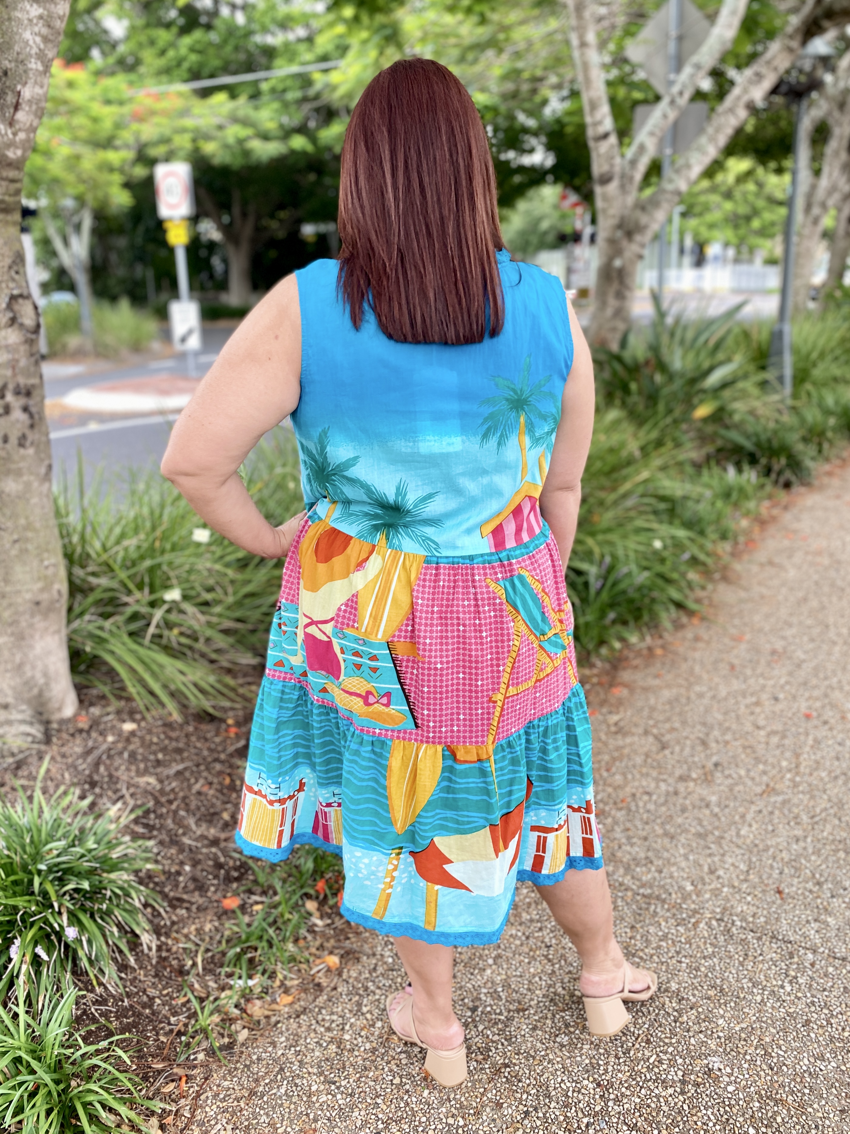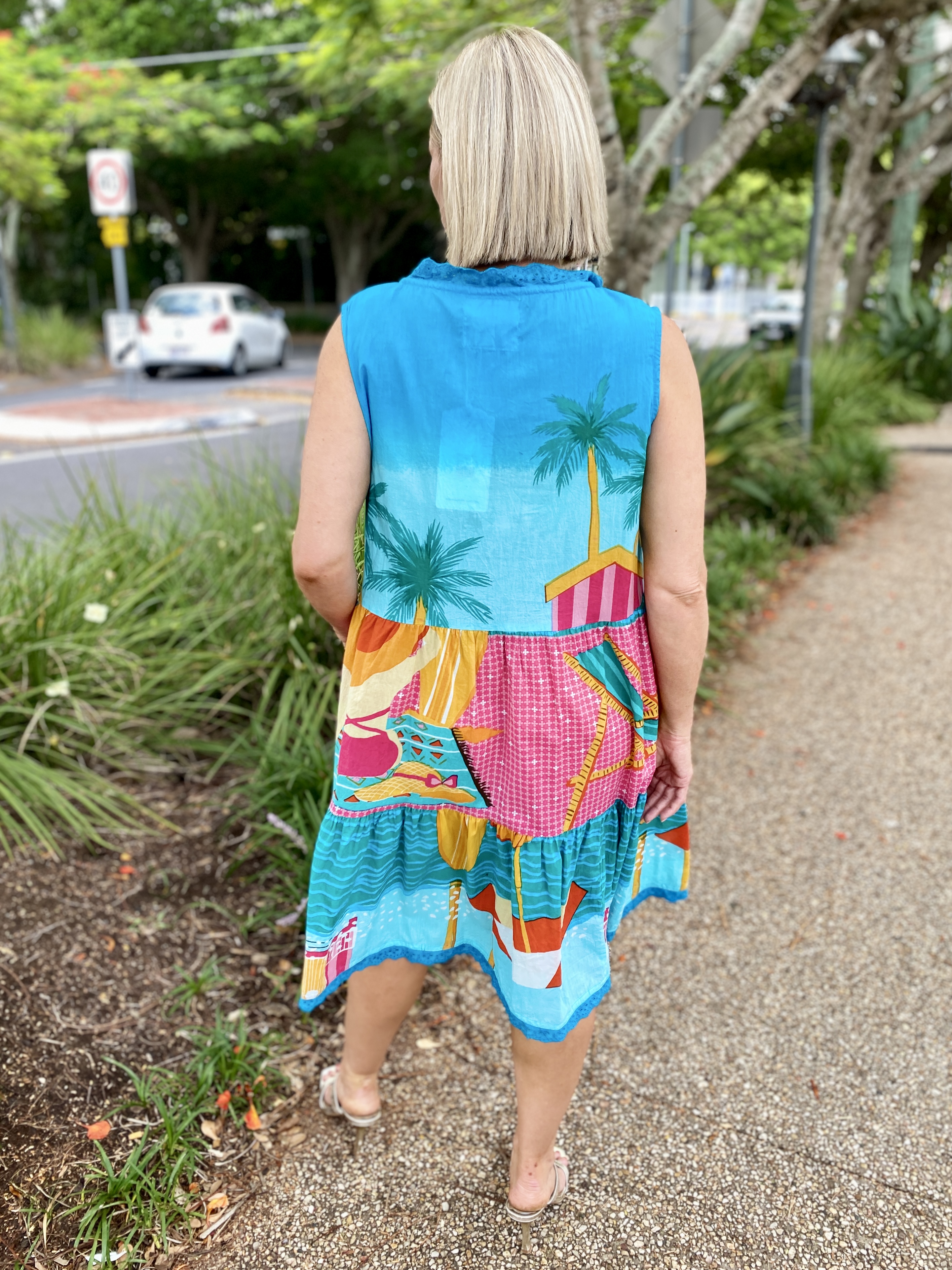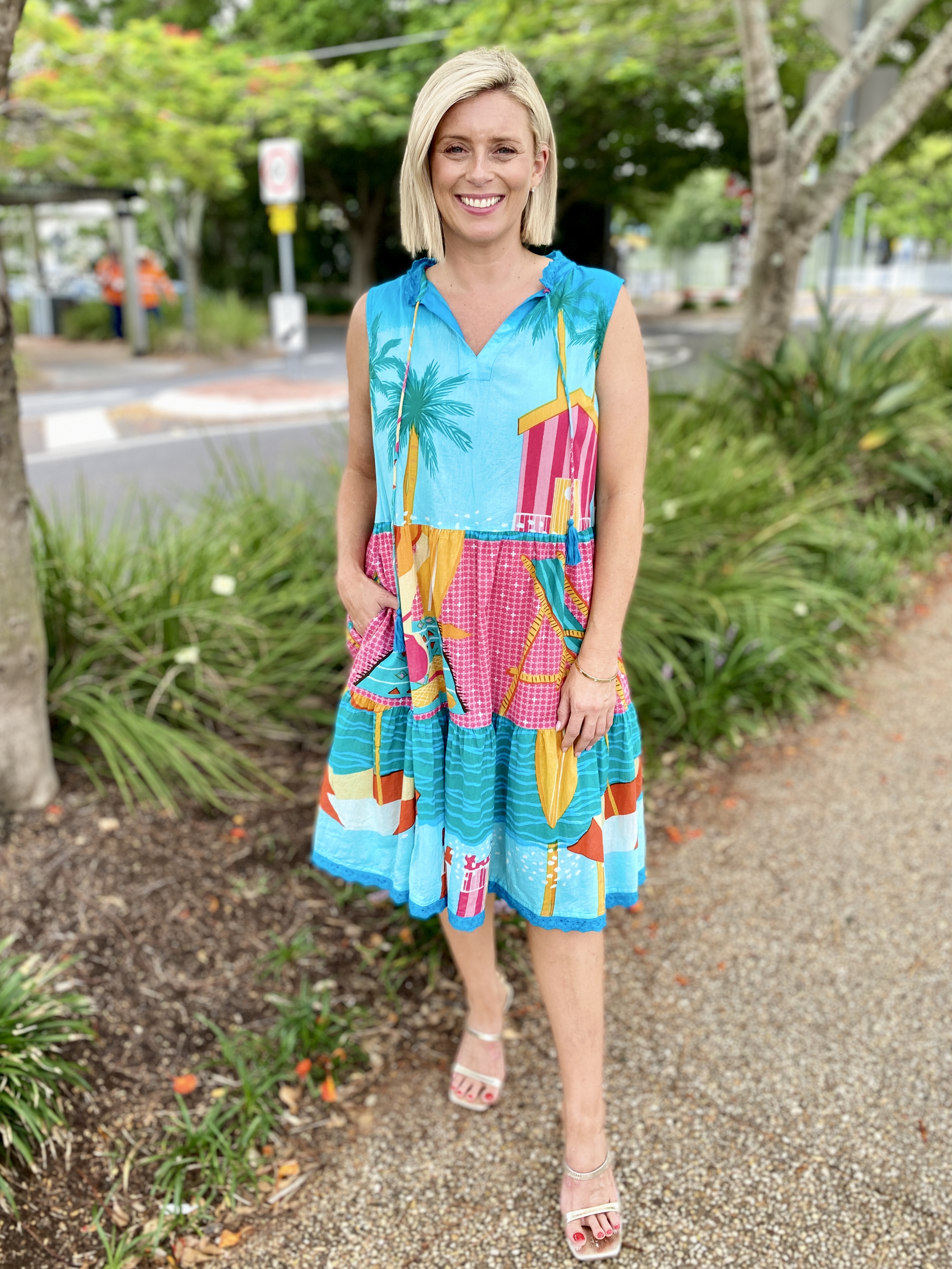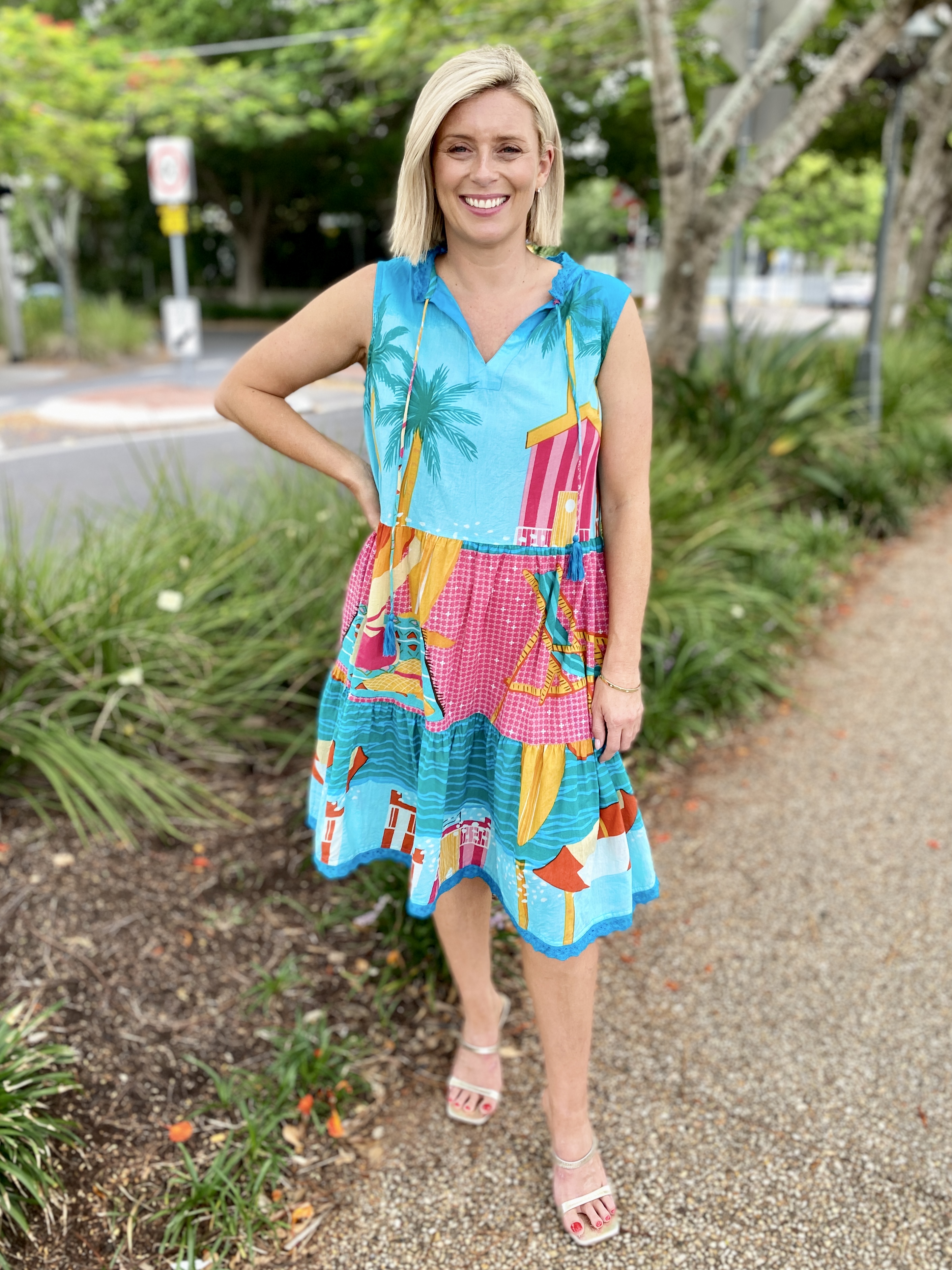 Bright, breezy, and beautifully detailed, the Seraphina S/L Dress is the perfect warm-weather go-to. Made from 100% cotton voile, it feels feather-light, breathable, and effortlessly comfortable. The adjustable neckline with tie and tassels adds a playful touch, while the tiered and gathered design gives the dress soft movement and relaxed charm. Practical side pockets, a flattering knee-length cut, and delicate lace hem edging complete the look. Finished in a vibrant digital print and proudly designed in Australia, this sleeveless dress is ideal for sunny days, holidays, and easy weekend style.