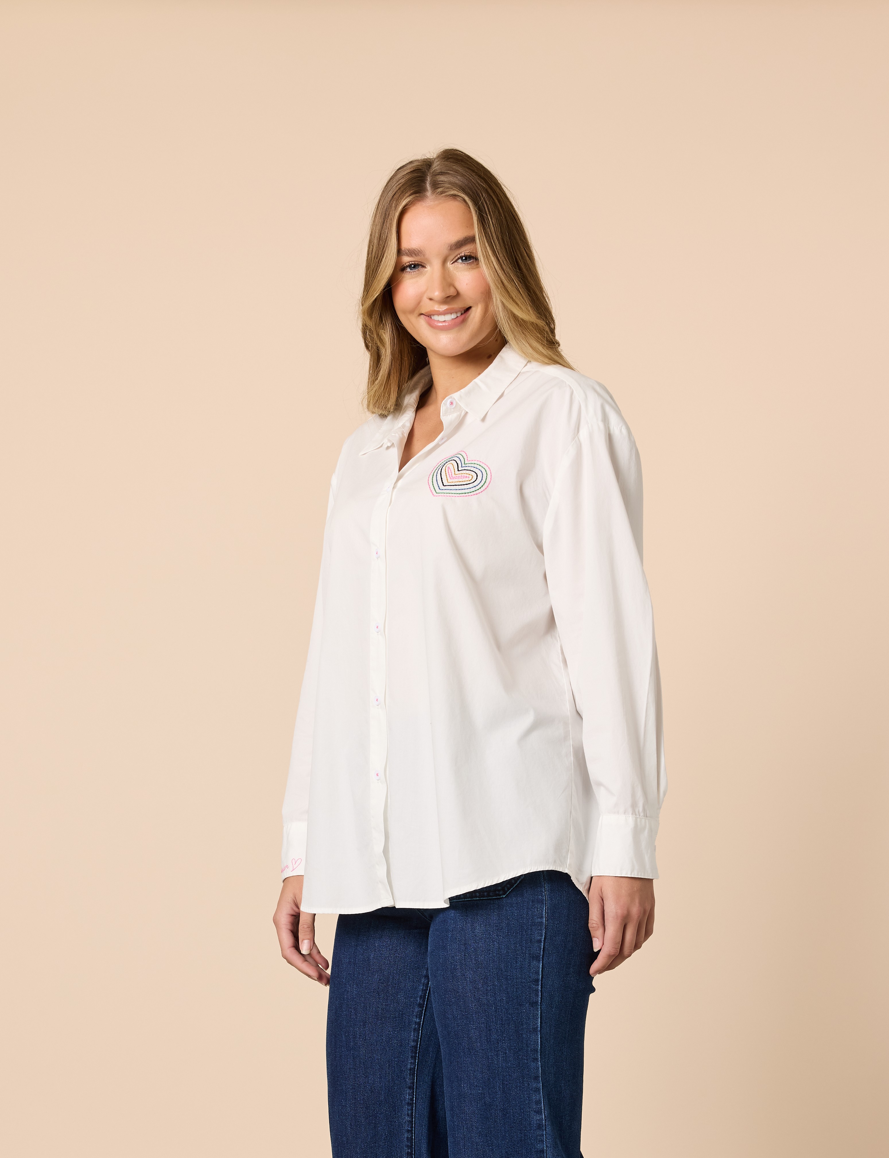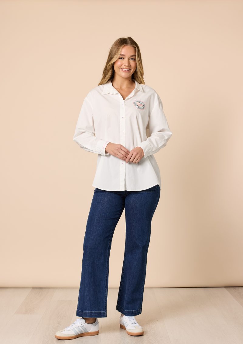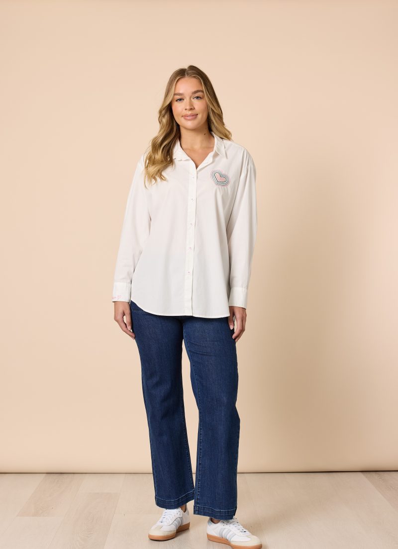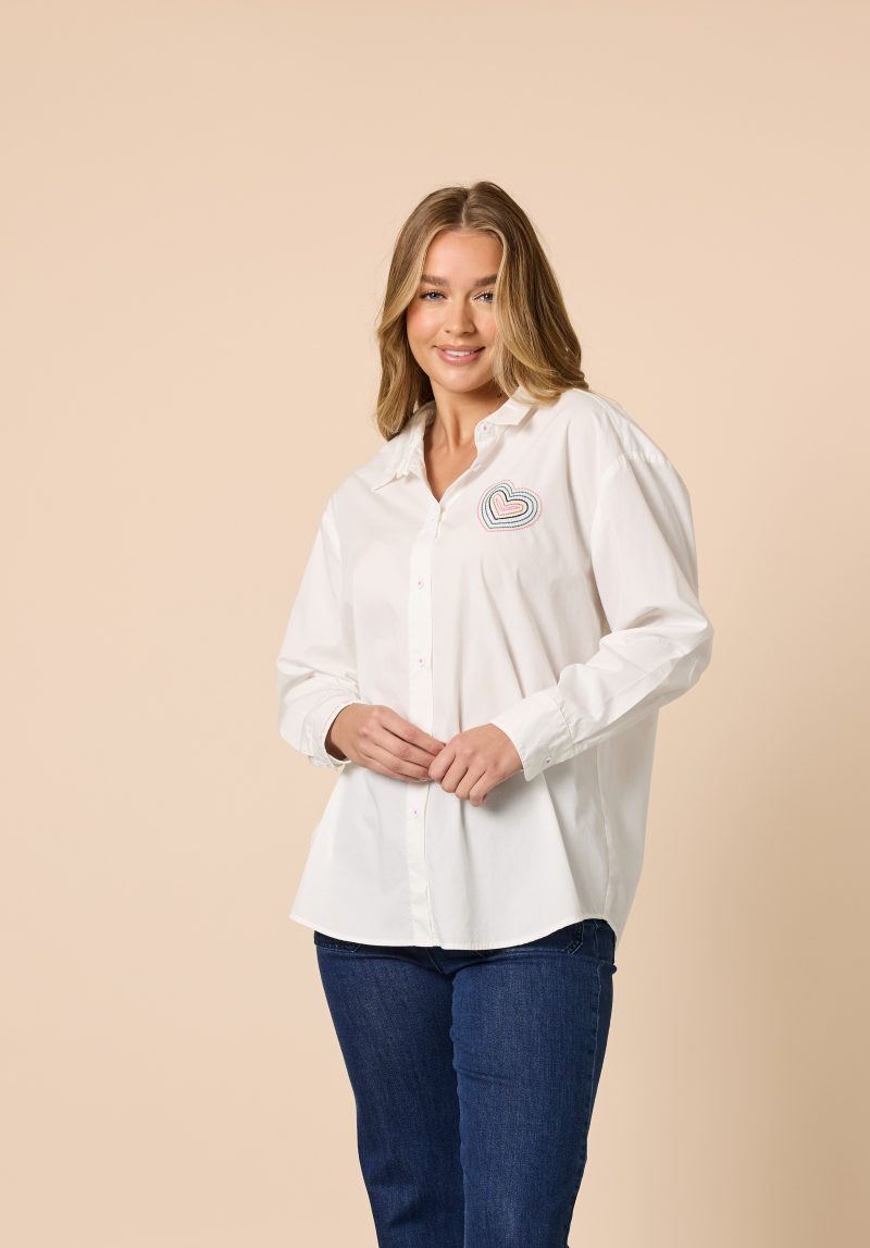 Add a playful touch to your wardrobe with the Sweetheart Embroidered Shirt, a classic button-up with a charming twist. Crafted from crisp 100% cotton, this shirt features a beautifully stitched multicolour heart motif on the chest and delicate l’amour embroidery on the sleeve cuff, subtle details that make it feel truly special.