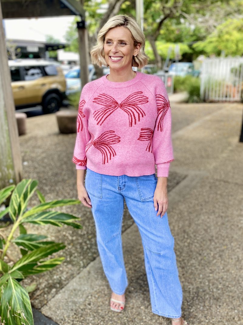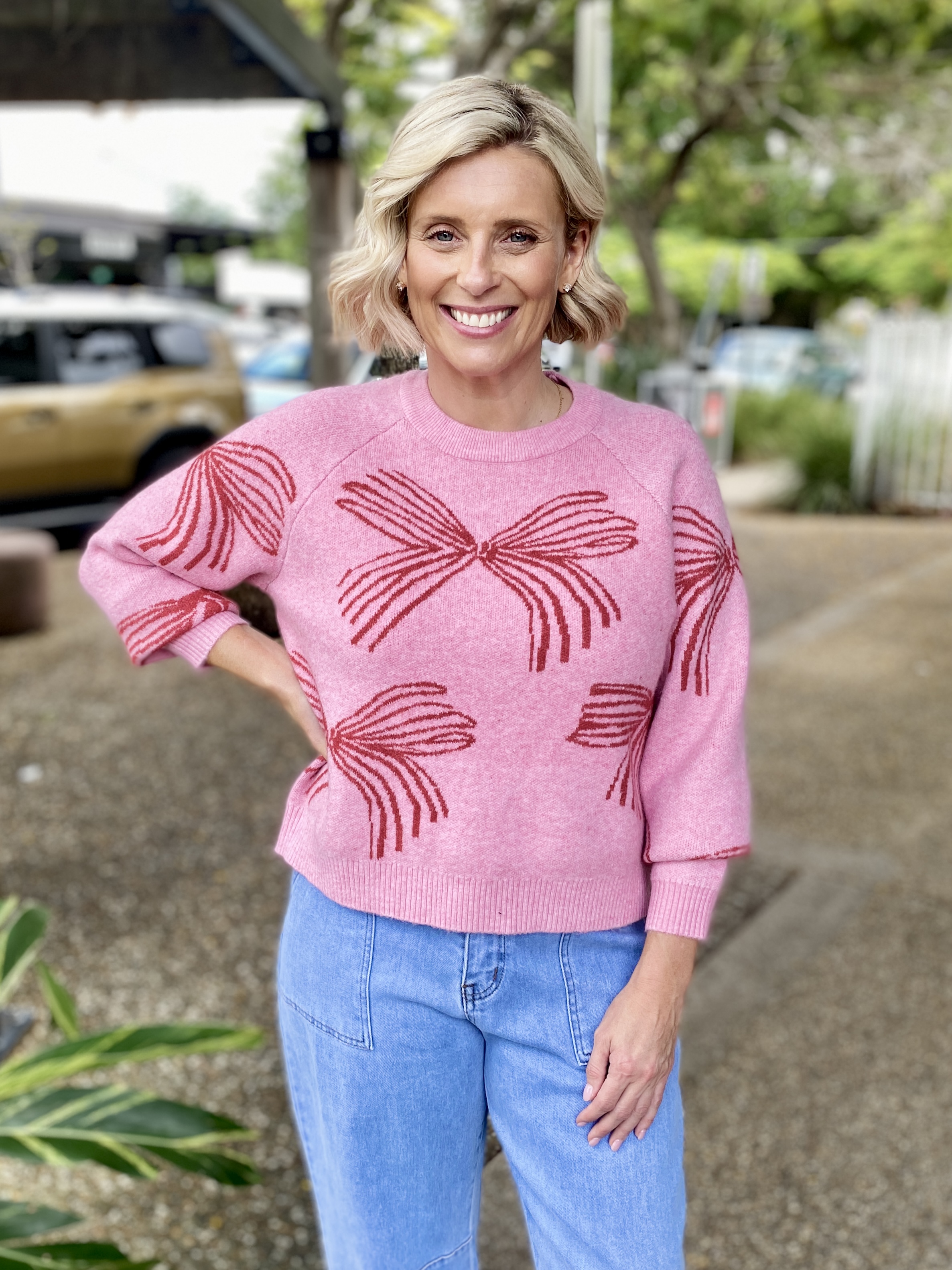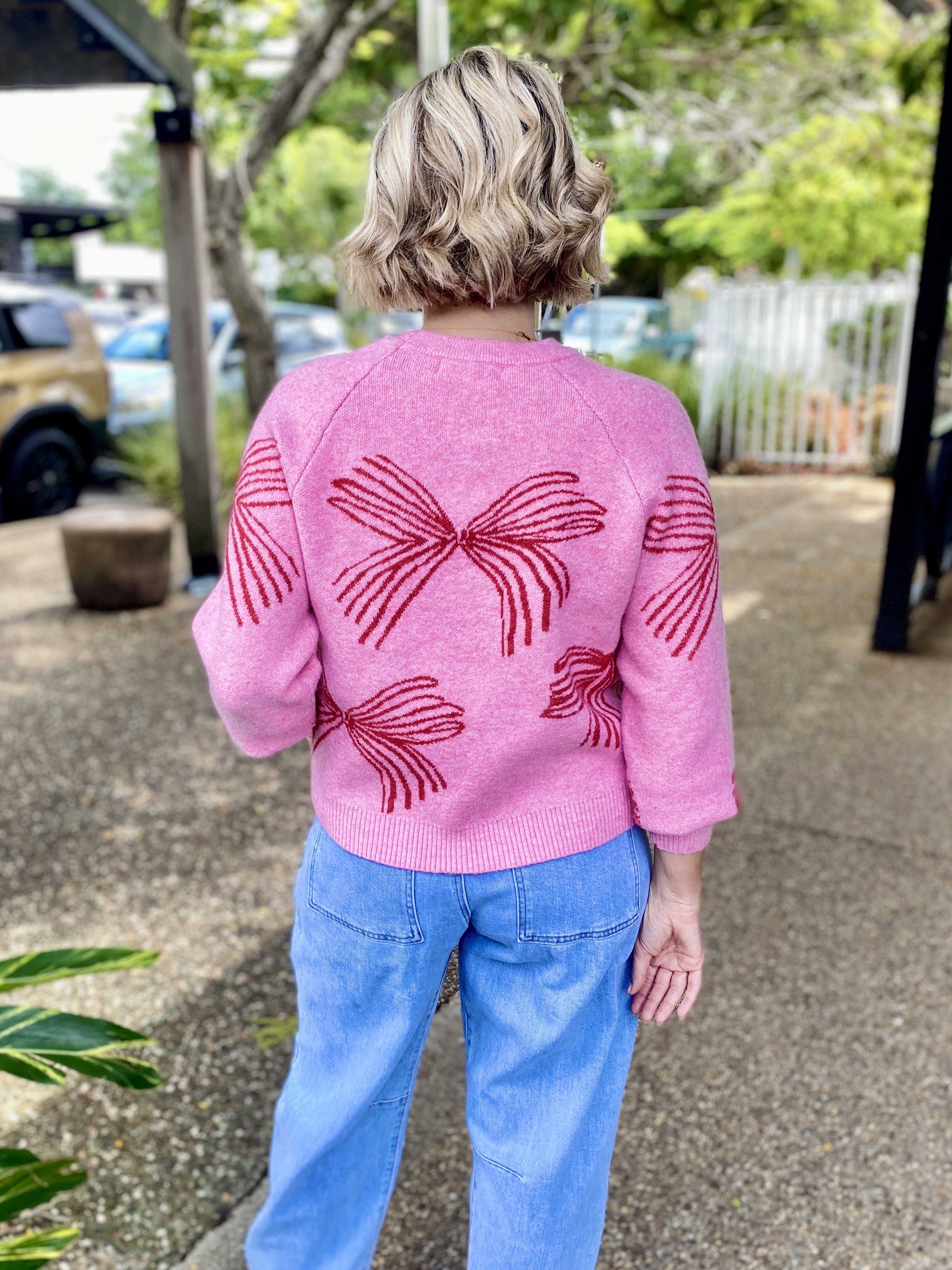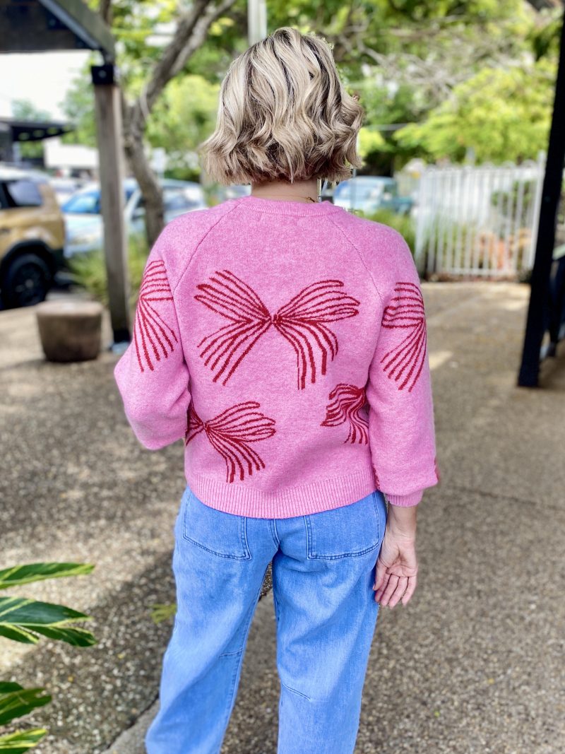The Yuko Ribbon Knit in Pink with Red Bows brings a playful yet polished touch to your knitwear collection. Designed in a pink base with statement red bow detailing, this cosy style blends charm with everyday versatility.